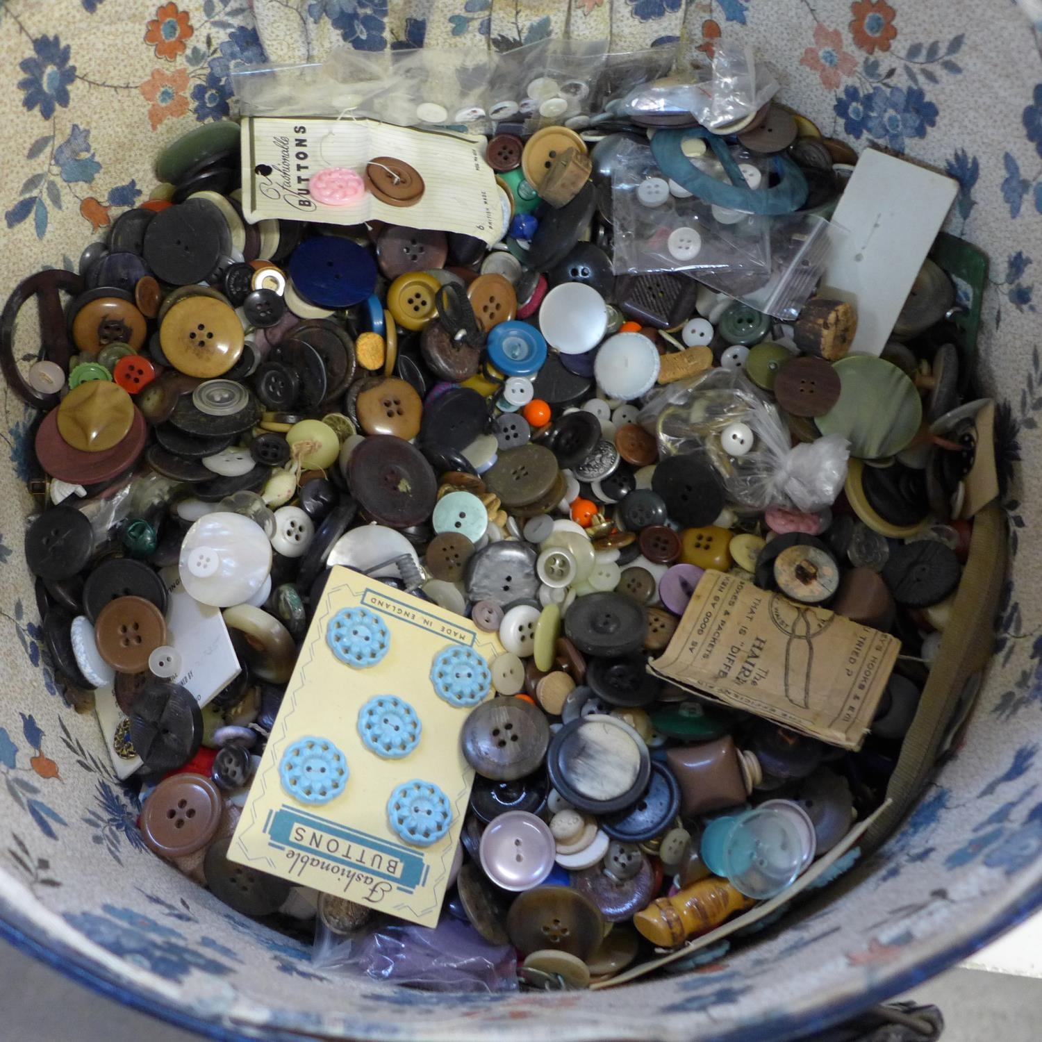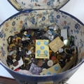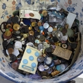 A collection of buttons in a box including vintage