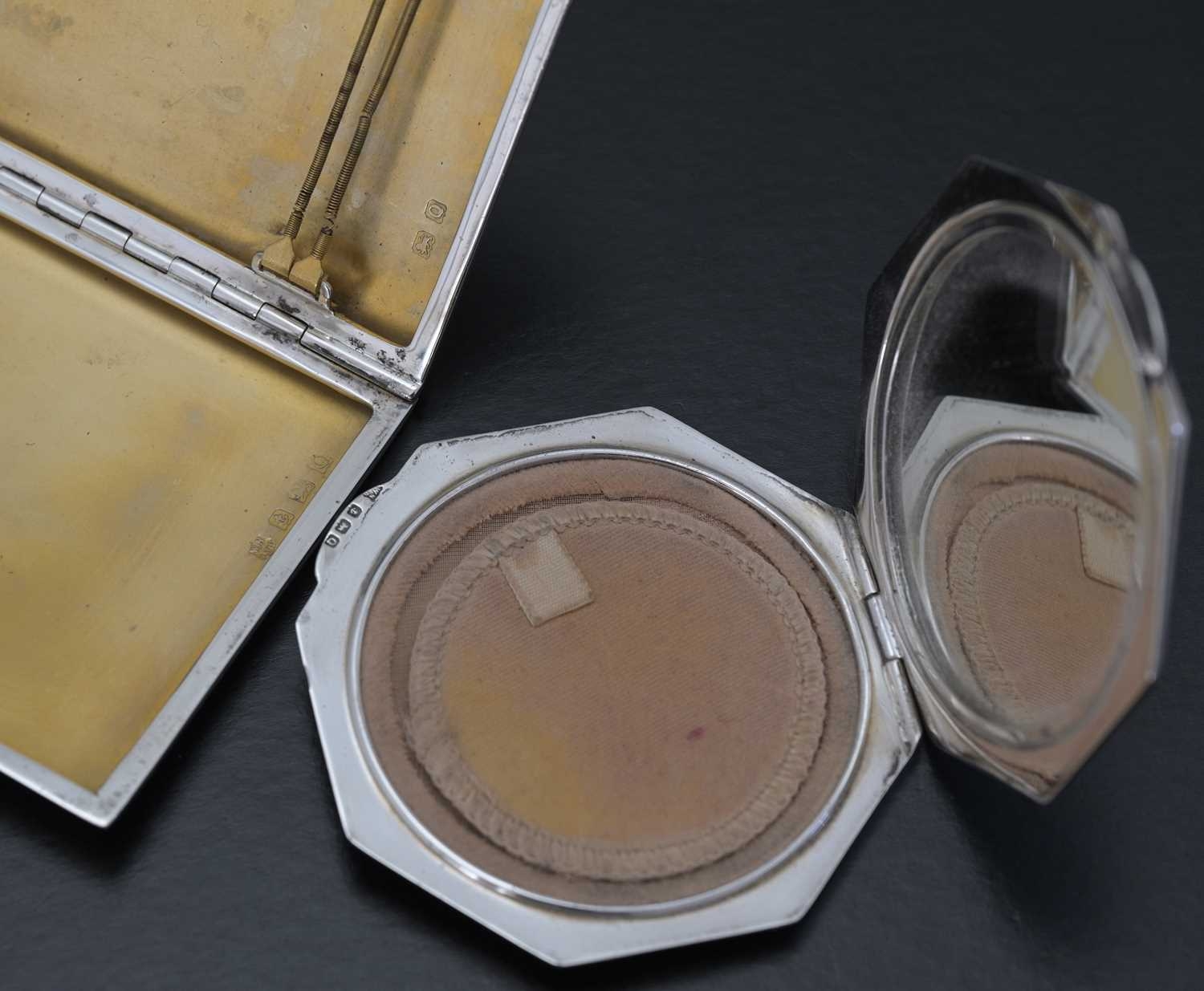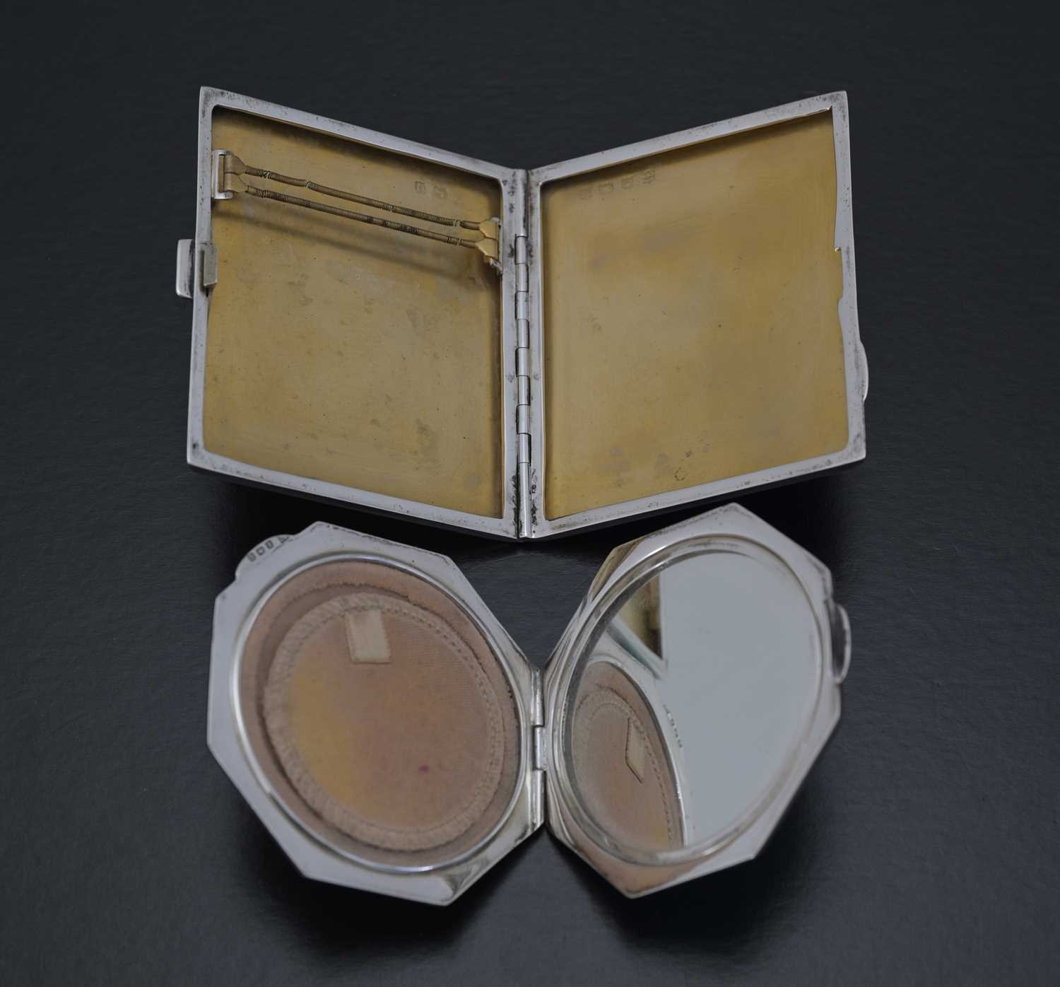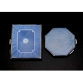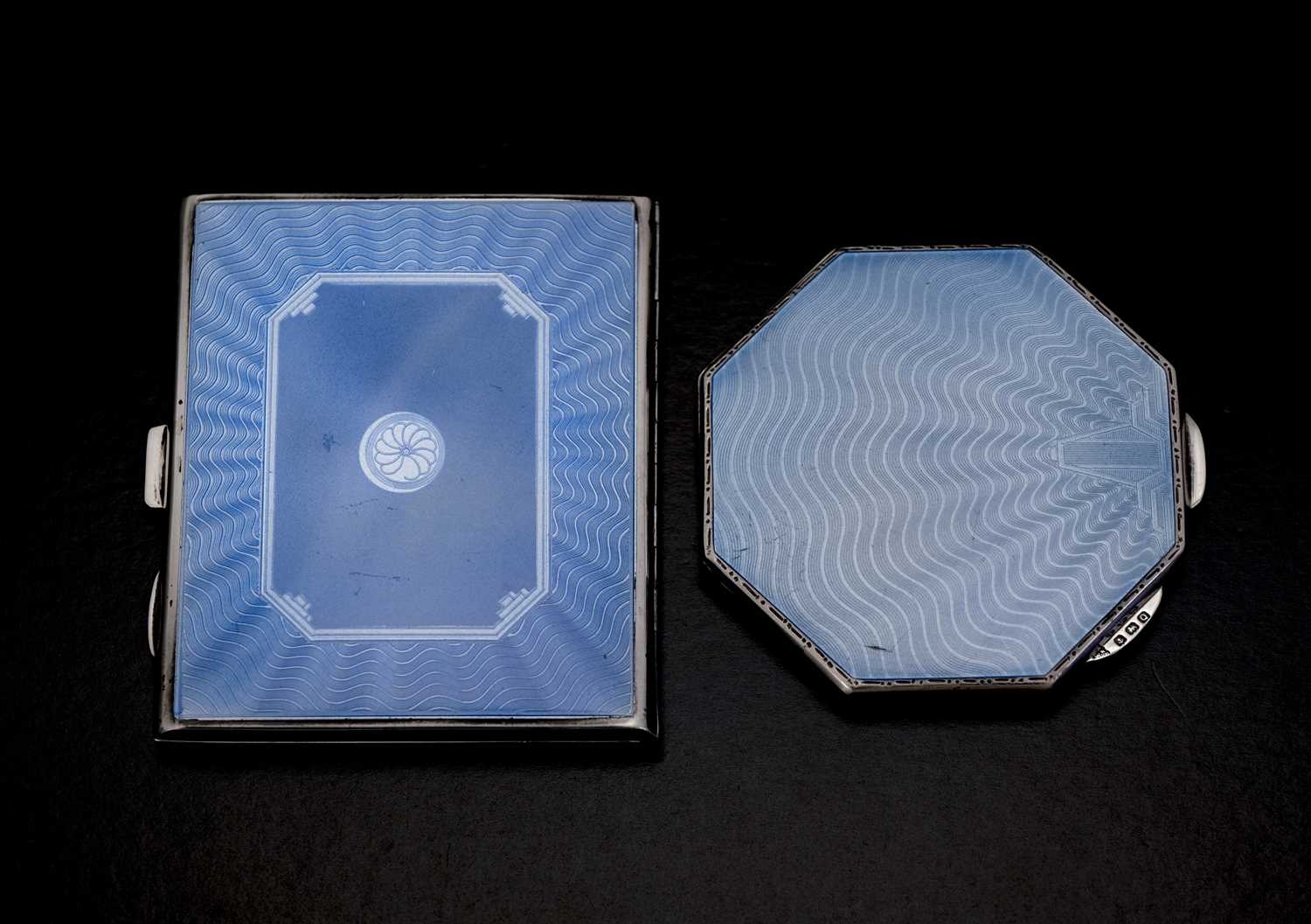 Two George VI Art Deco silver and enamel pieces, both by Willian Neale Ltd., Birmingham 1940, to include a cigarette case, length 8.1cm, and a hallmarked compact, each decorated with blue guilloche enamel (2)