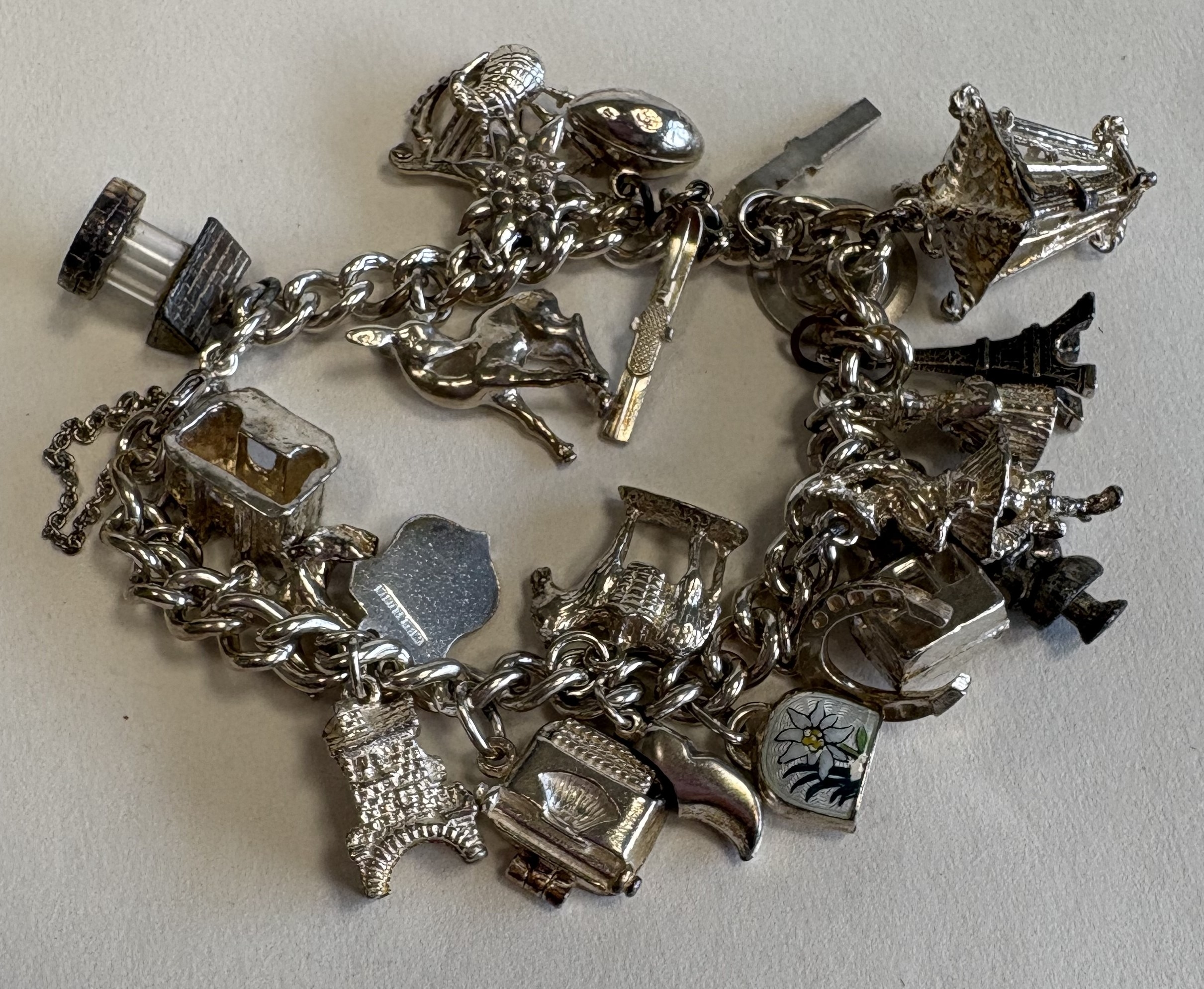 A silver curb link charm bracelet. Approx. 74 grams. Est. £80 - £120.