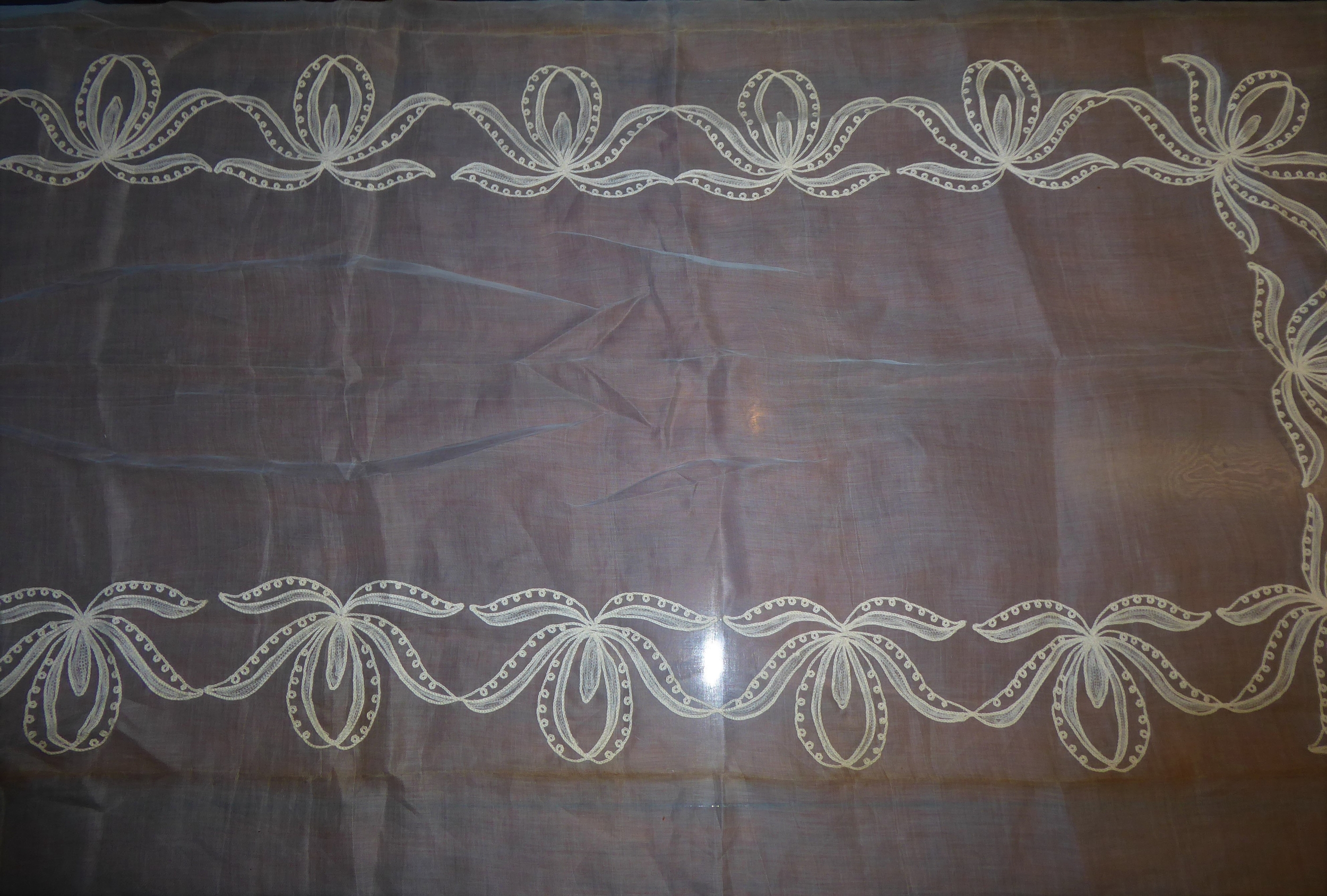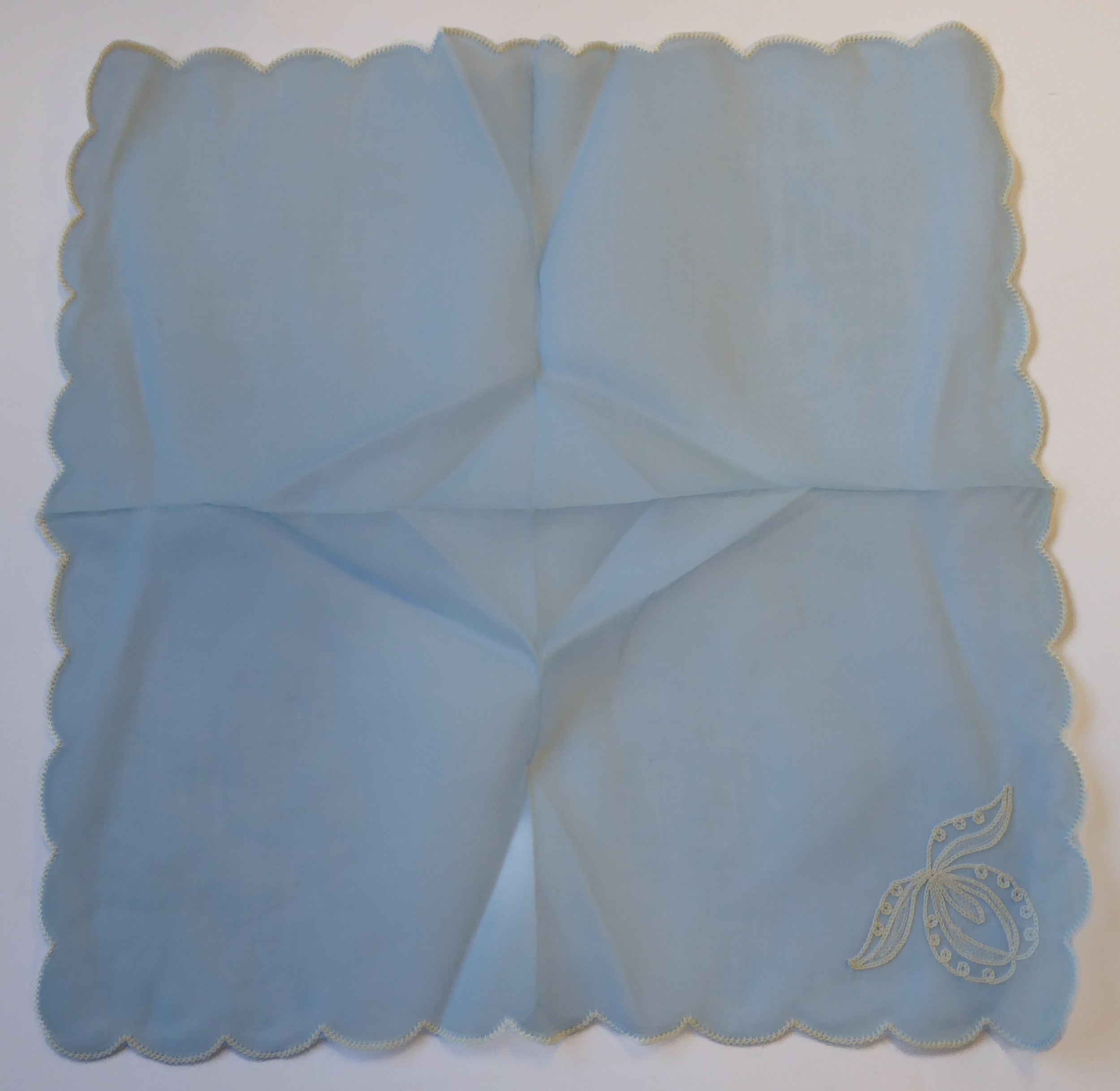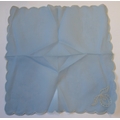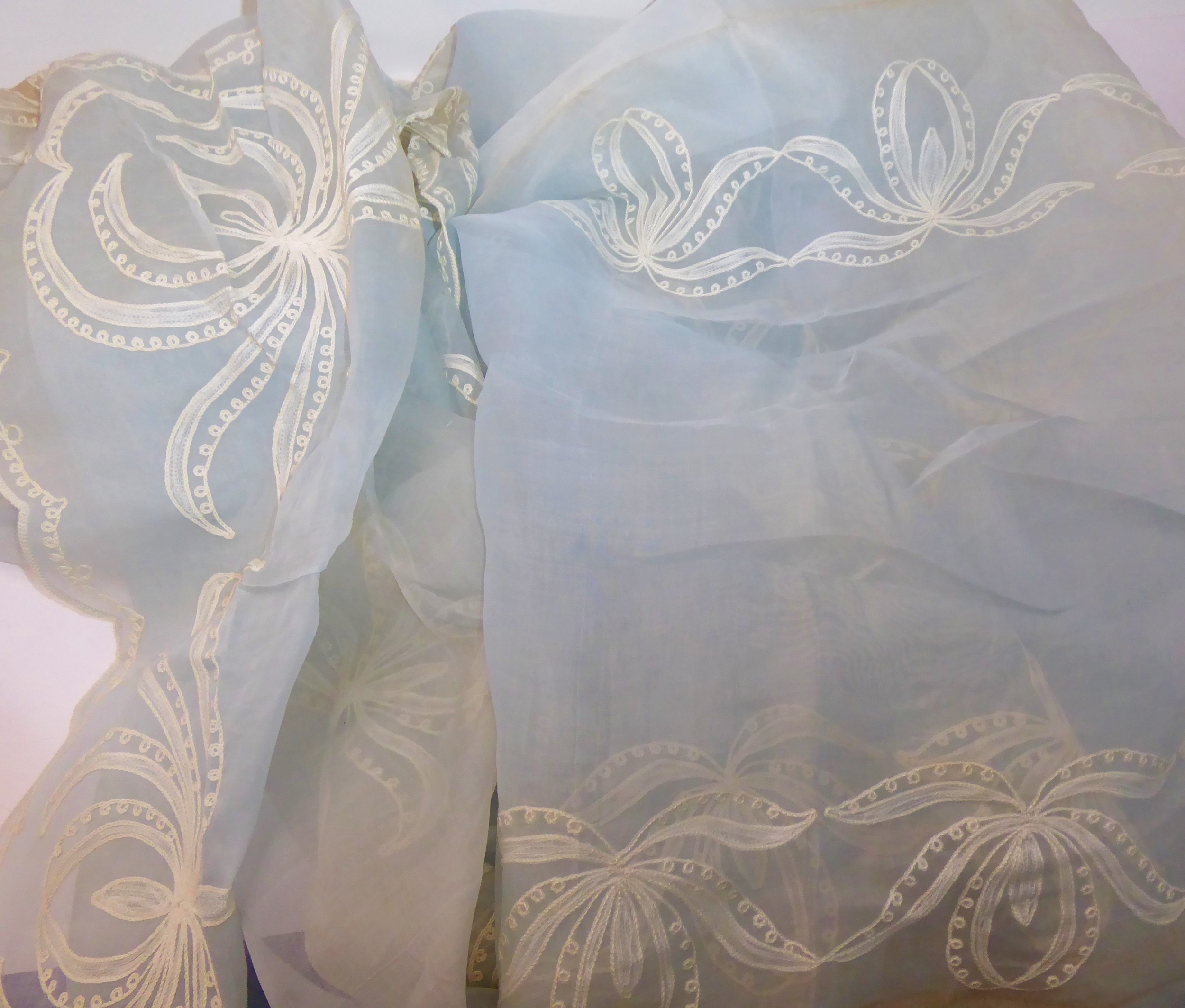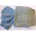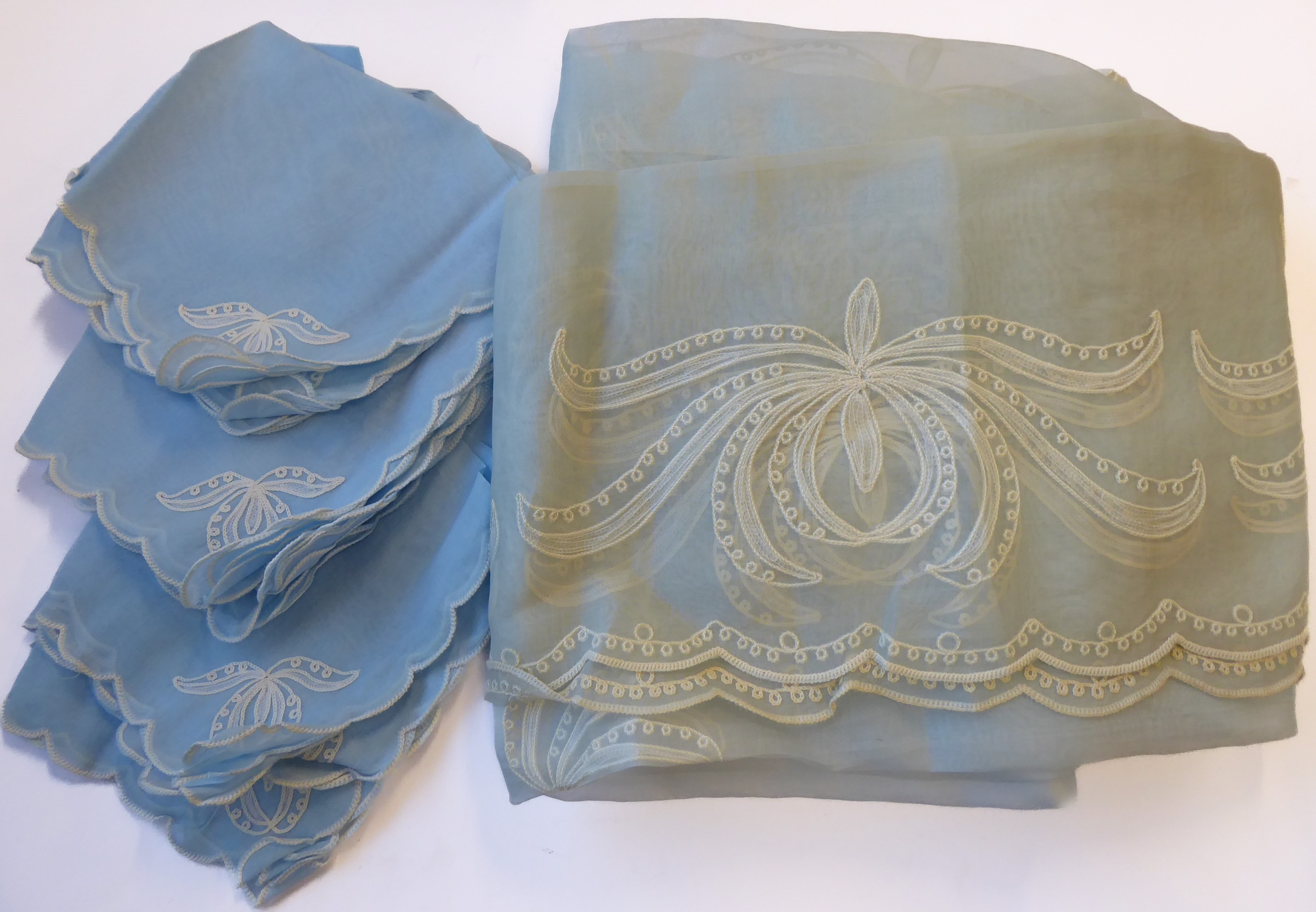 A powder-blue embroidered chiffon-effect tablecloth and 12 matching napkins (tablecloth 267cm x 166cm; napkins 44cm square). Napkins in good condition, tablecloth slightly faded and some grubby marks.