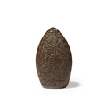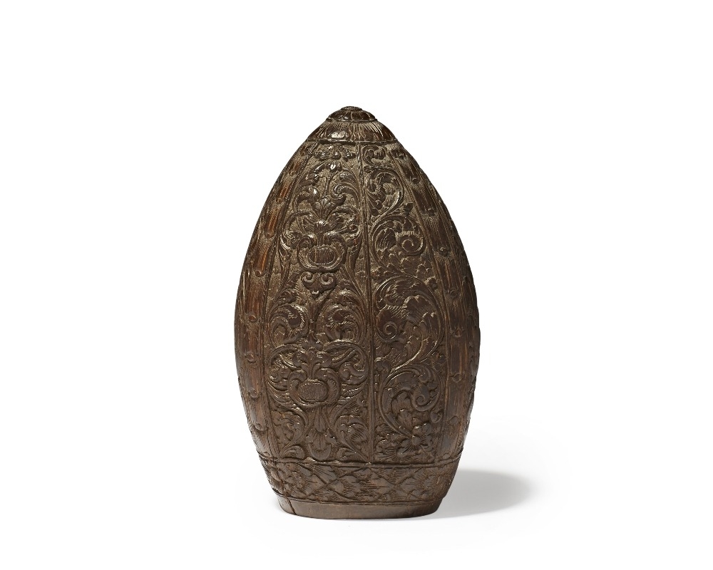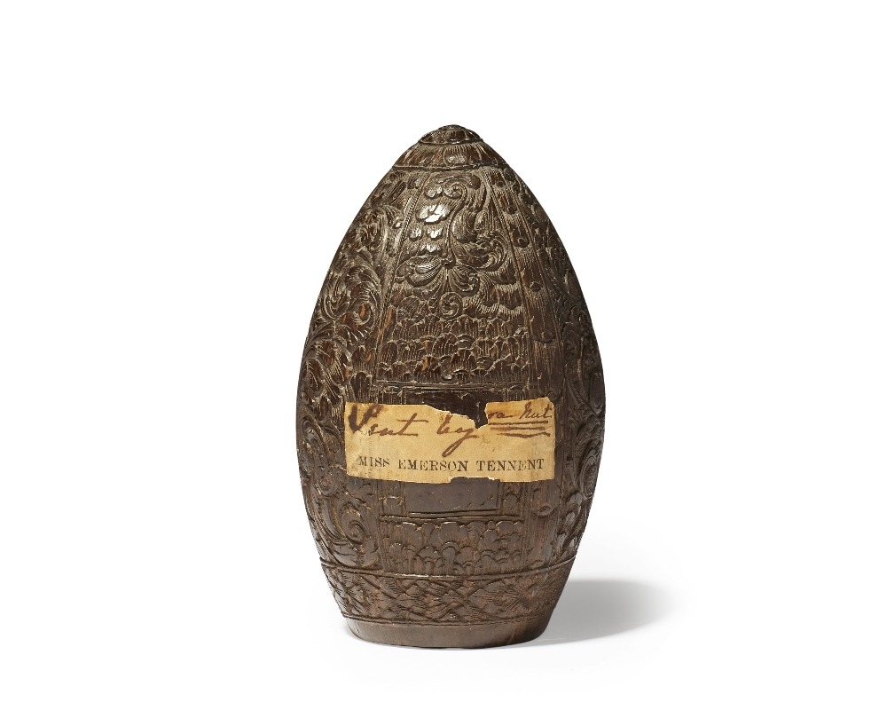 An ogival and hollowed carved endocarp of an unknown fruit, 19th / 20th century, the floral and leaf decoration consisting of scroll works and sprays arranged in vertical panels, old label " ...?...ra nut, Sent by Miss Emerson Tennent", 12.6cm high