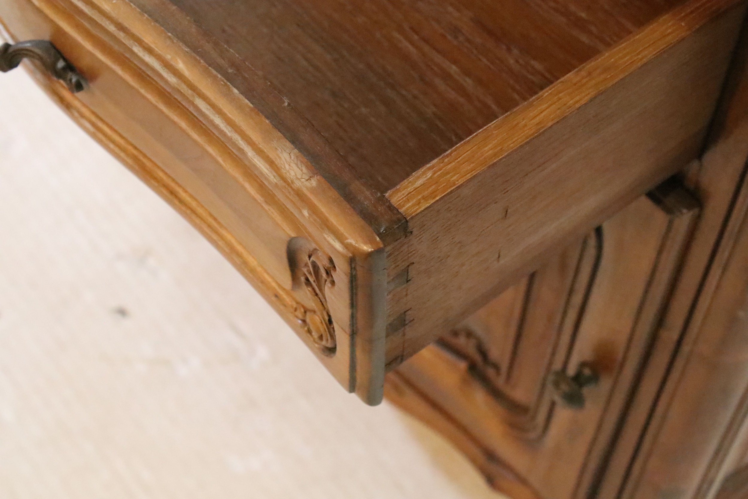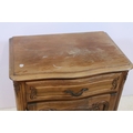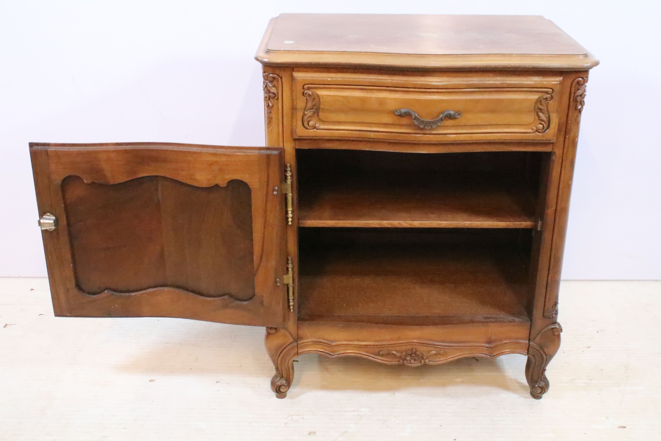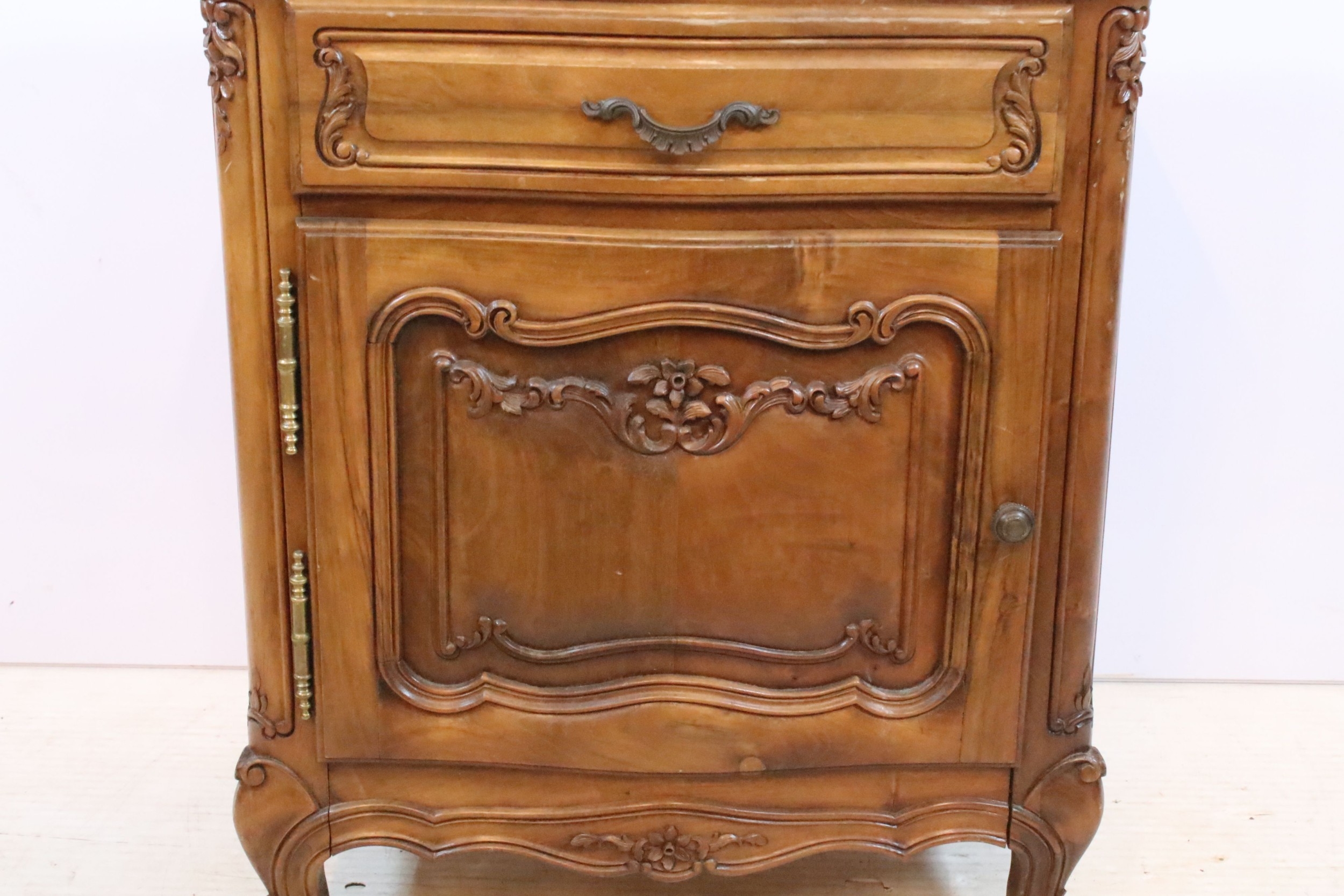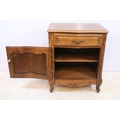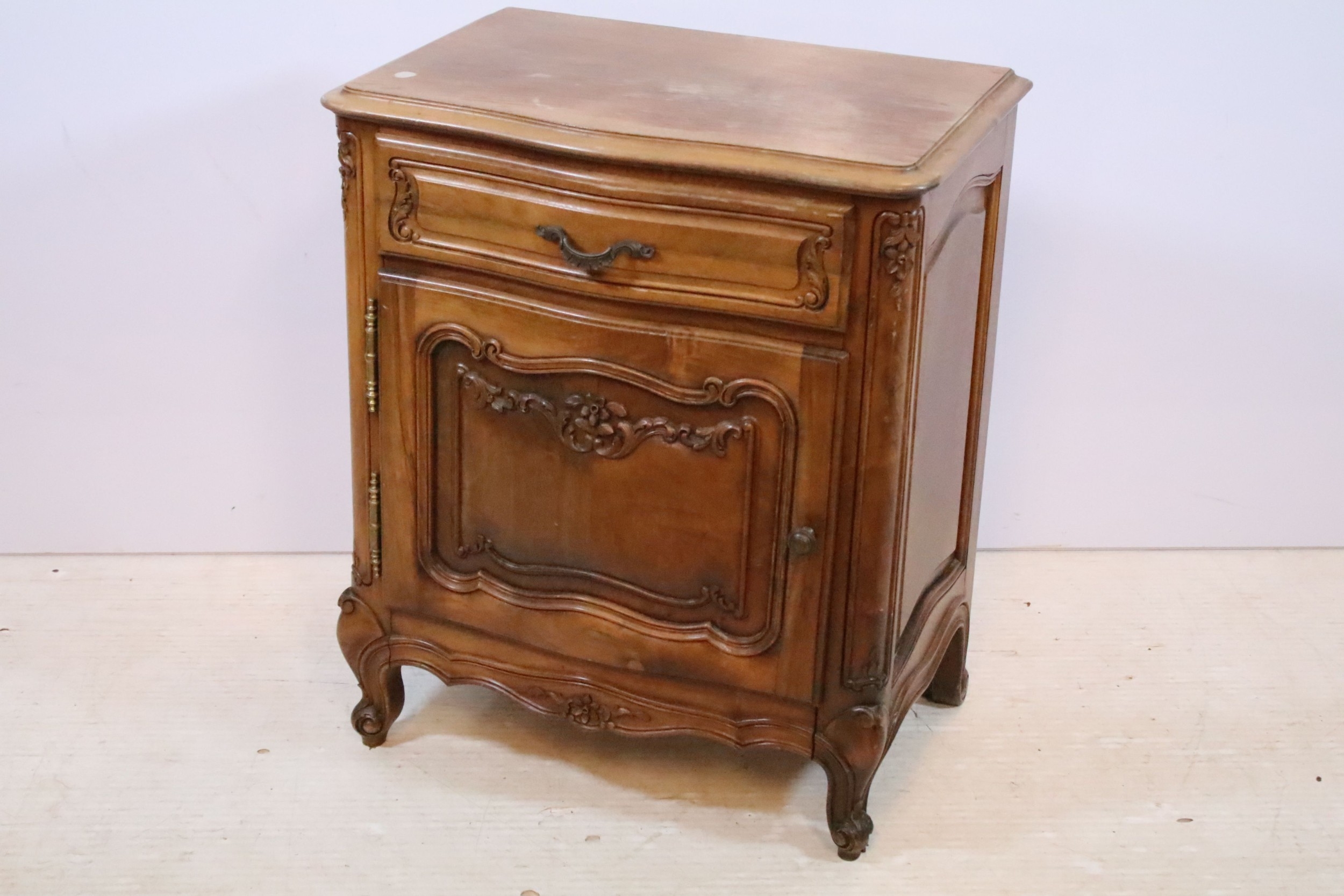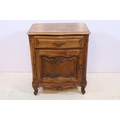 20th century French-style walnut bedside cabinet, having heavily moulded decoration to door and feet, W 55cm x D 39cm x H 66cm