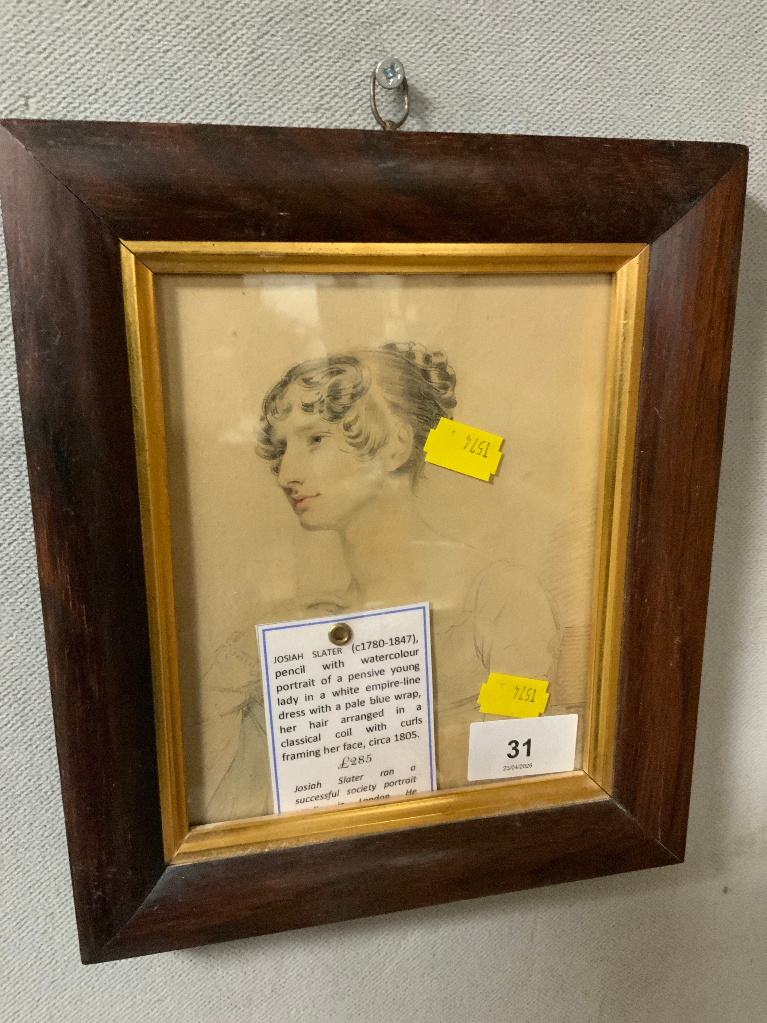 Josiah Slater (c.1780-1847) portrait of a Lady, pencil and watercolour, framed, 16.5 x 13 cm