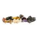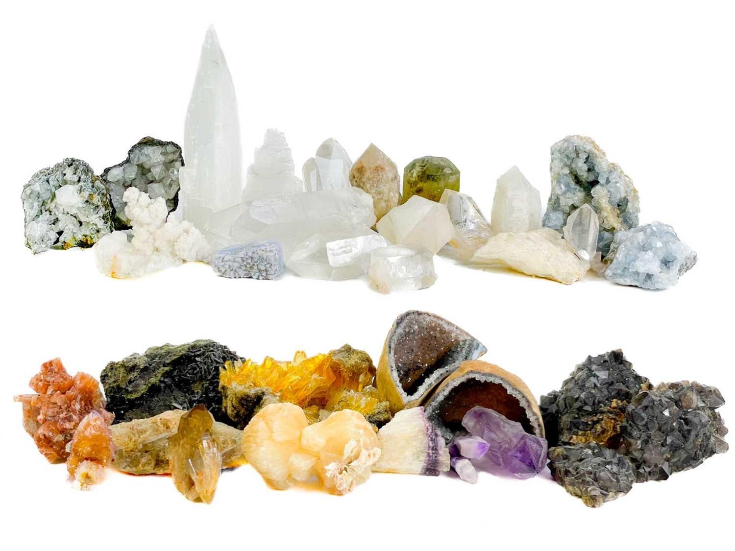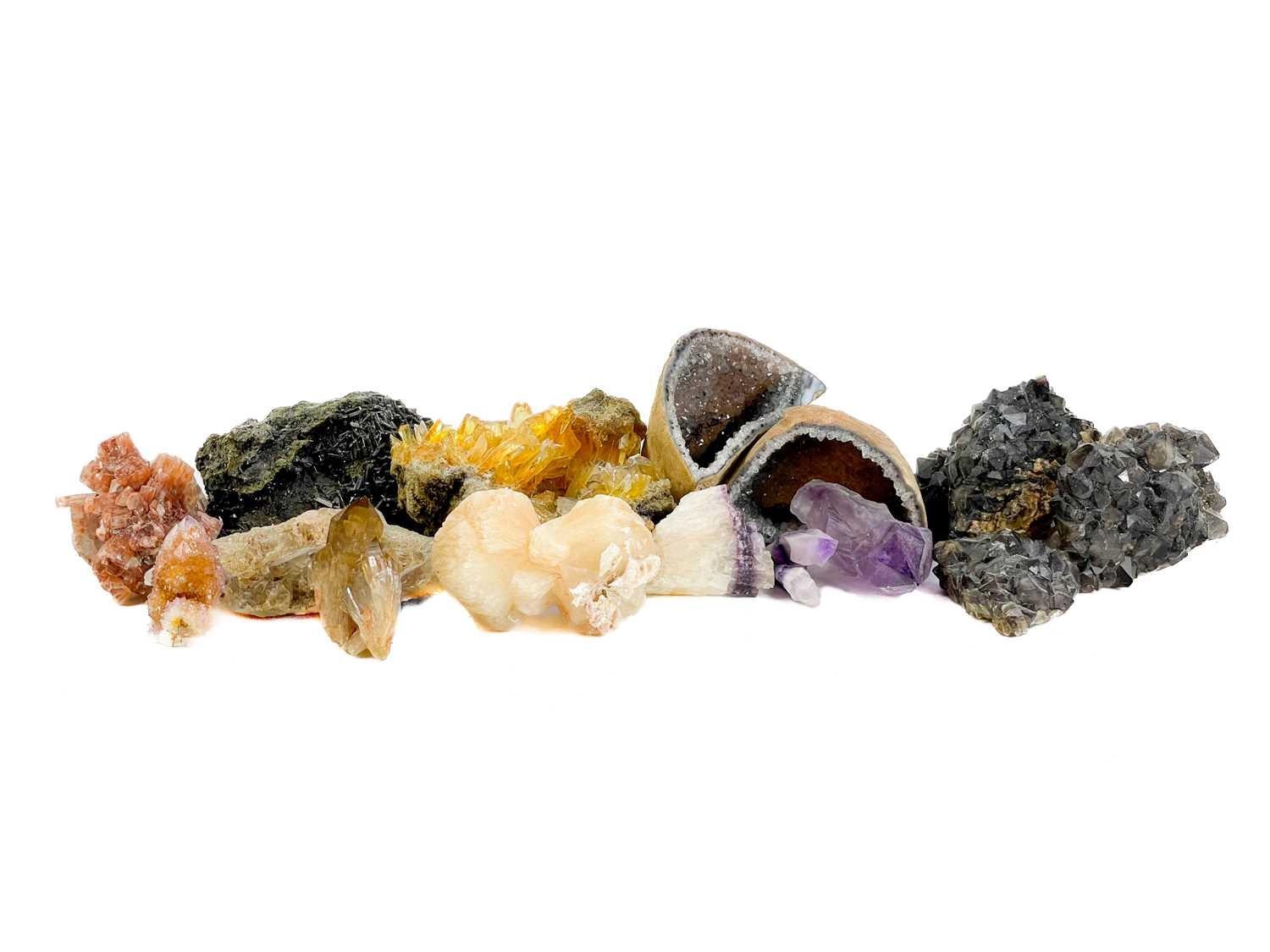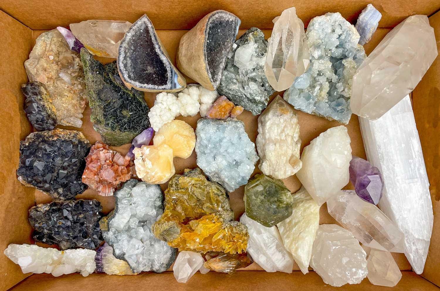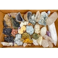 A collection of minerals. To include several large quartz points, a quartz geode, amethyst, and several other loose minerals.
