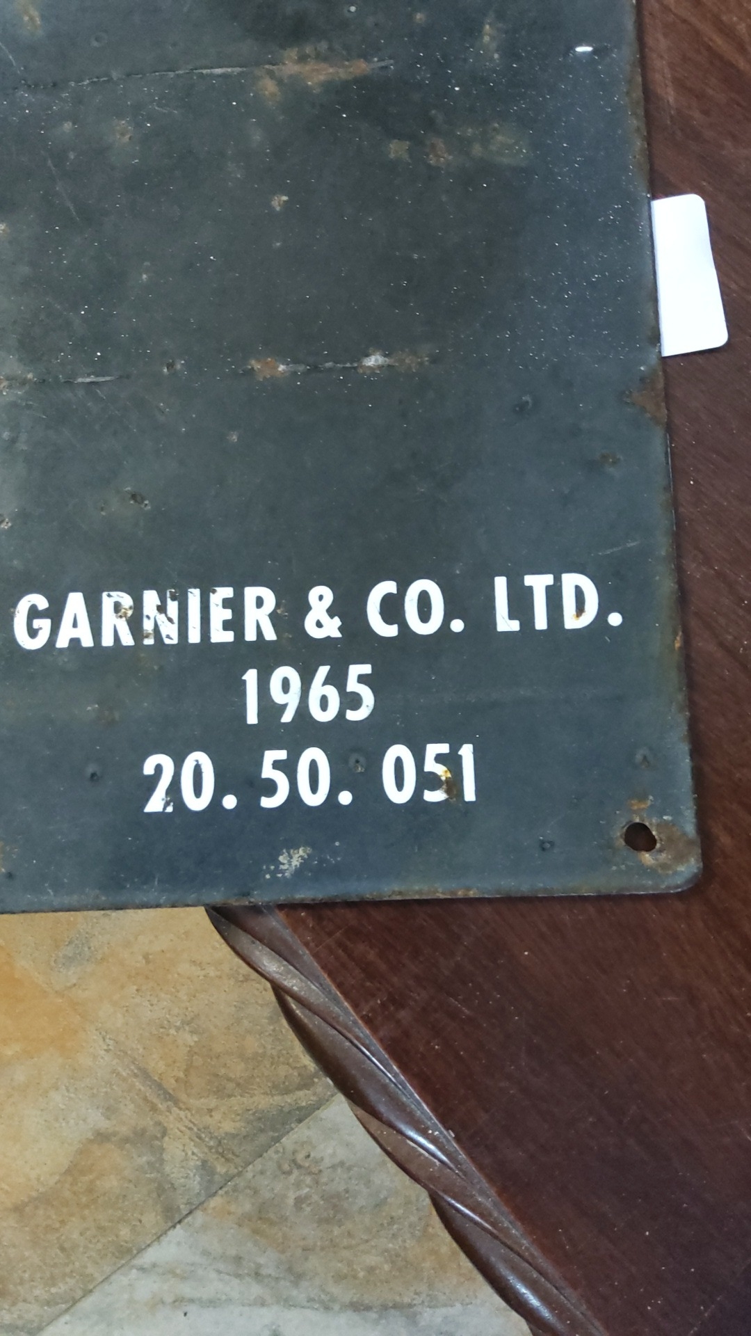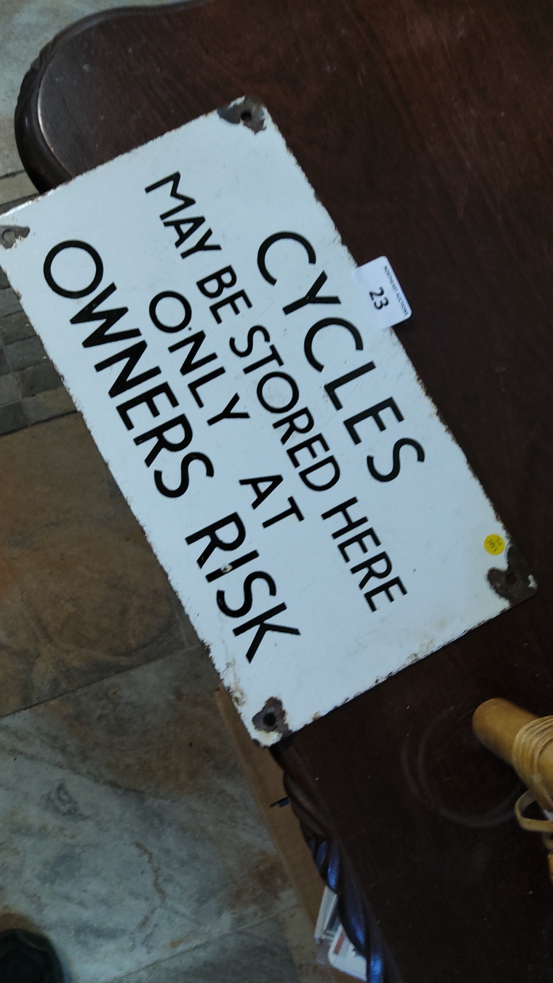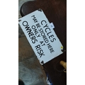 Vintage 1965 enamel sign “CYCLES MAY BE STORED HERE ONLY AT OWNER’S RISK”, the reverse“GARNIER & CO. LTD. 1965 20.50.051”, with corner fixing holes.