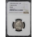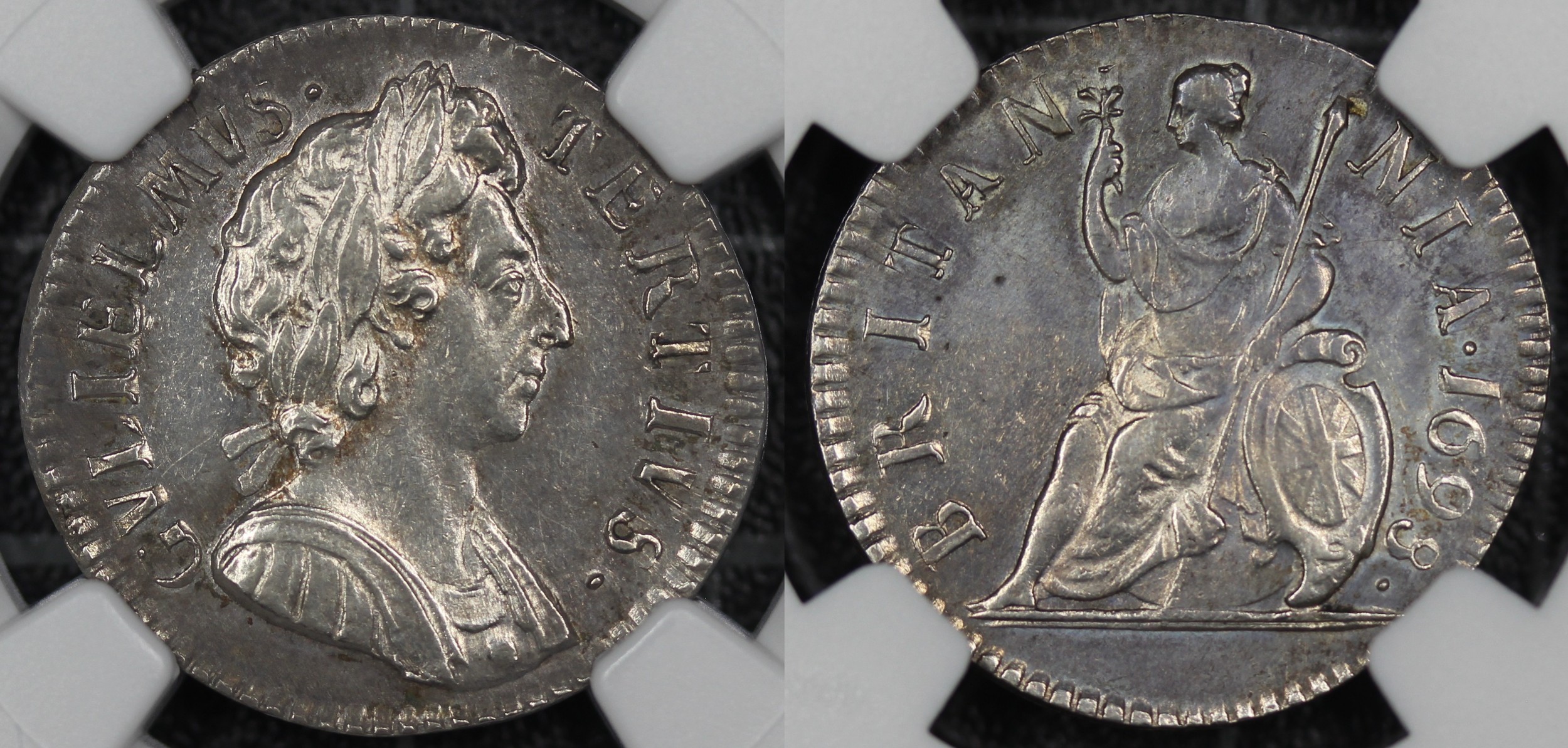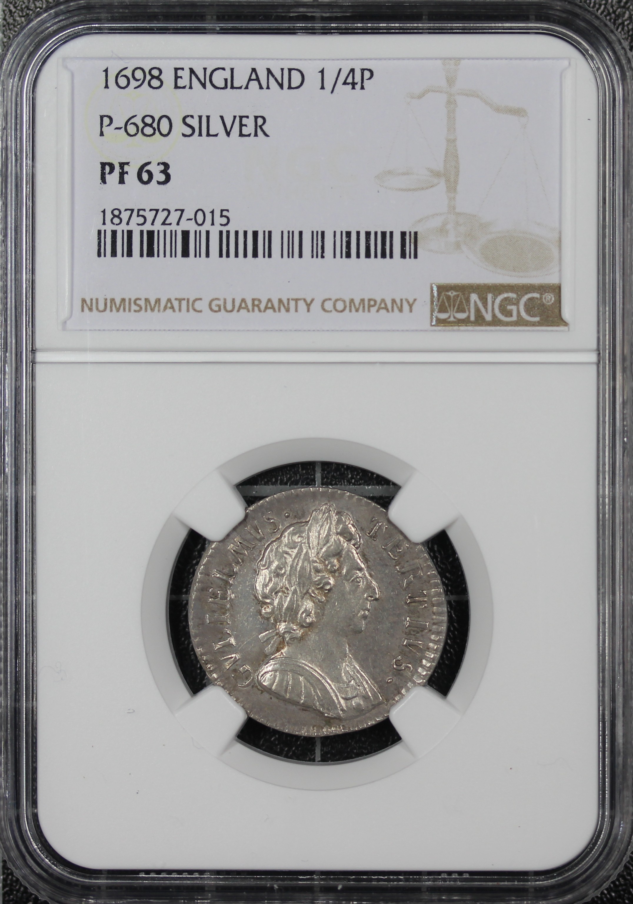 Joint Finest 1698 Silver proof farthing, NGC PF63, William III. O. laureate and cuirassed bust right, R. Britannia seated dividing legend, stop after date. A superb example, UNC with light electric blue hues. Joint finest with one other recorded at this level. [Peck/BMC 680 (very scarce)]
