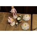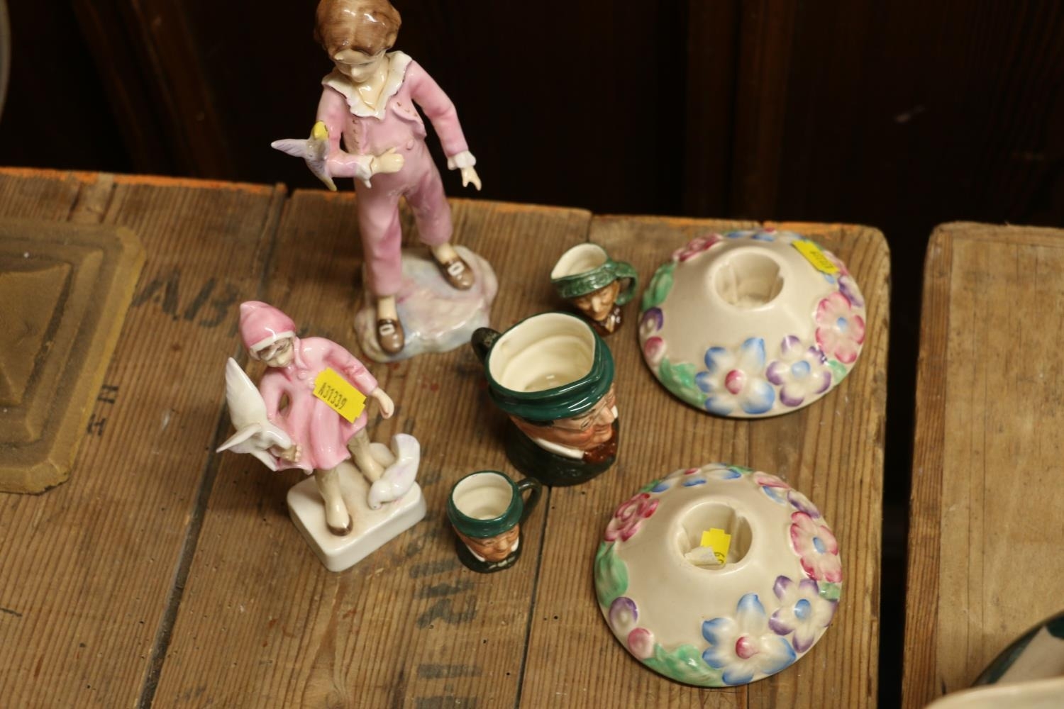 Two Clarice Cliff candle holders, Royal Worcester Parakeet and Peace figurines, and three Royal Doulton small character jugs.