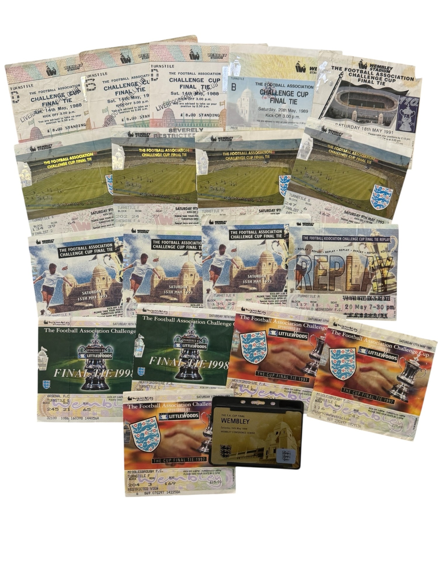 COLLECTION OF FA CUP FINAL FOOTBALL TICKET STUBS, 1988-98, DUPLICATION, 19 TOTAL.