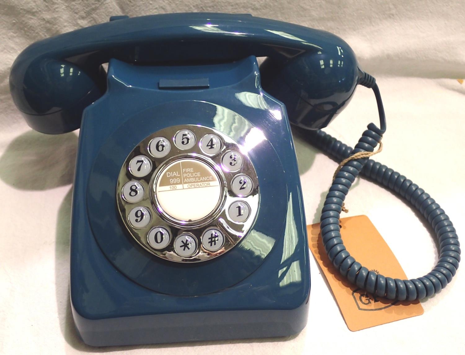 Azure blue, GPO746 Retro push button telephone replica of the 1970s GPO746 classic, compatible with modern telephone banking and any standard analogue landline, with instructions, boxed. P&P Group 1 (£14+VAT for the first lot and £1+VAT for subsequent lots)