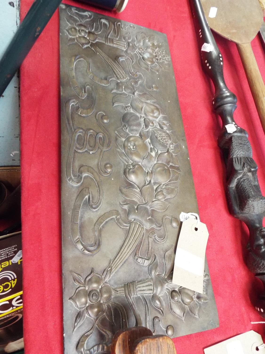 A bronze plaque having embossed floral and fruit decoration