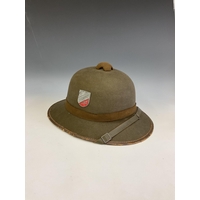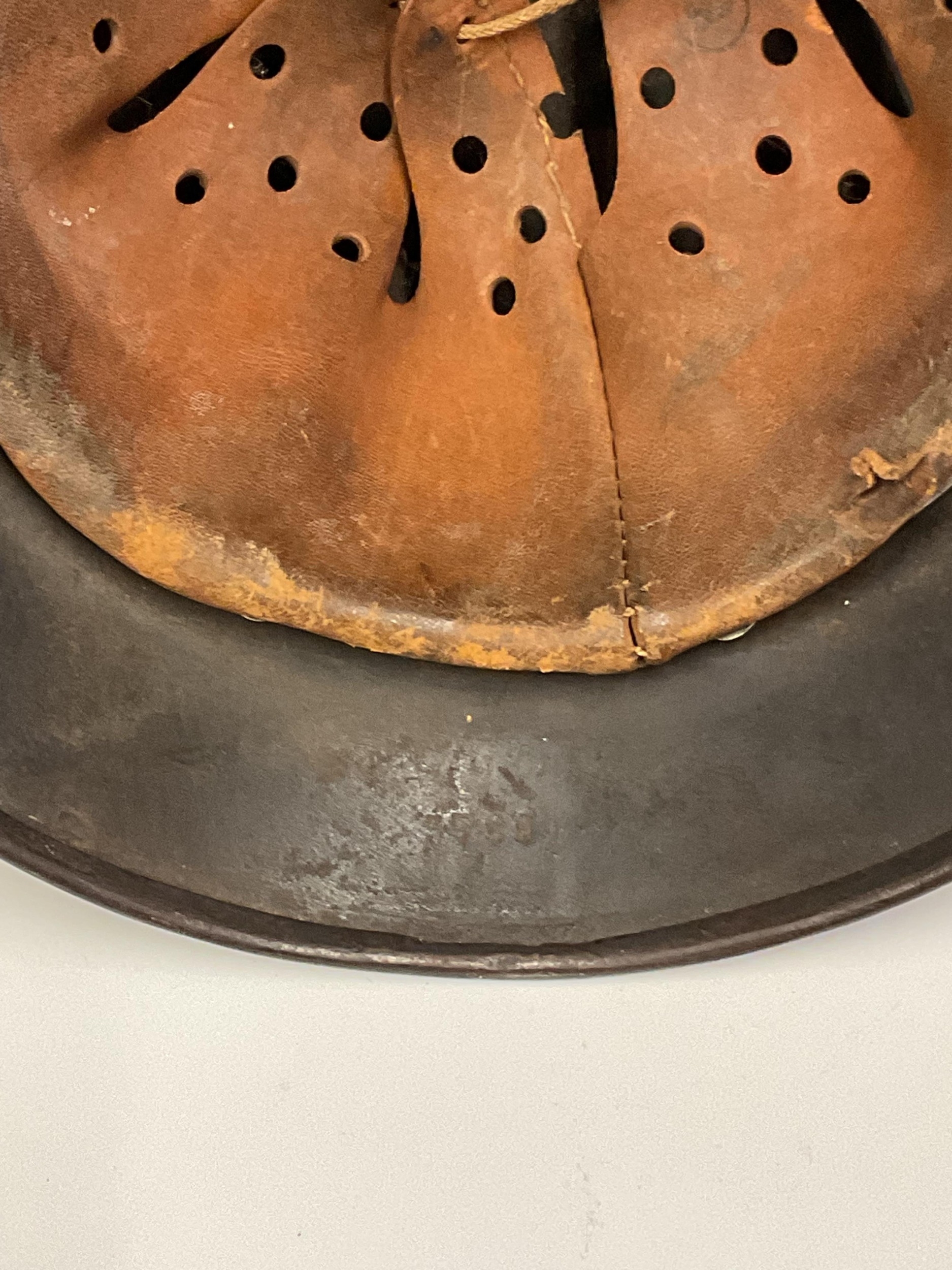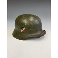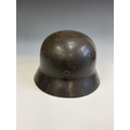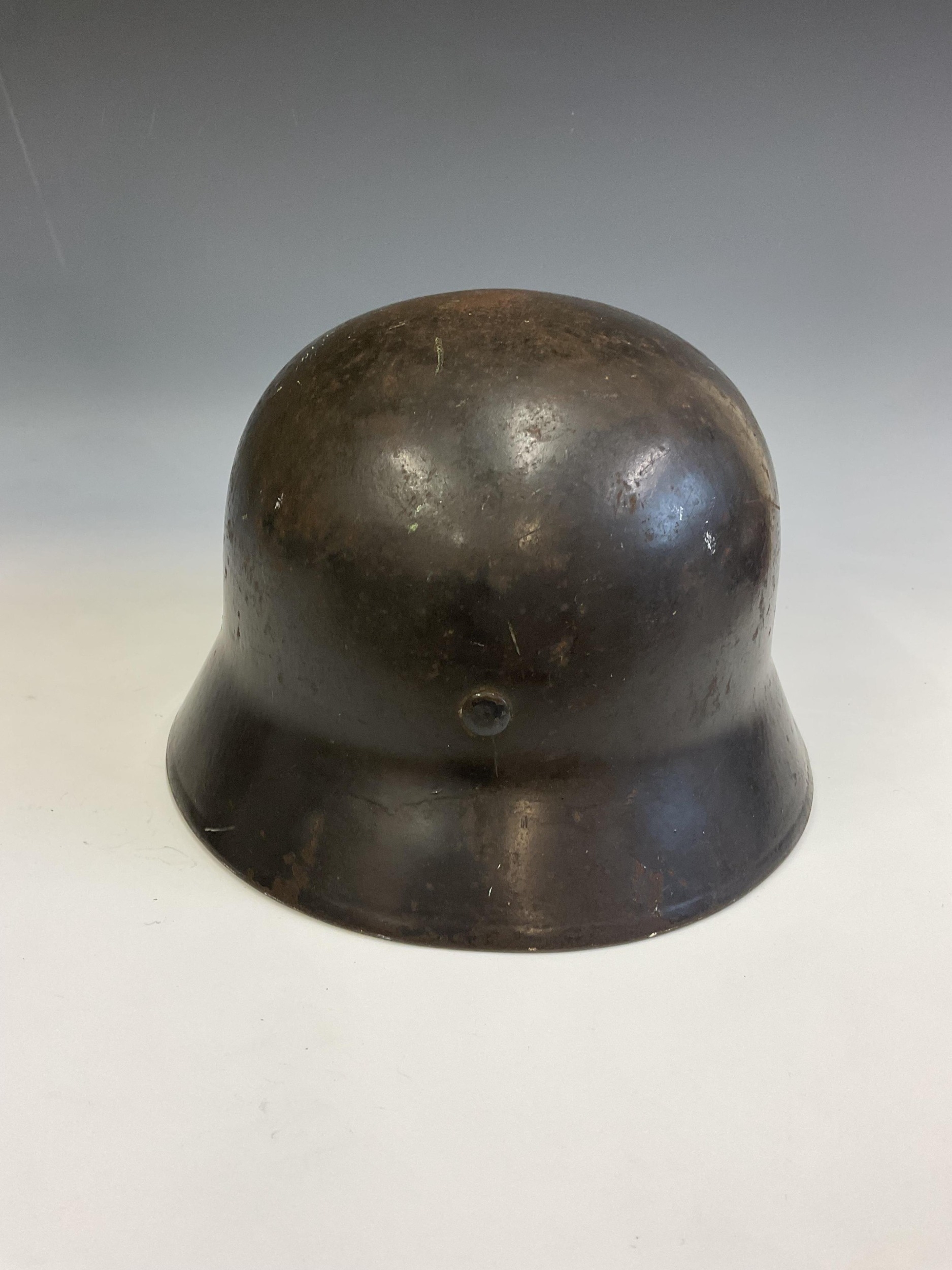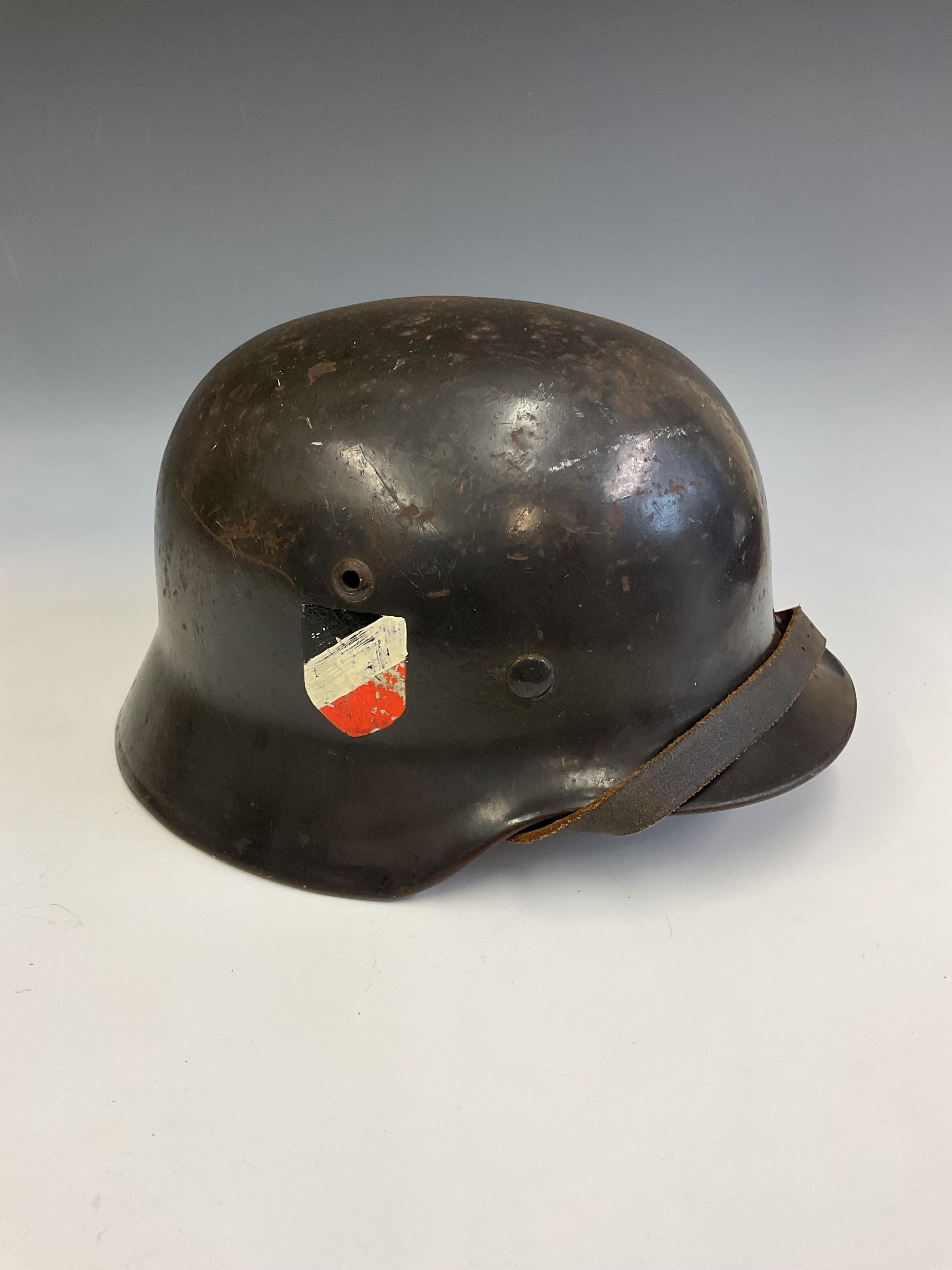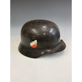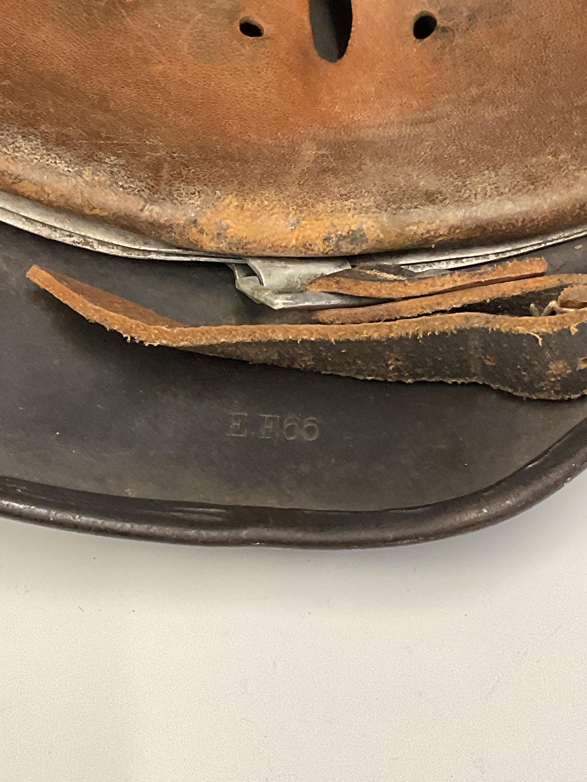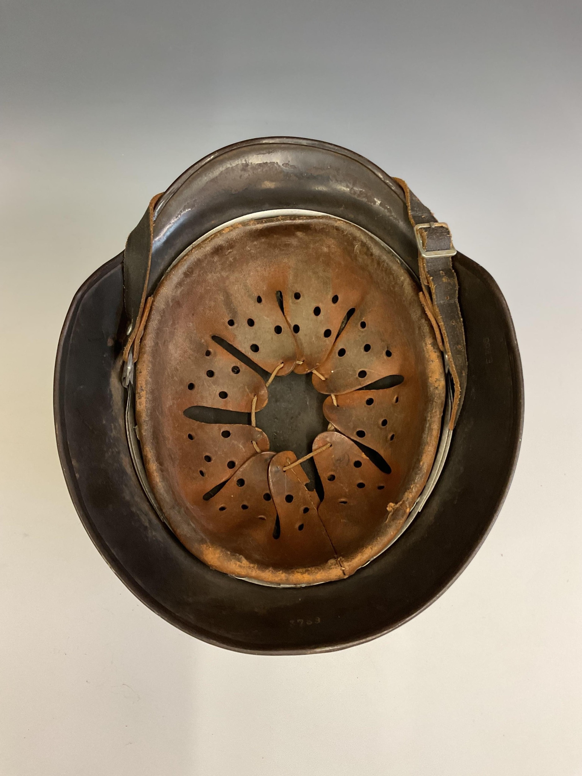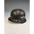 A German World War Two (WWII) Third Reich Luftwaffe Double Decal Steel Helmet, with Luftwaffe eagle to the left side and National shield to the right, retaining original blue painted finish to the shell, interior with alloy band, supporting leather lining and chinstrap, interior of the shell stamped with the number 3789 and E.F,66.