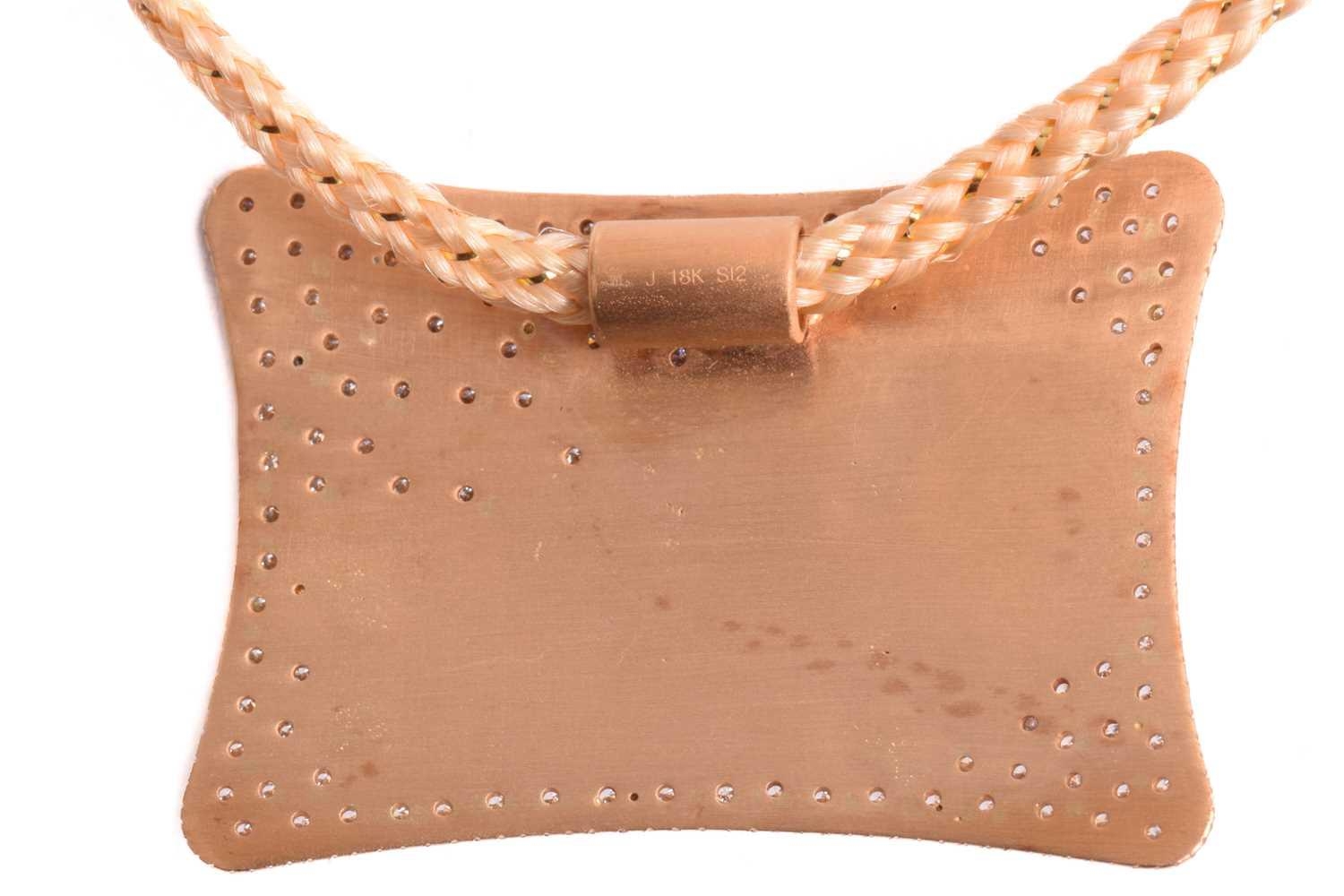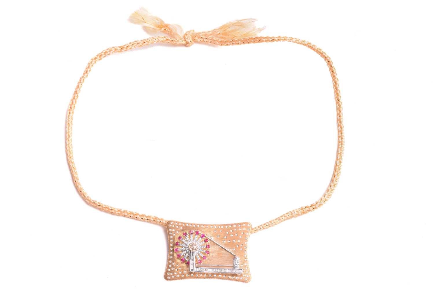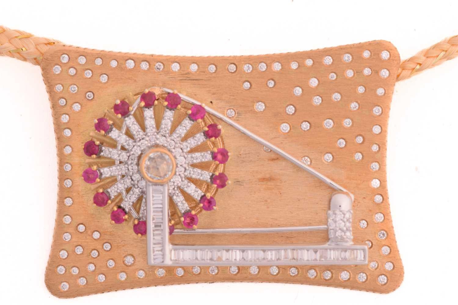 An Indian spinning wheel pendant set with ruby and diamond, featuring an articulated spinning wheel centred with a rose-cut diamond, superimposed upon frames of circular-cut rubies and diamonds, two rows of channel-set baguette-cut diamonds, on a brush-finished rectangular plaque further scattered with diamond highlights, attached to an adjustable woven cord necklace, yellow metal marked '18K', pendant measures 4.2 x 3.1 cm, total weight of item 21.5 grams.
