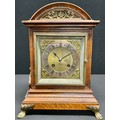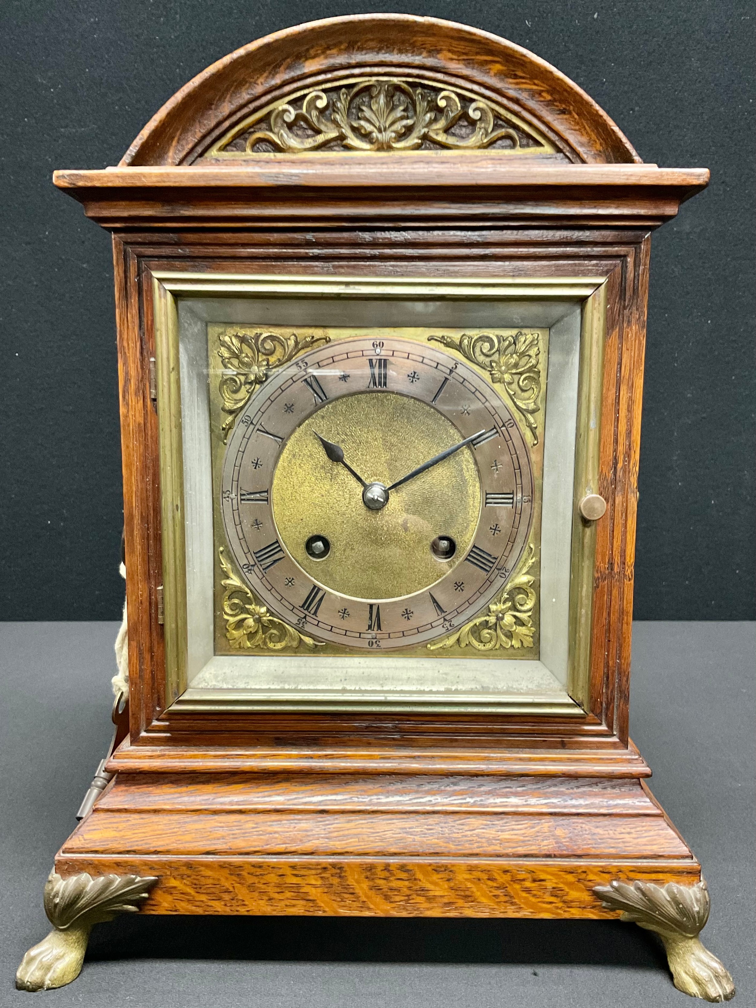 An early 20th century oak arch topped bracket clock, rectangular brass dial with silvered chapter, Roman numerals, twin winding holes, eight day movement striking on a gong, lion mask handles, paw feet, 33cm high