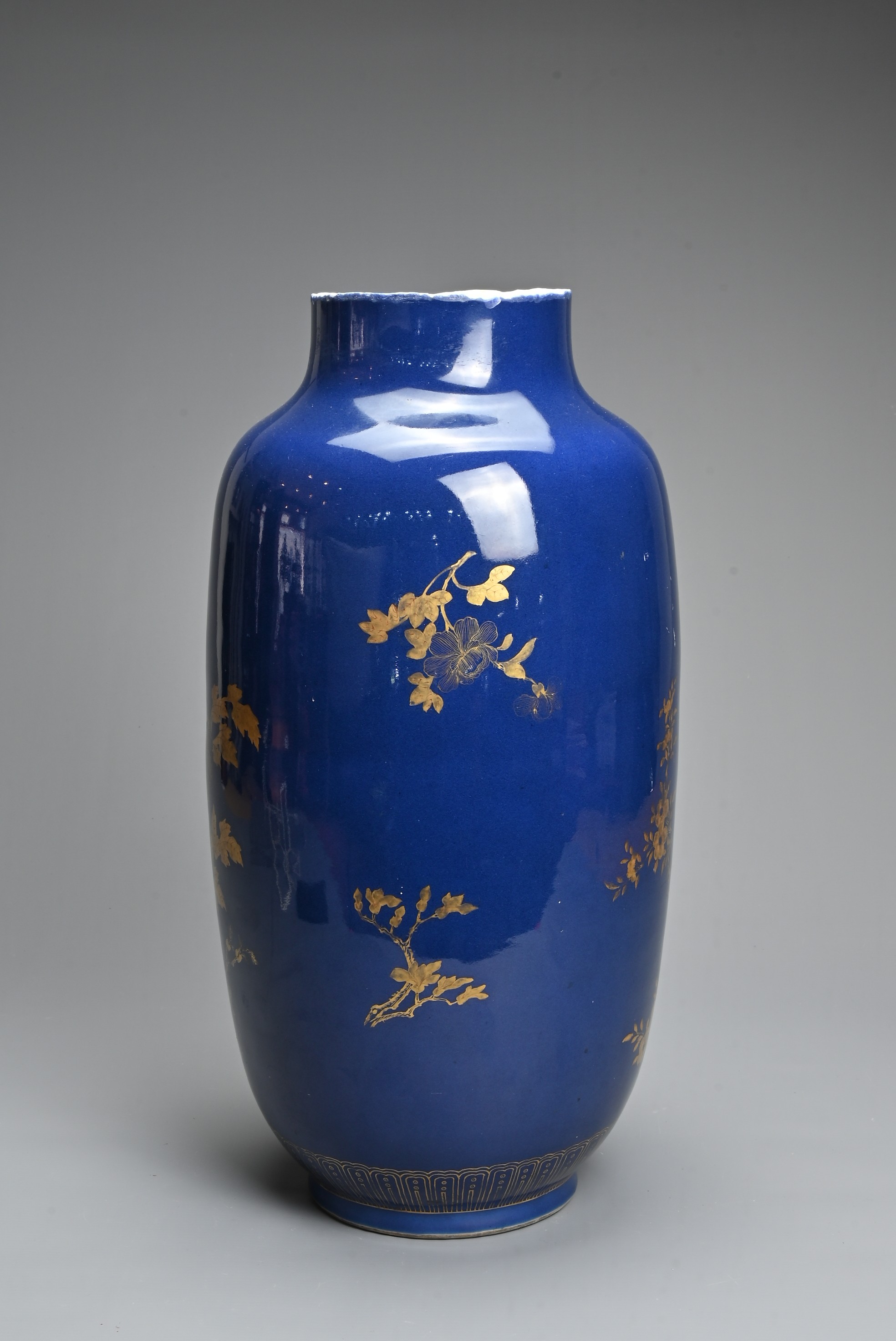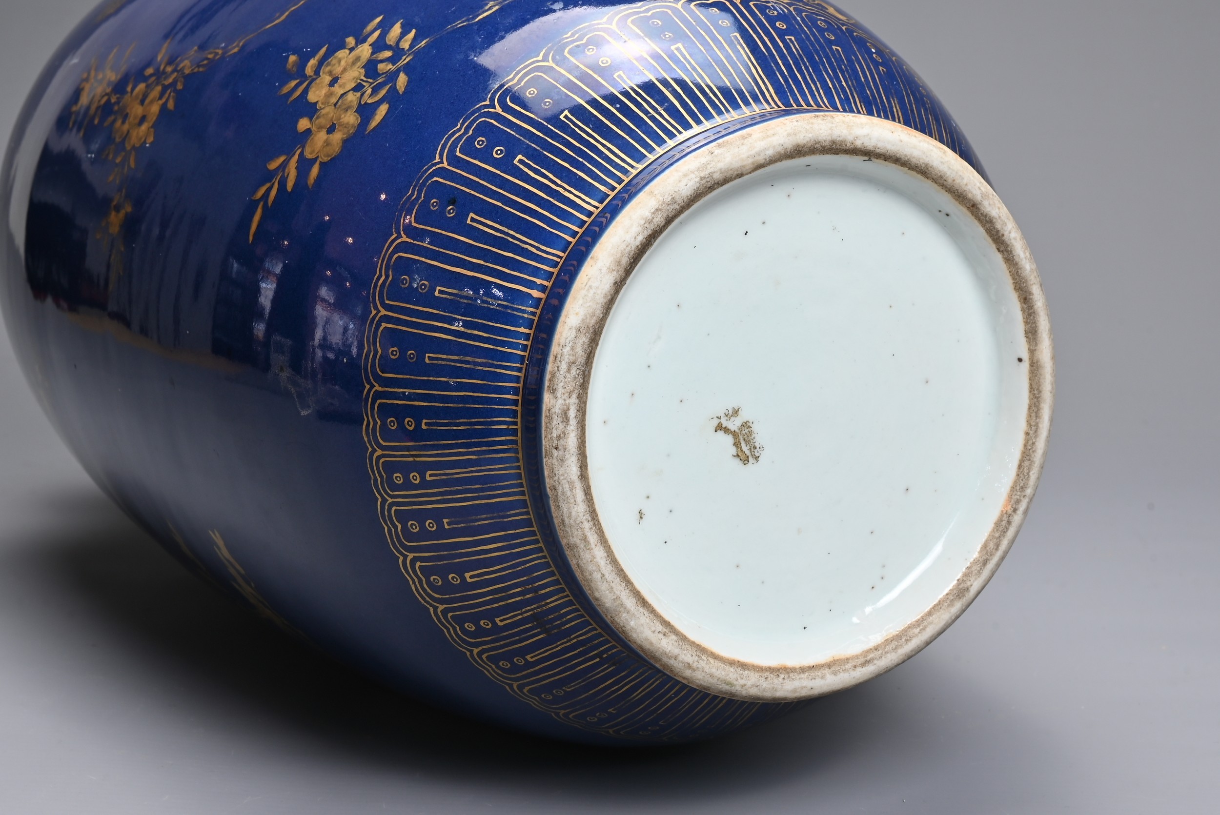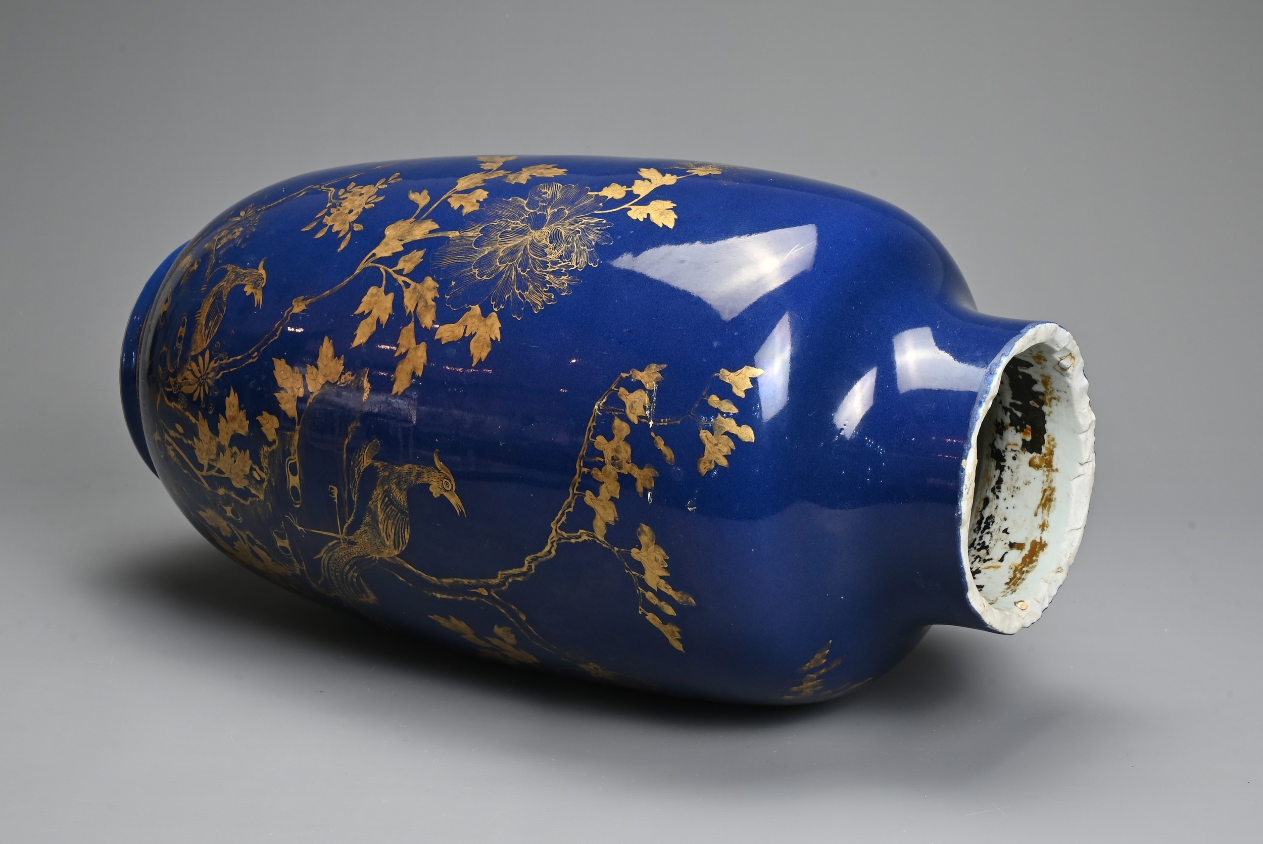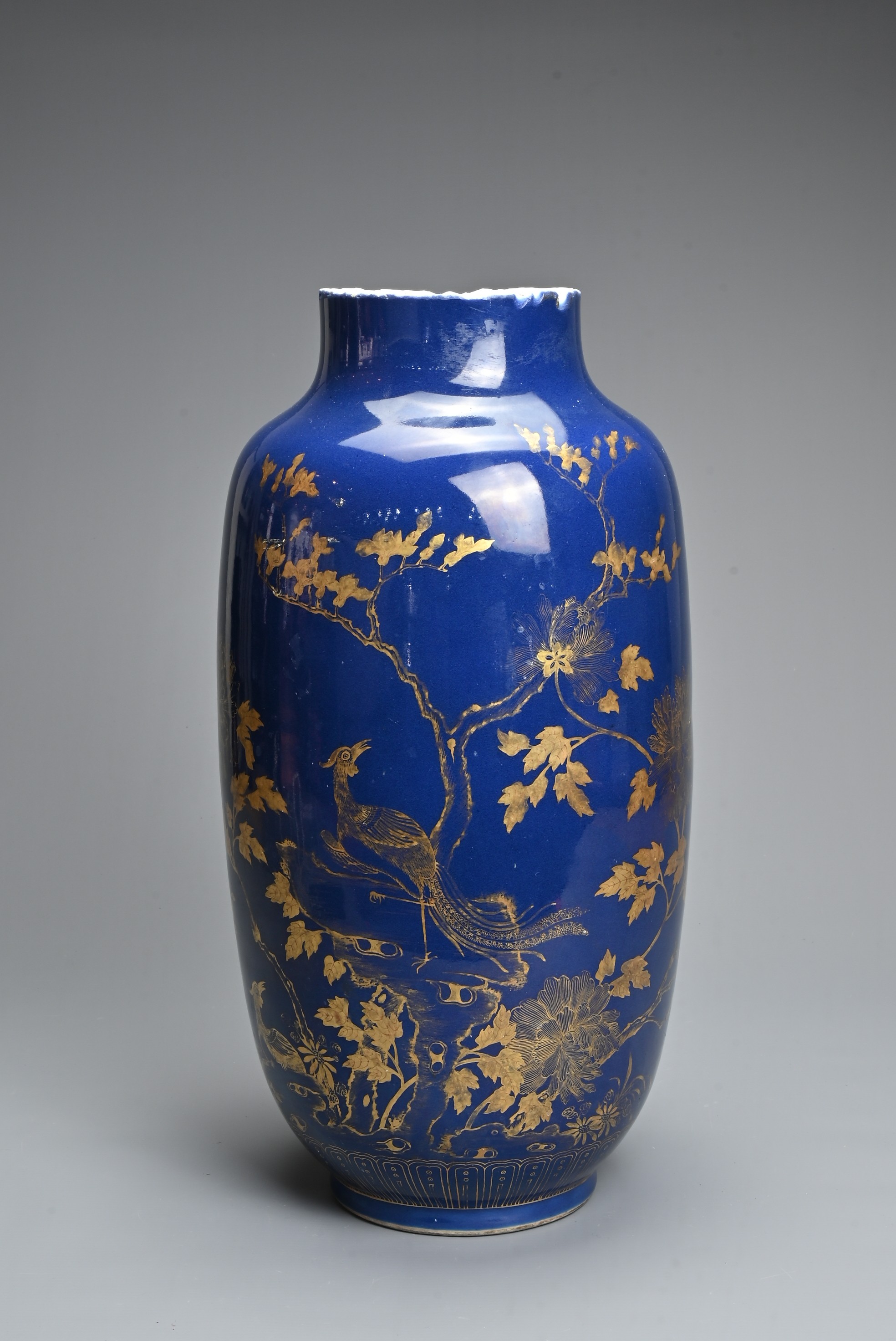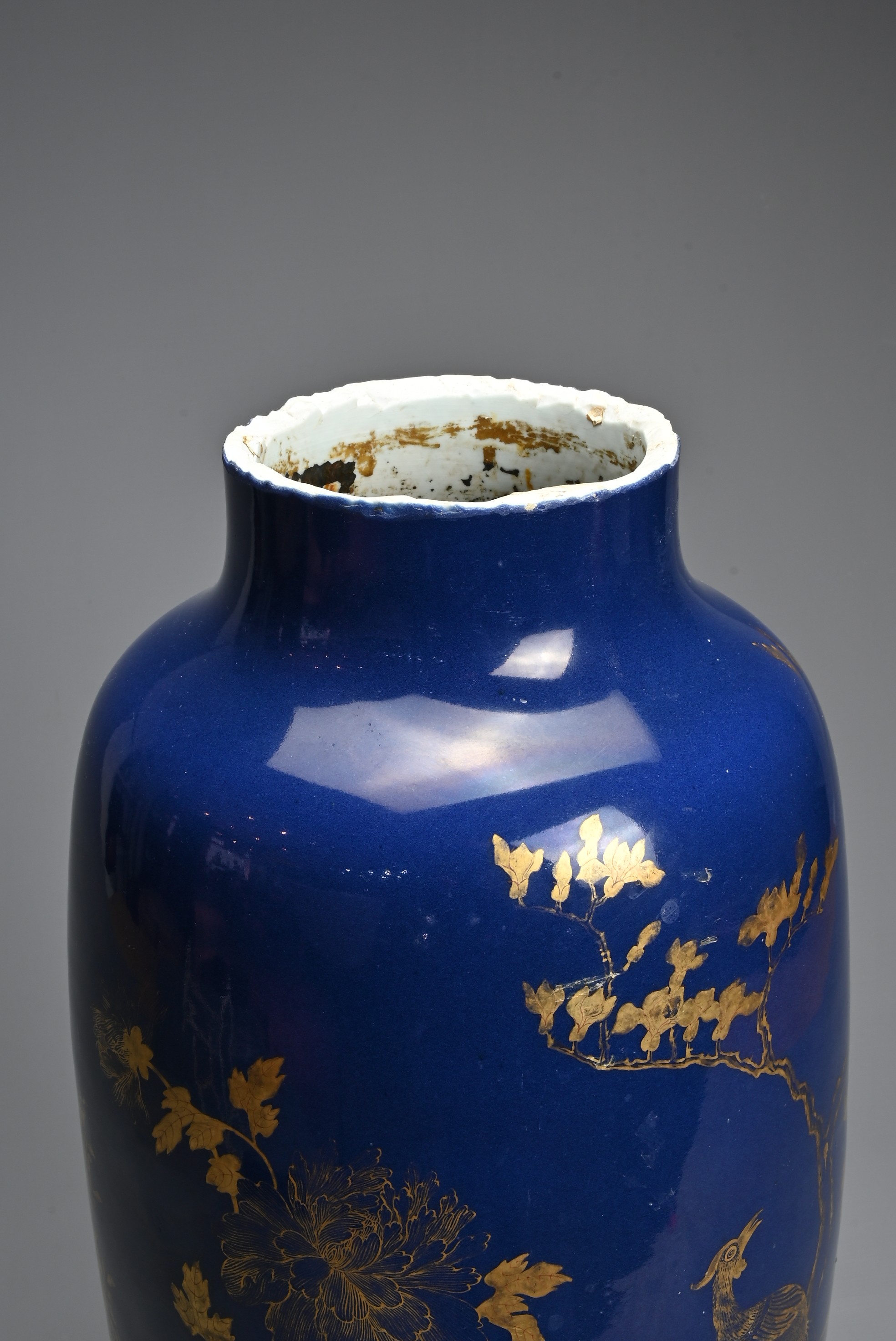 A LARGE CHINESE POWDER BLUE GILT DECORATED VASE, 18TH CENTURY. Decorated with pheasants perched on rocks surrounded by leafy peony branches above a band of lappets at the base. Qianlong period (1735-96). 47cm tall (af)