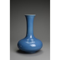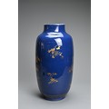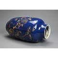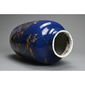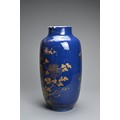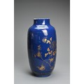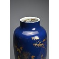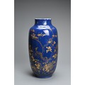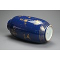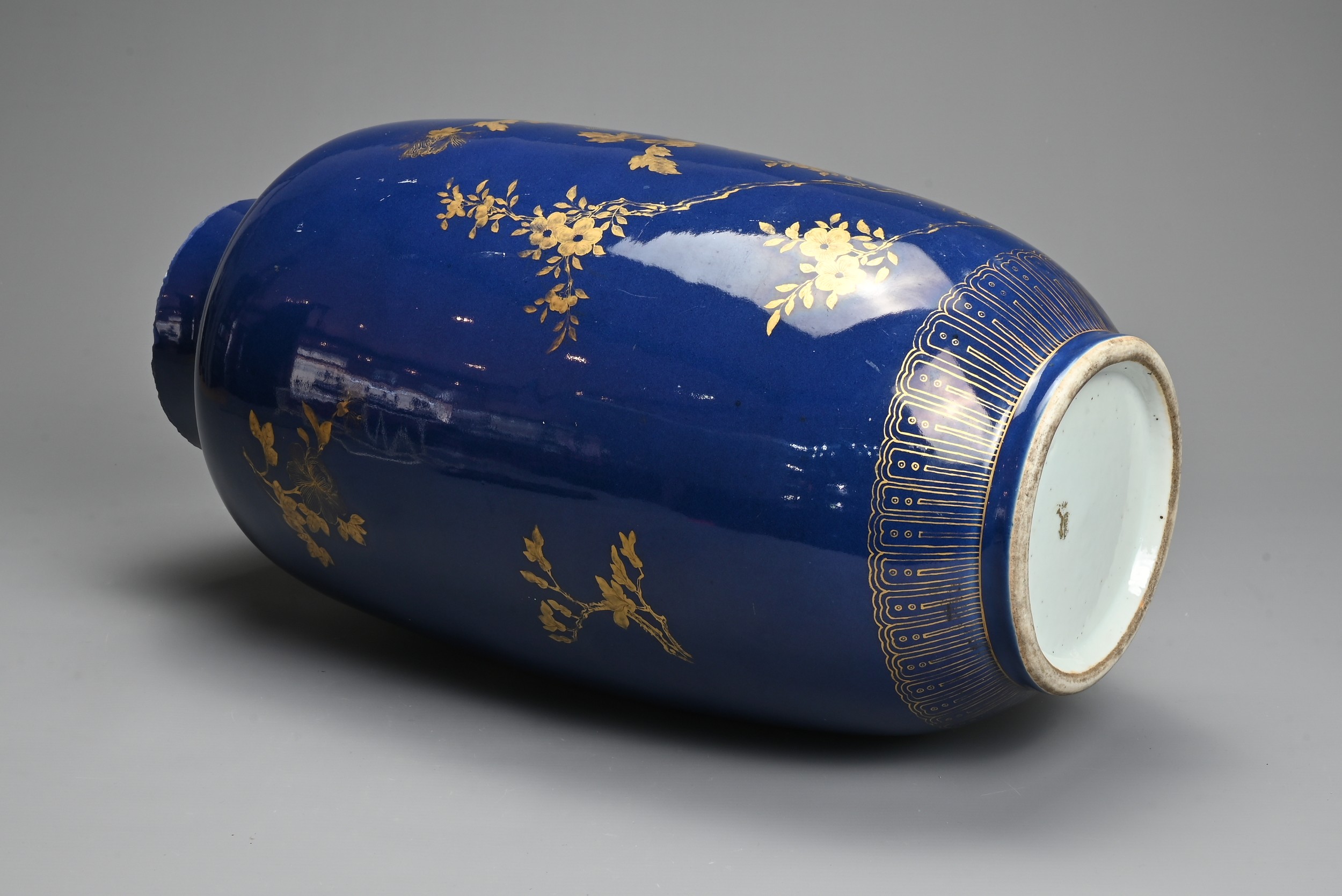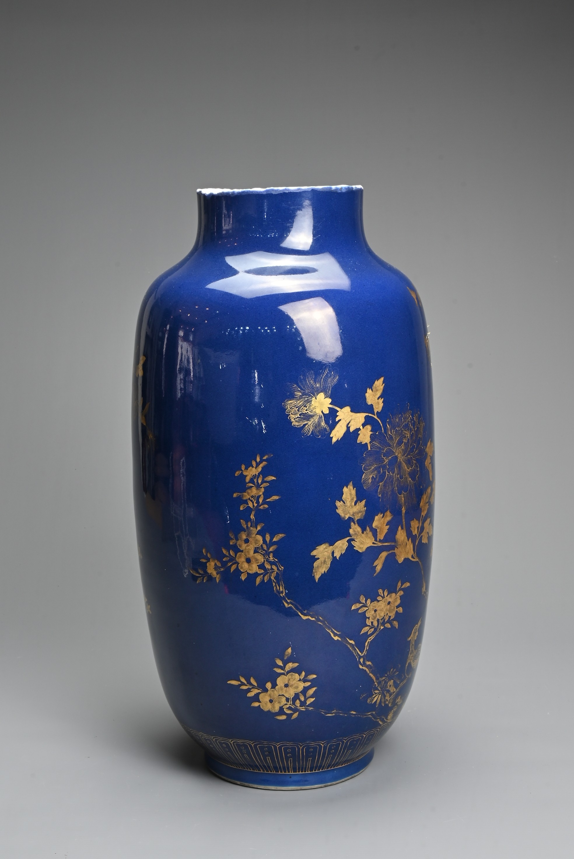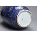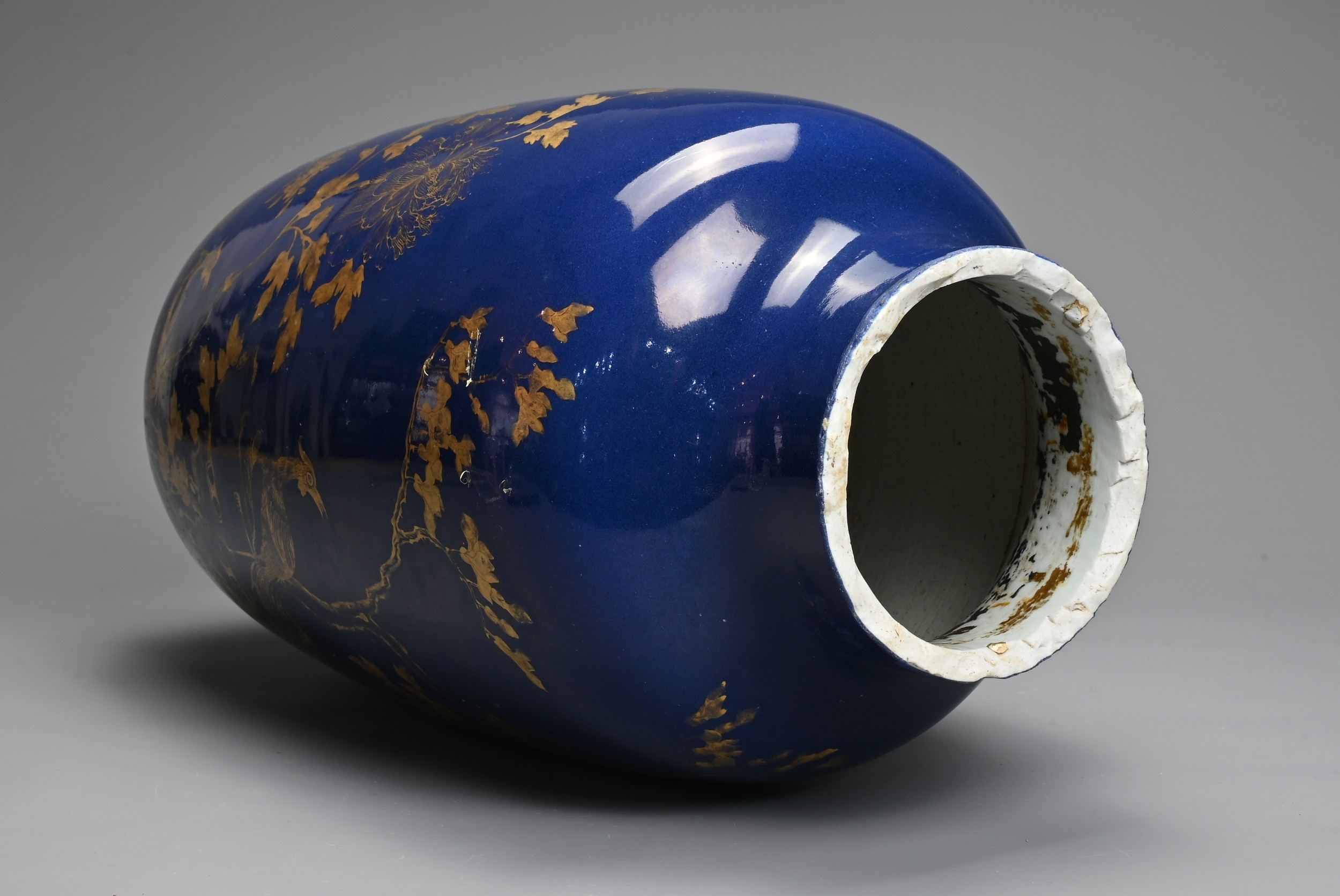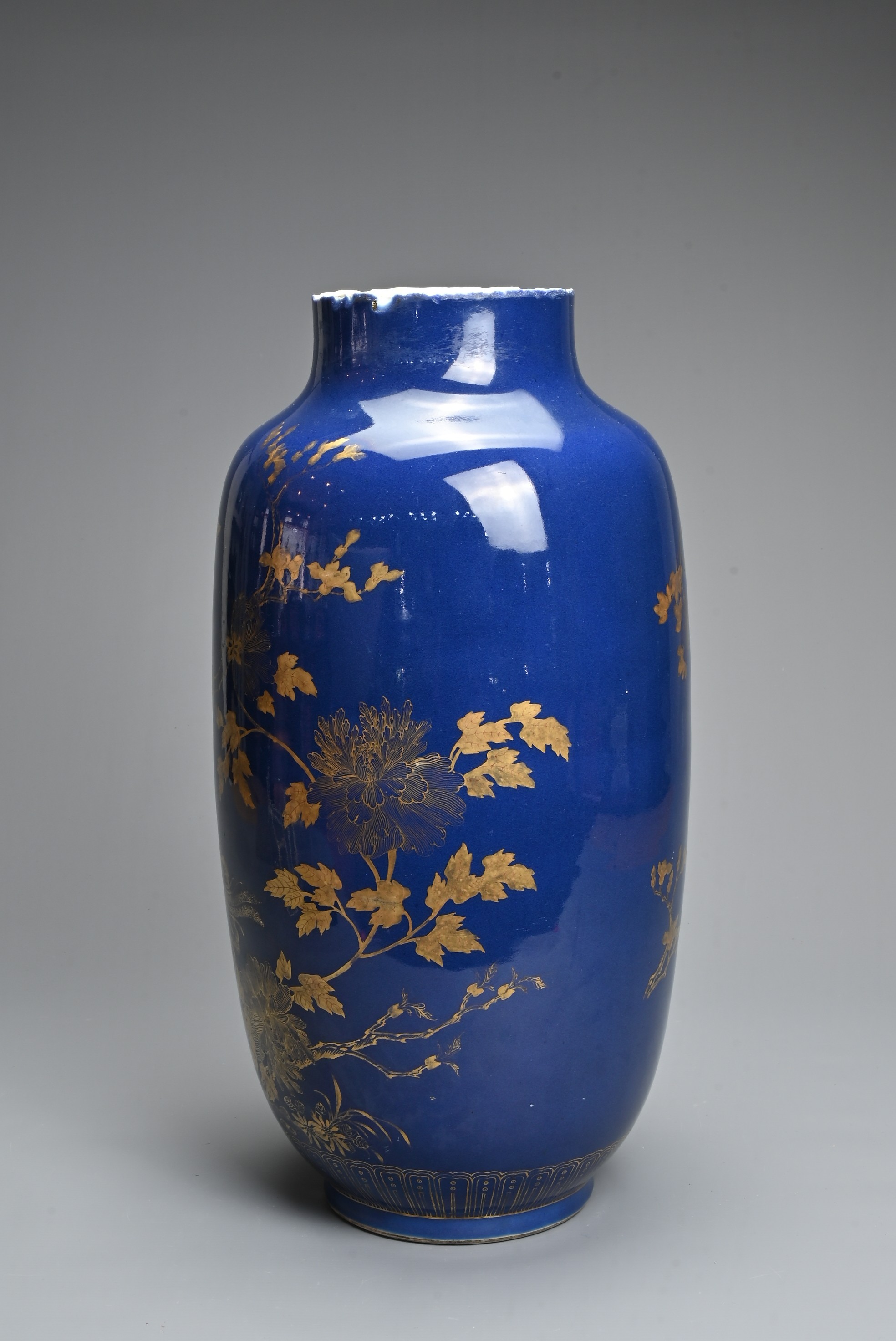A LARGE CHINESE POWDER BLUE GILT DECORATED VASE, 18TH CENTURY. Decorated with pheasants perched on rocks surrounded by leafy peony branches above a band of lappets at the base. Qianlong period (1735-96). 47cm tall (af)