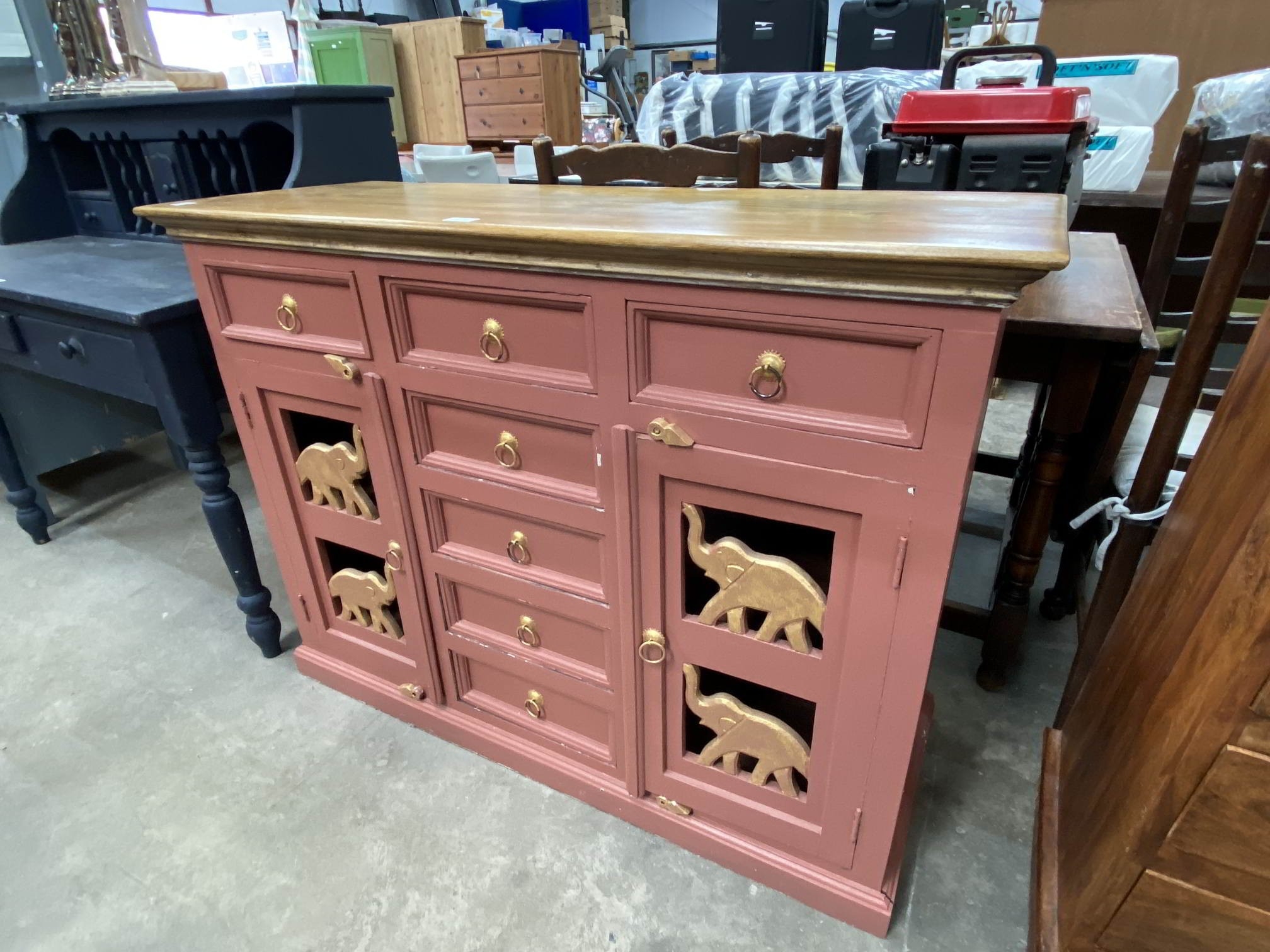 Painted pine sideboard with elephant motifs 90H 121W 46D
