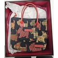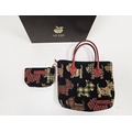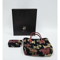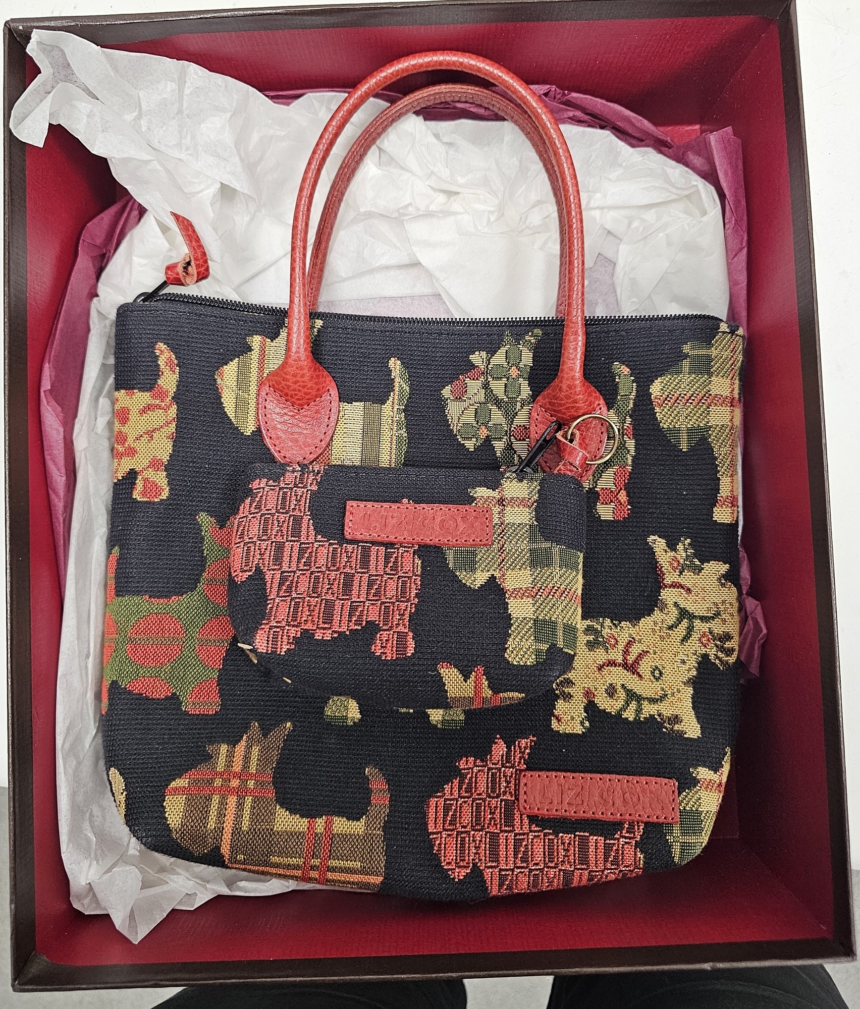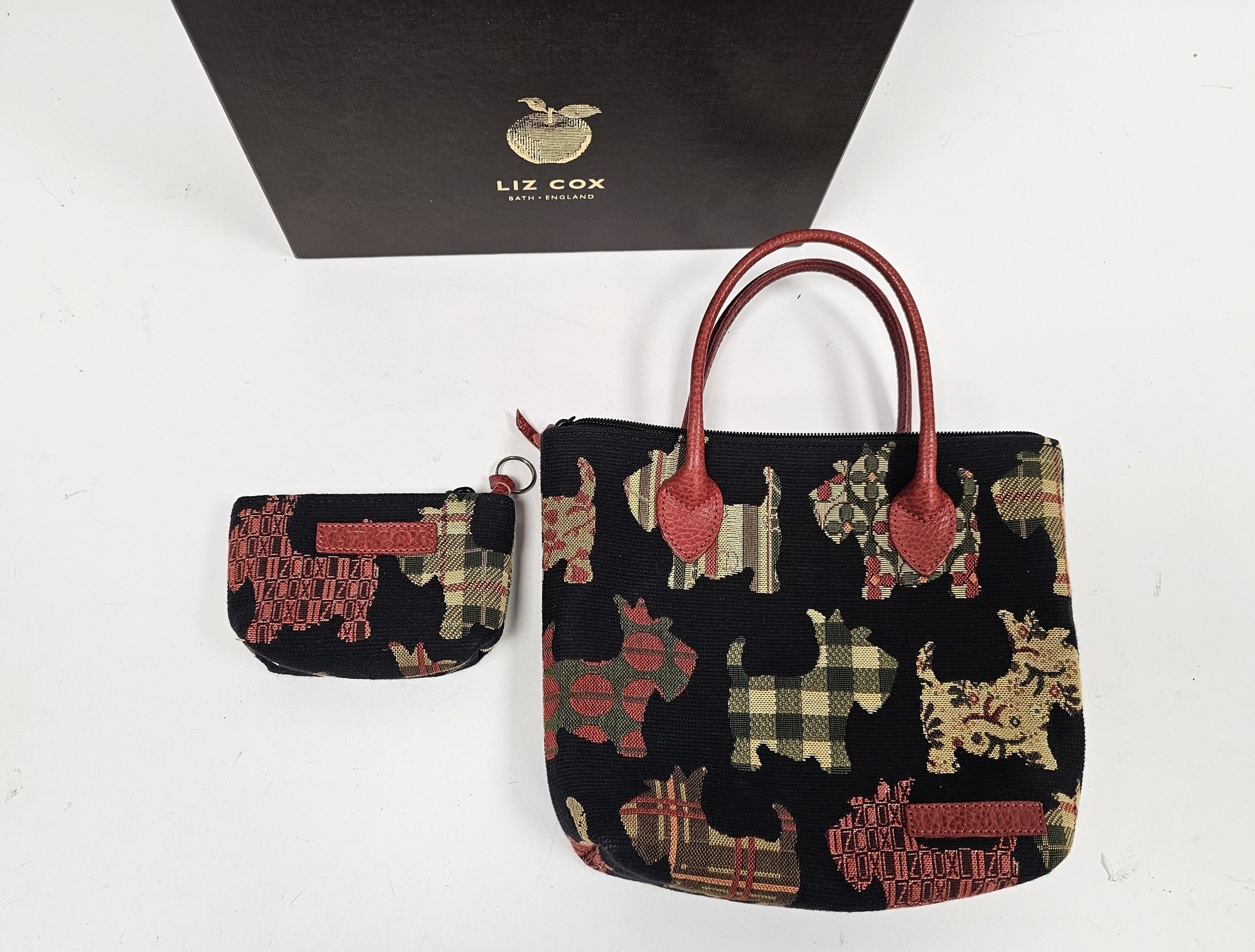 Liz Cox of Bath designer handbag and matching purse, the handbag having a tapestry Scottie dog design with red leather handles and trim, 30cm high x 24cm wide, contained in a Liz Cox presentation box.