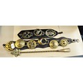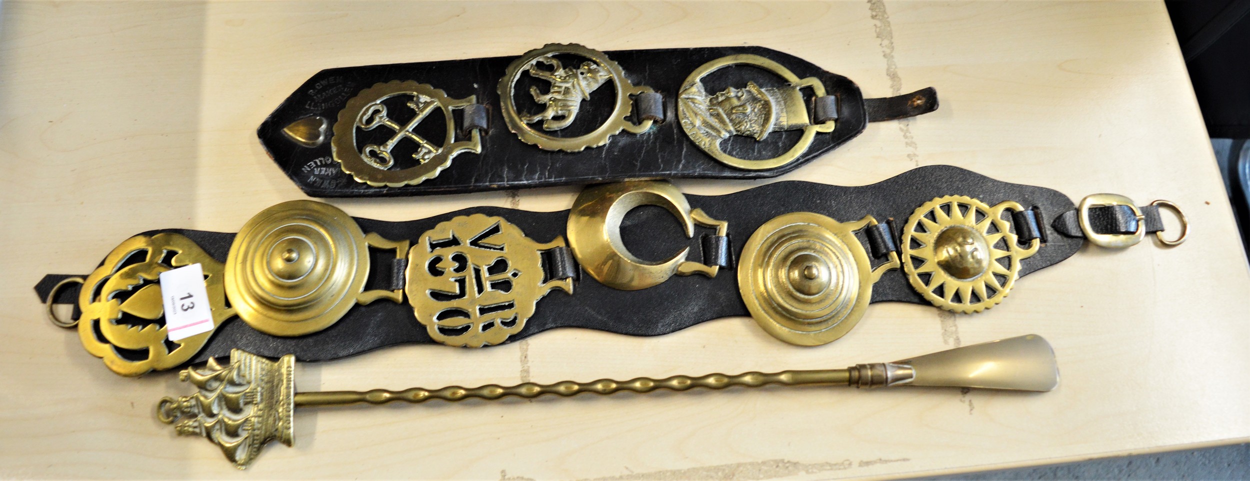 Brass Shoe Horn having Twisted Handle and Ship Design Top, Plus Horse Brasses