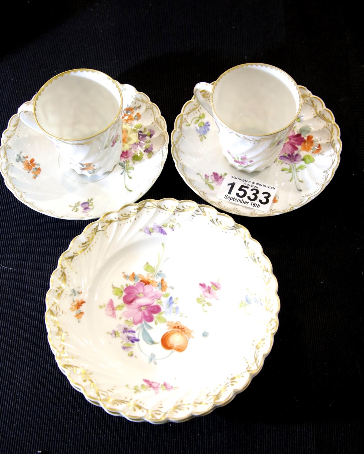 Two trios of saxe hand painted porcelain coffee cans and plates. P&P Group 2 (£18+VAT for the first lot and £3+VAT for subsequent lots)