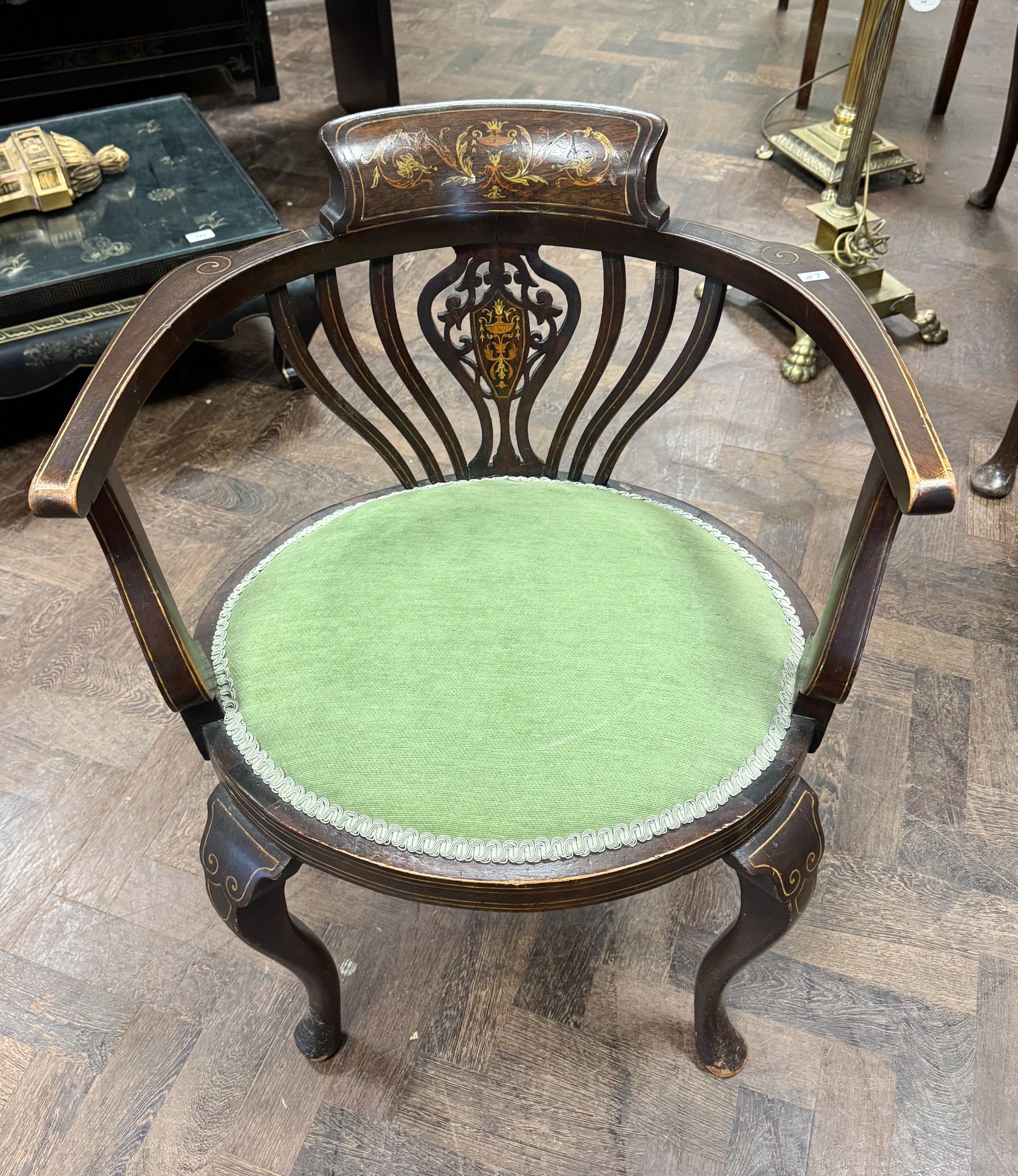 An Edwardian inlaid rosewood tub shaped occasional chair with a green velour upholstered seat
