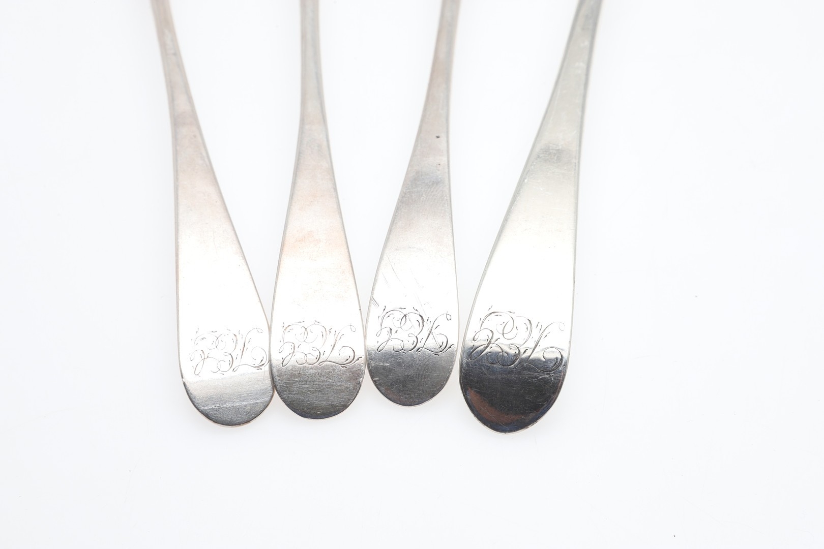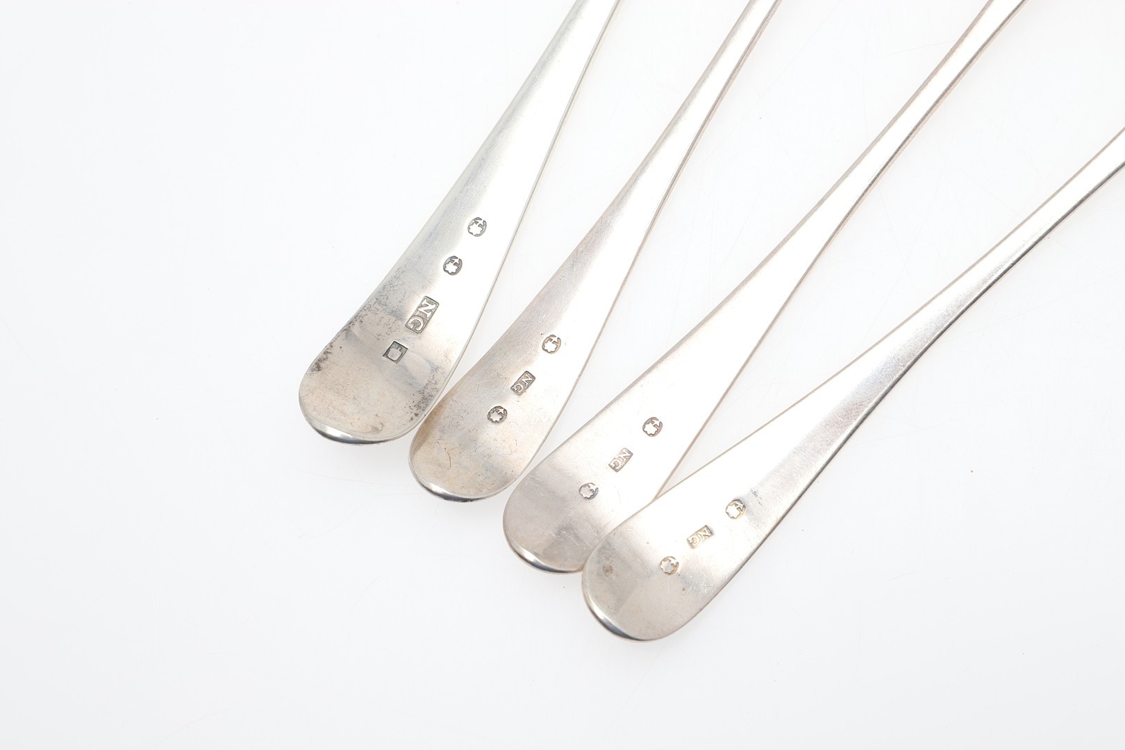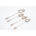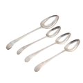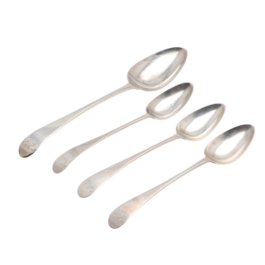 FOUR SCOTTISH PROVINCIAL SILVER OLD ENGLISH PATTERN SPOONS. To include a table spoon (length 22.5cm) and three dessert spoons, hallmarked Nathaniel Gillet, Aberdeen, circa 1800. All with initials to the handles. Total weight 4.8ozt. (4).