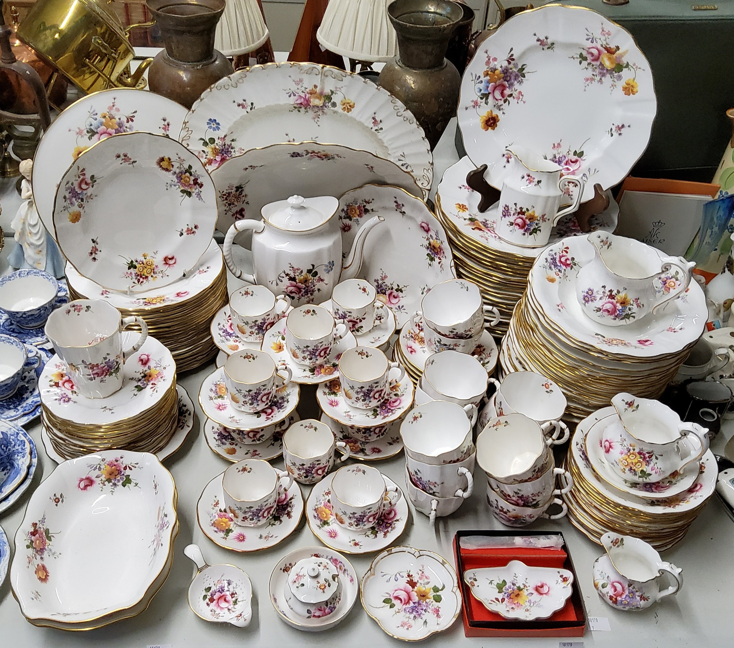 A comprehensive Royal Crown Derby Derby Posies pattern part dinner, tea & coffee service comprising 23 dinner plates, 23 starter/dessert plates, 21 soup bowls, 14 dessert bowls, 14 teacups & 10 saucers, 12 coffee cans & 10 saucers; coffee pot, milk & cream jug, 2 serving dishes, meat plate, mug, mustard pot & cover, pin dish; Vine pattern meat dish and plate etc.