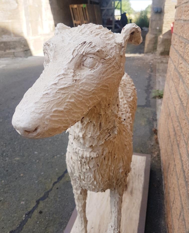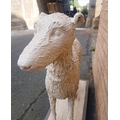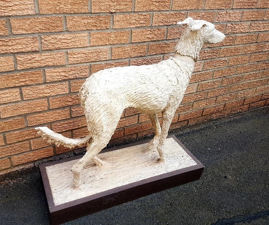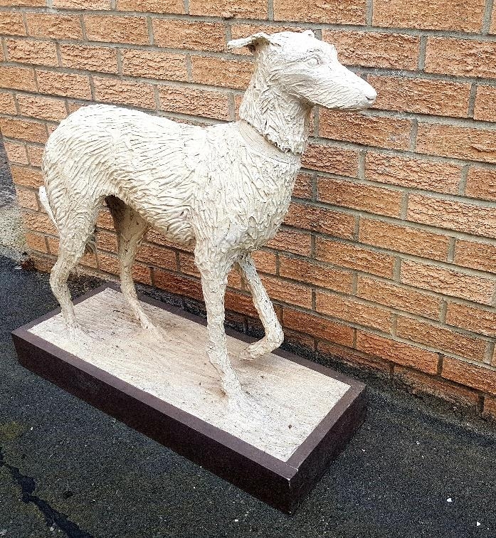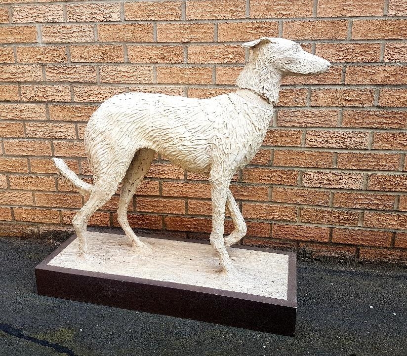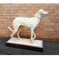 Lifesize realistic Ceramic Sculpture of a Lurcher dog on a wooden plinth, measuring 87cm in height x 87cm in length.