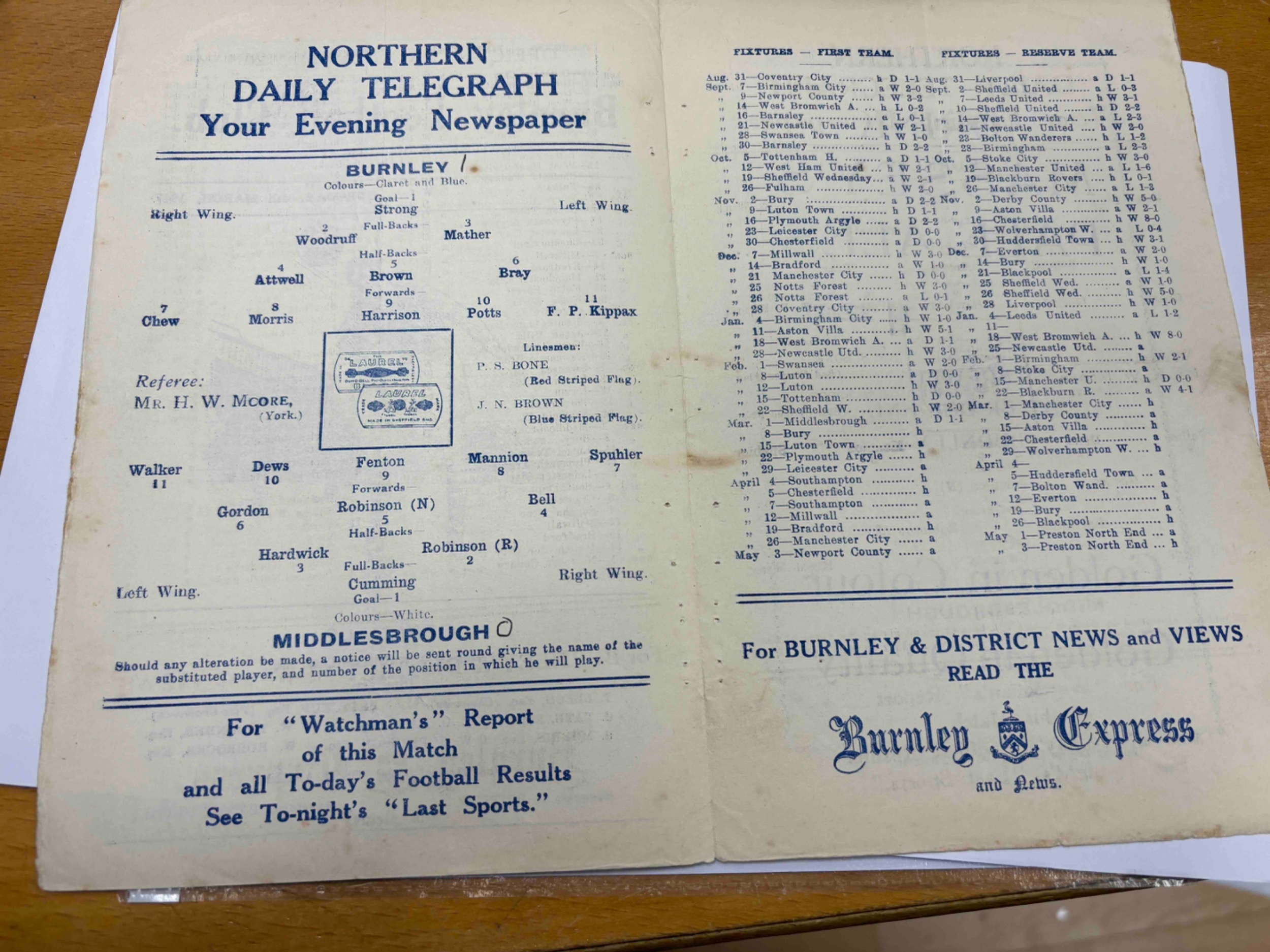 1946/7 Burnley v Middlesbrough FAC Replay 4 pages played on a Tuesday afternoon sl mk sc score on team page , fold