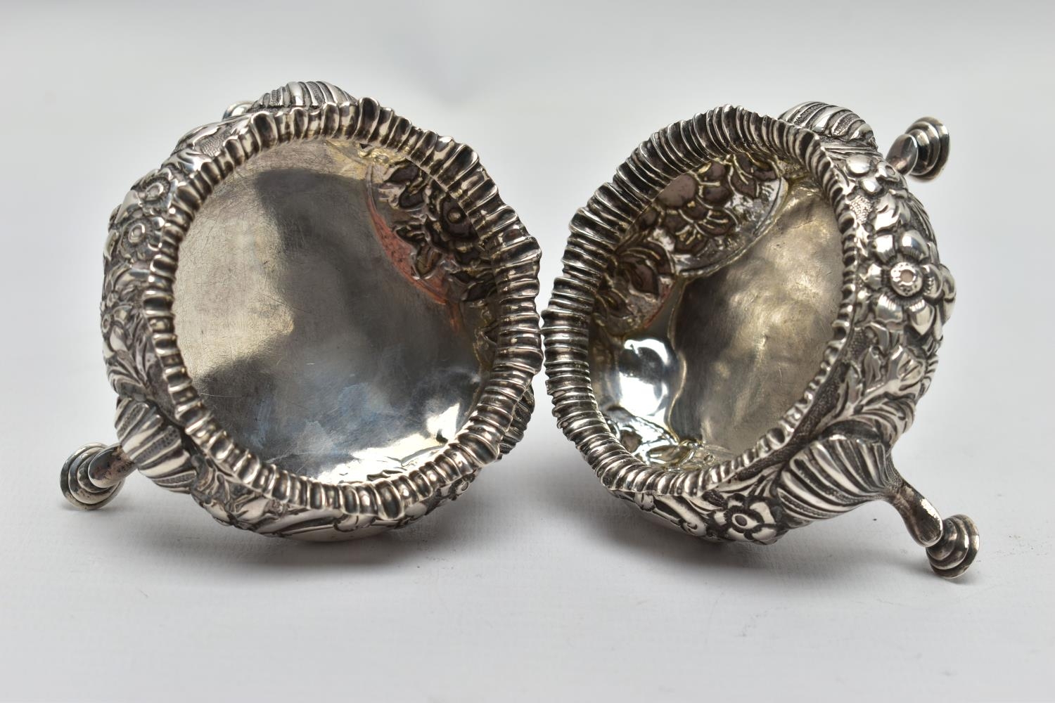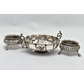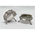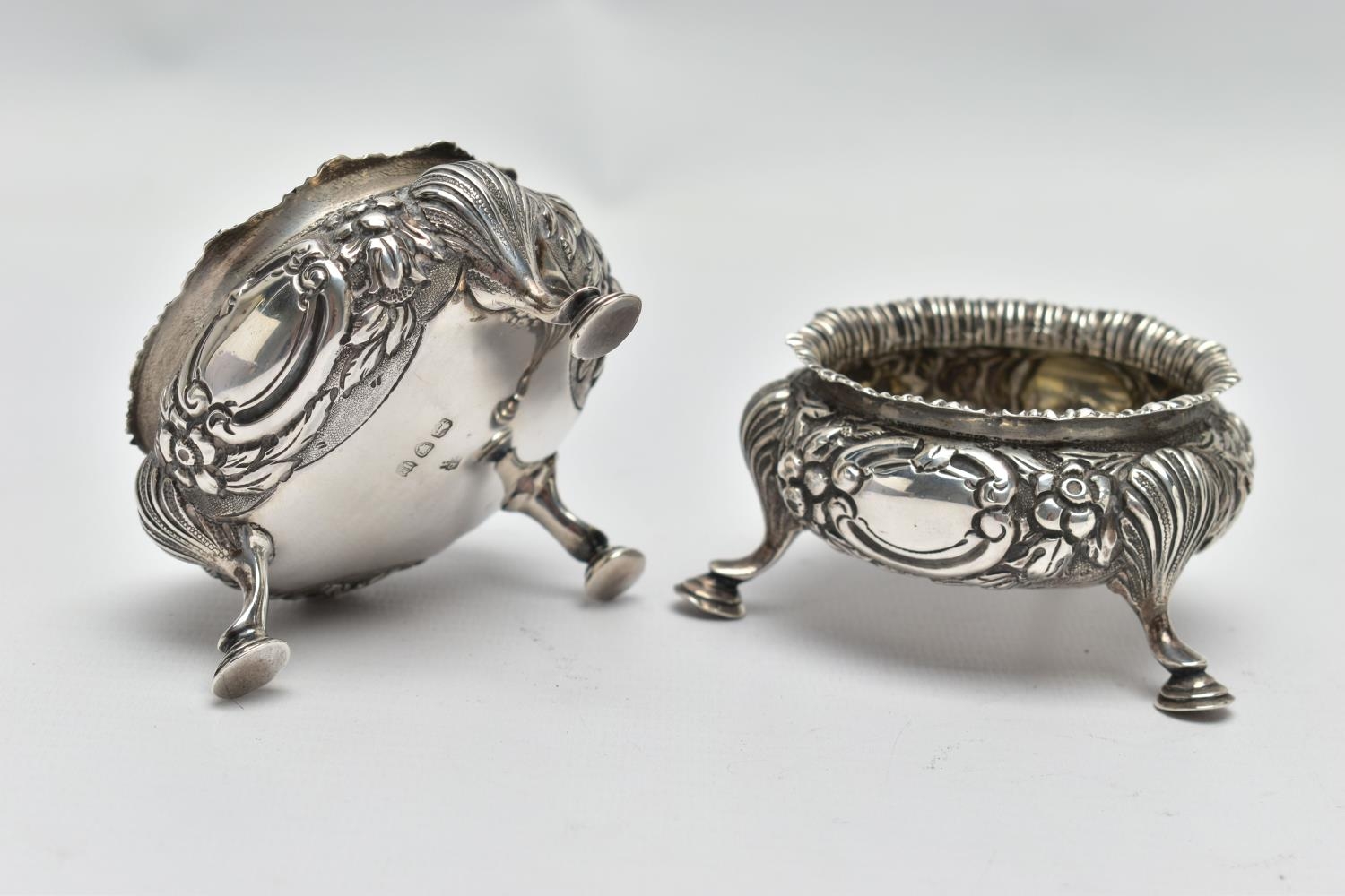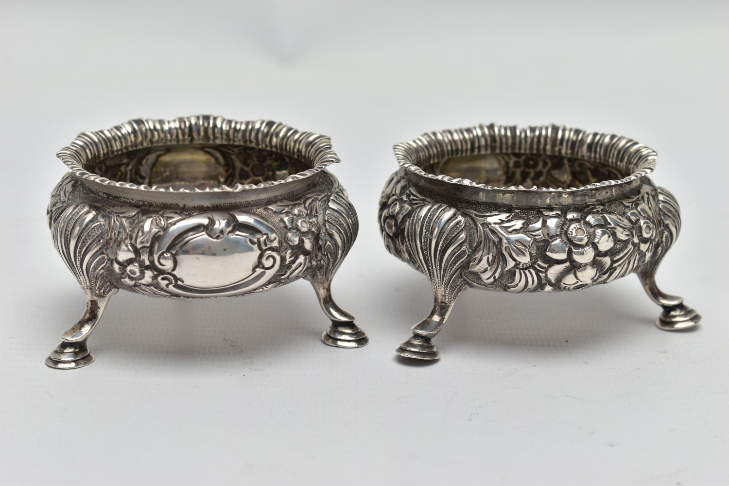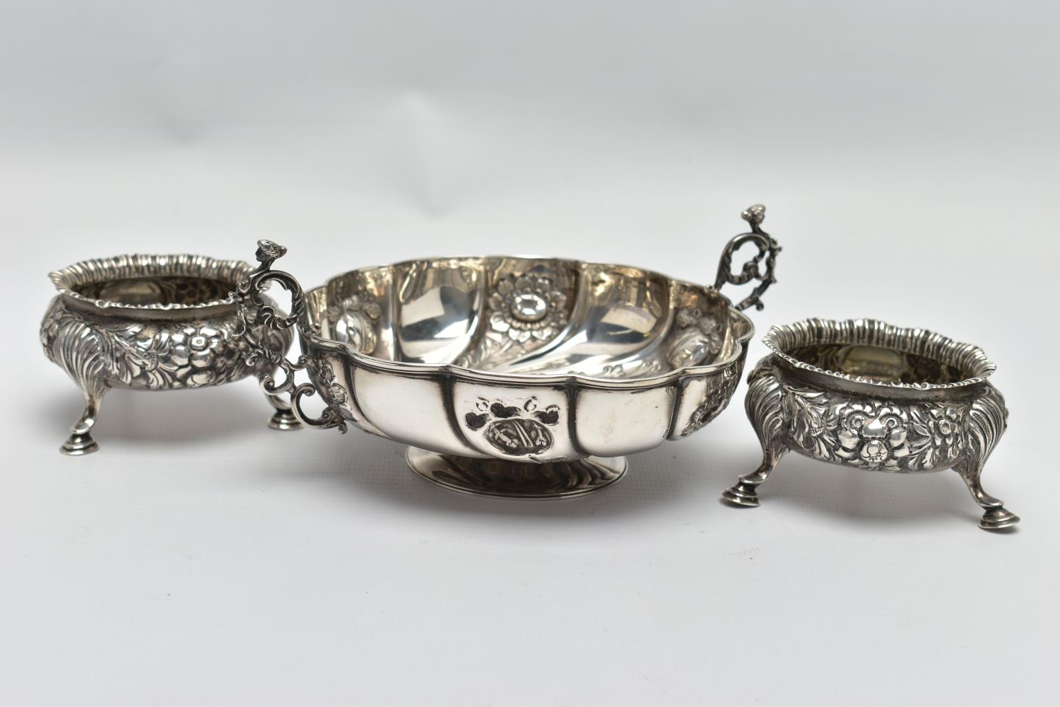 A PAIR OF LATE VICTORIAN OPEN SALTS OF CAULDRON FORM AND A LATE VICTORIAN TWIN HANDLED PEDESTAL BONBON DISH, the pair of salts with wavy reeded rims, floral repousse and chased decoration, vacant cartouche, on three cabriole legs with shell knees and hoof feet, maker Charles Stuart Harris, London 1892, 5.68ozt, 176.8 grams, the bonbon dish with cast scroll handles and the panelled swirl body repousse decorated with stemmed flowers, makers Carrington & Co (John Bodman Carrington), London 1899, 4.59ozt, 142.8 grams, gross weight of the three pieces 10.27ozt, 319.6 grams (3) (Condition report: one salt has all three of the hoof feet with slight upturns, this salt also has a dint to the cartouche, both show signs of use commensurate with age, the bonbon dish is in good condition overall)