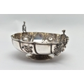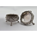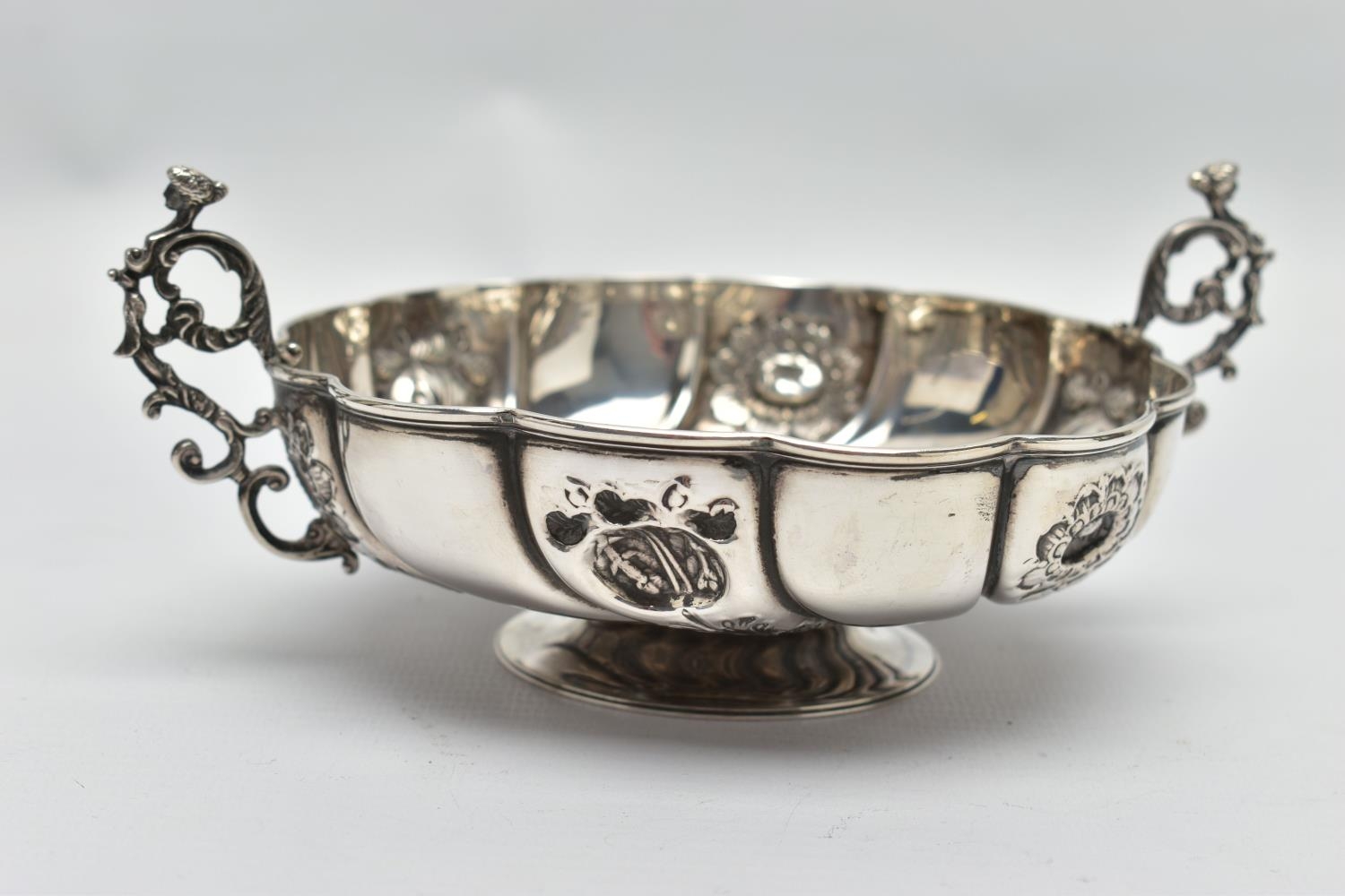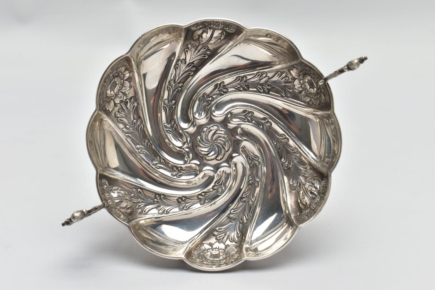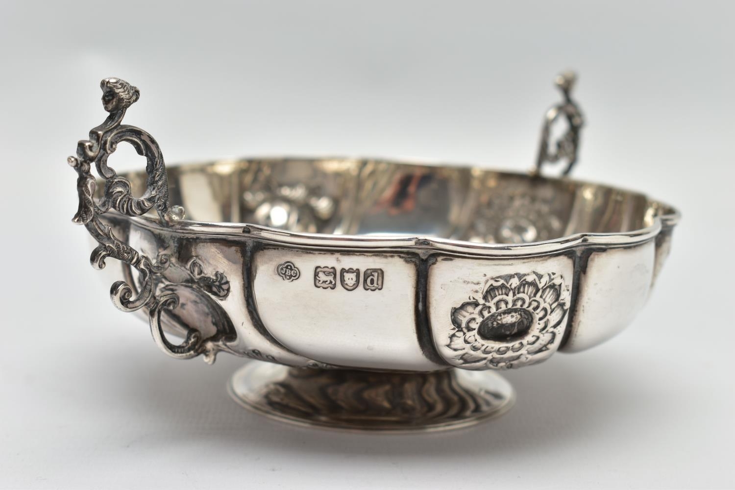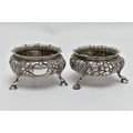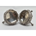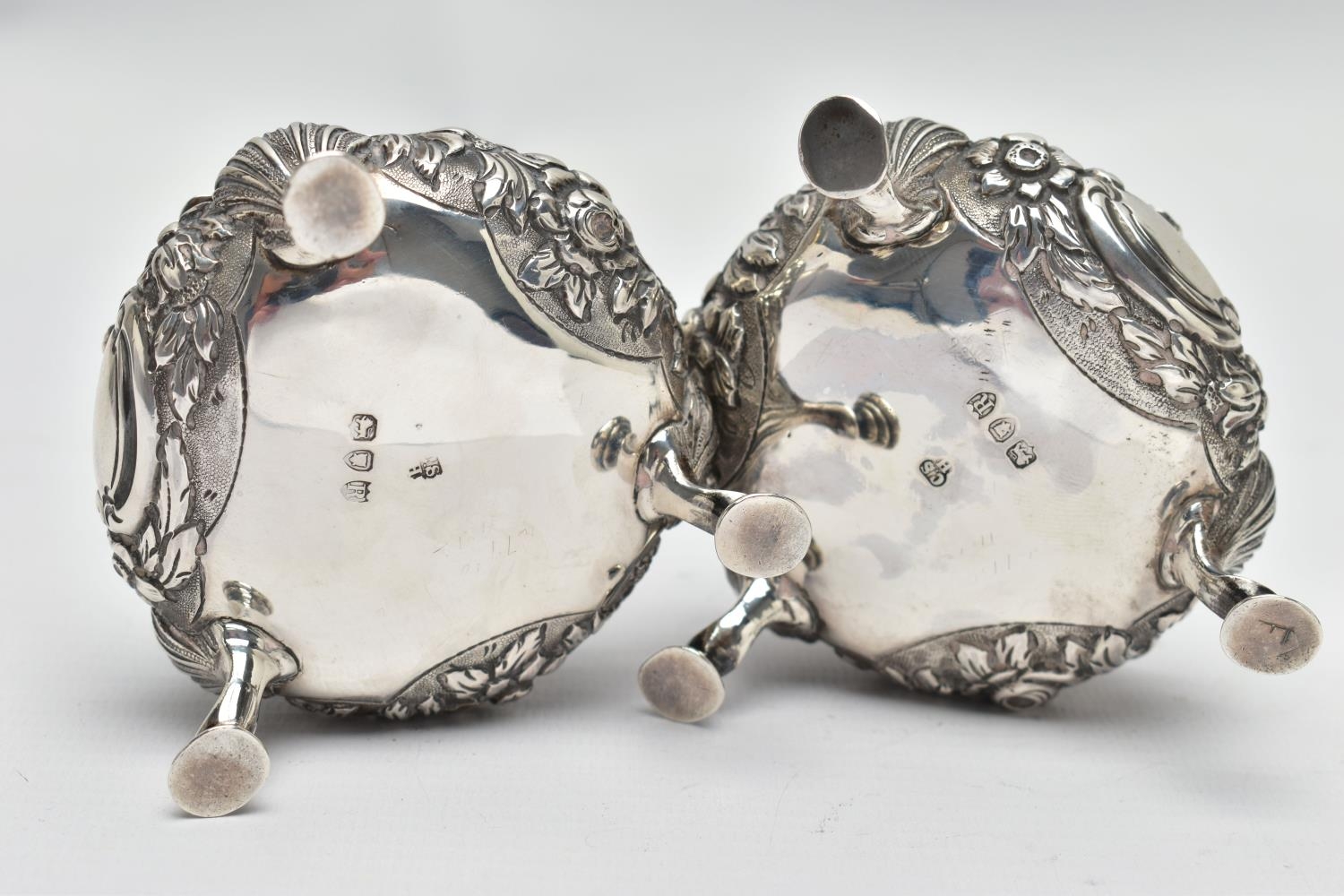 A PAIR OF LATE VICTORIAN OPEN SALTS OF CAULDRON FORM AND A LATE VICTORIAN TWIN HANDLED PEDESTAL BONBON DISH, the pair of salts with wavy reeded rims, floral repousse and chased decoration, vacant cartouche, on three cabriole legs with shell knees and hoof feet, maker Charles Stuart Harris, London 1892, 5.68ozt, 176.8 grams, the bonbon dish with cast scroll handles and the panelled swirl body repousse decorated with stemmed flowers, makers Carrington & Co (John Bodman Carrington), London 1899, 4.59ozt, 142.8 grams, gross weight of the three pieces 10.27ozt, 319.6 grams (3) (Condition report: one salt has all three of the hoof feet with slight upturns, this salt also has a dint to the cartouche, both show signs of use commensurate with age, the bonbon dish is in good condition overall)