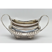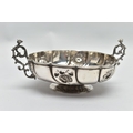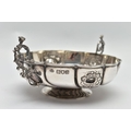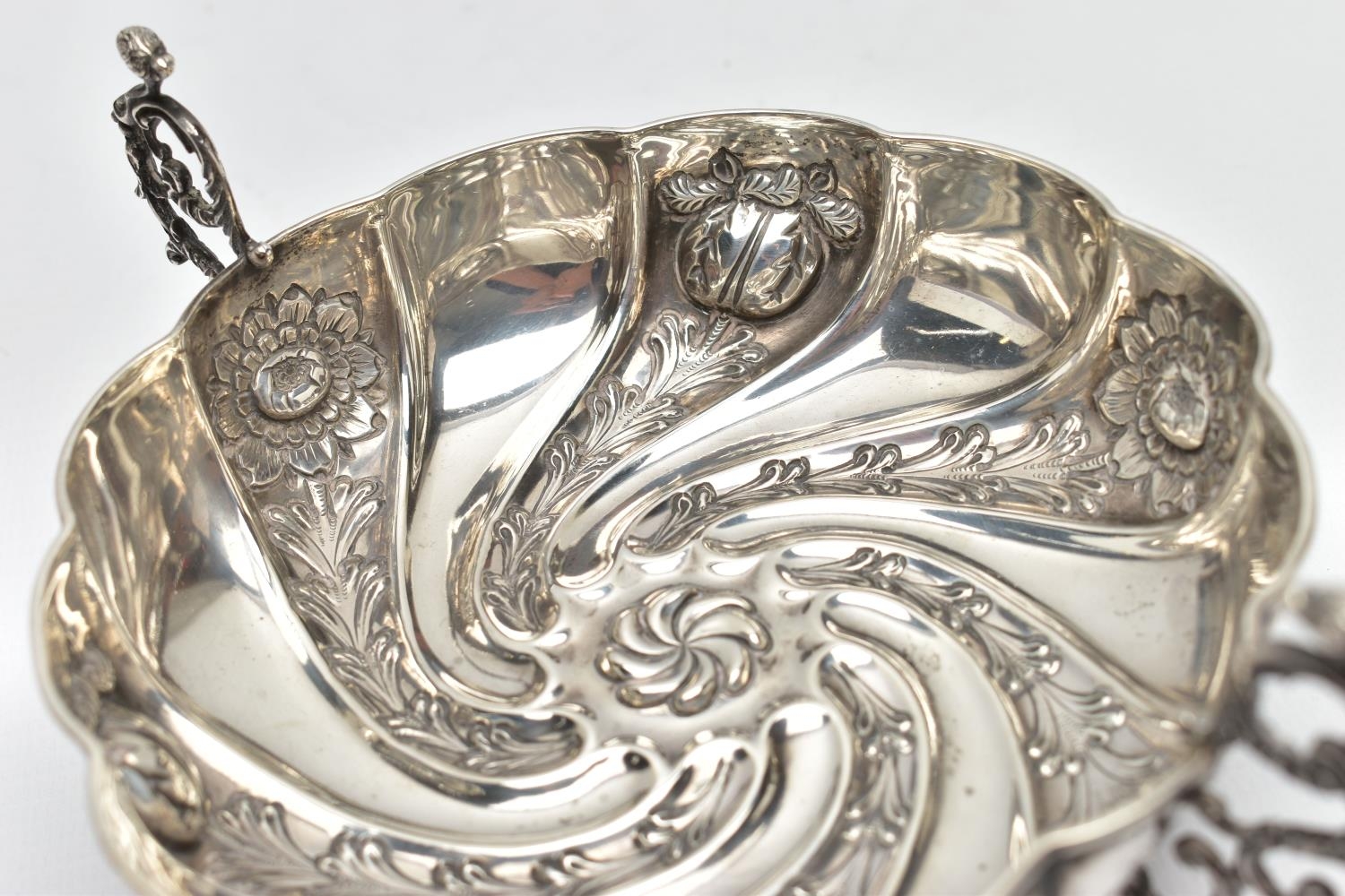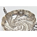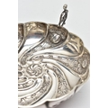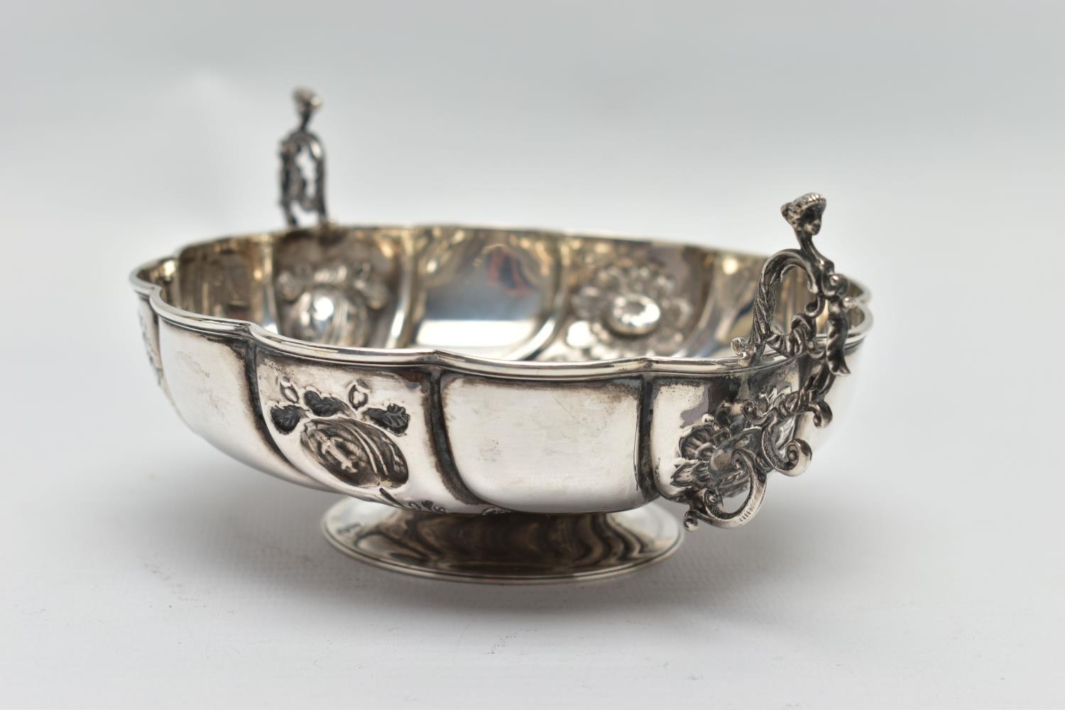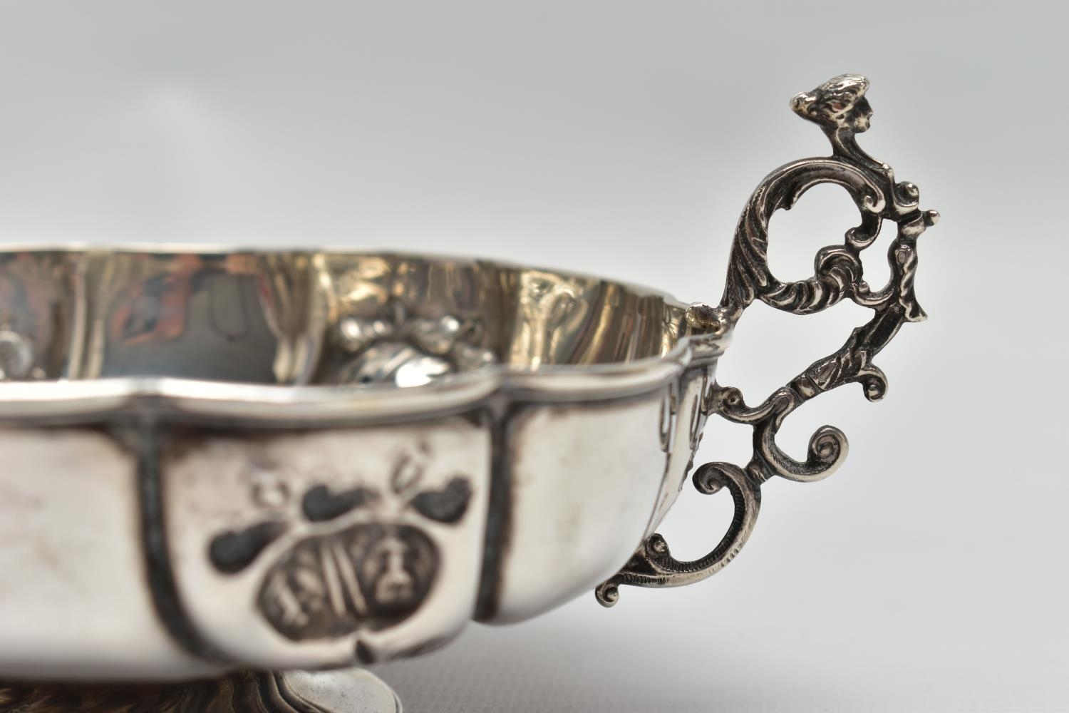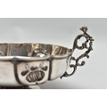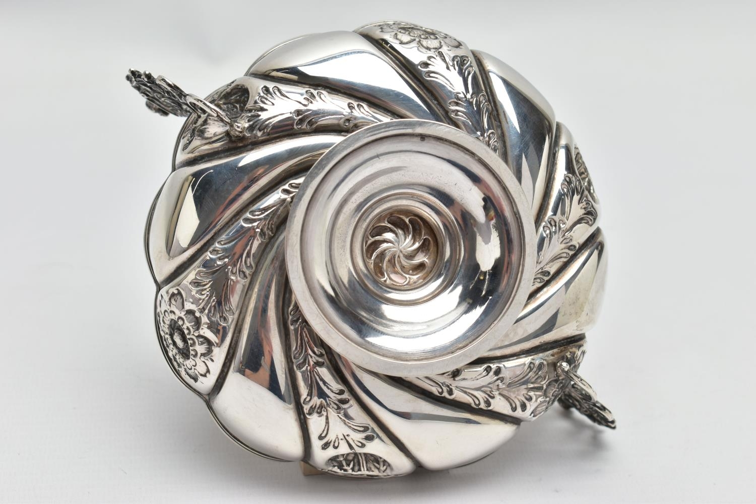 A PAIR OF LATE VICTORIAN OPEN SALTS OF CAULDRON FORM AND A LATE VICTORIAN TWIN HANDLED PEDESTAL BONBON DISH, the pair of salts with wavy reeded rims, floral repousse and chased decoration, vacant cartouche, on three cabriole legs with shell knees and hoof feet, maker Charles Stuart Harris, London 1892, 5.68ozt, 176.8 grams, the bonbon dish with cast scroll handles and the panelled swirl body repousse decorated with stemmed flowers, makers Carrington & Co (John Bodman Carrington), London 1899, 4.59ozt, 142.8 grams, gross weight of the three pieces 10.27ozt, 319.6 grams (3) (Condition report: one salt has all three of the hoof feet with slight upturns, this salt also has a dint to the cartouche, both show signs of use commensurate with age, the bonbon dish is in good condition overall)