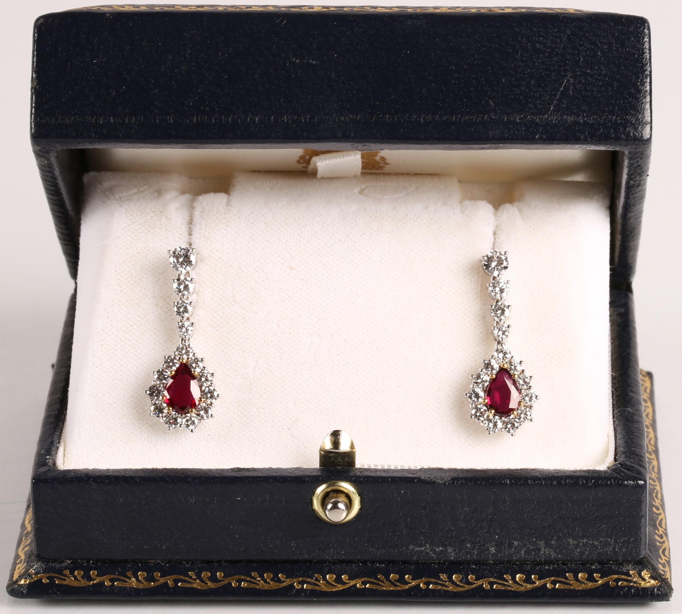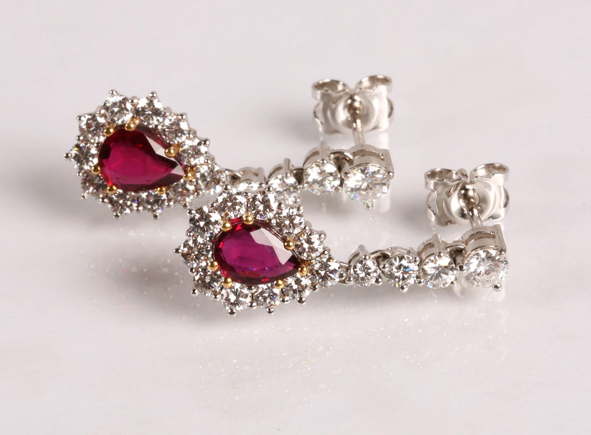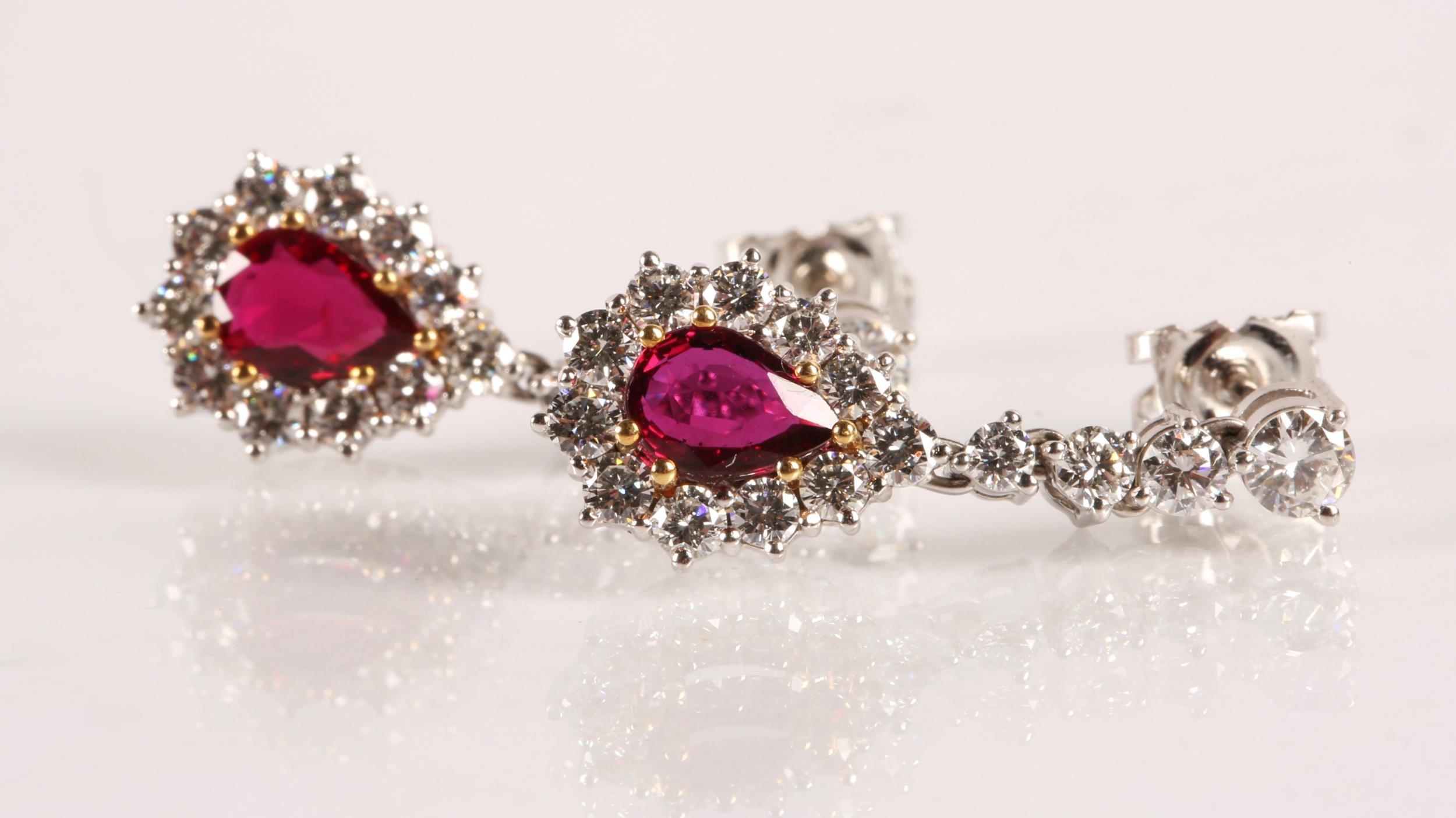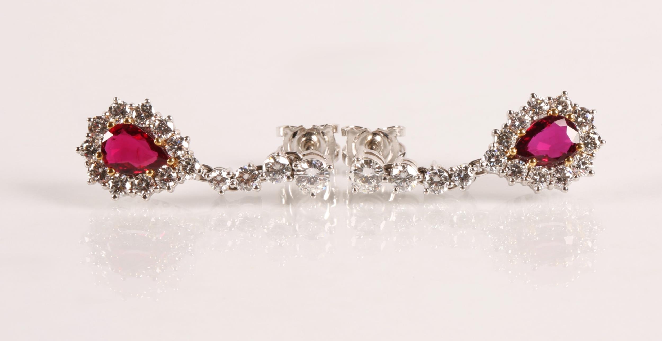 Magnificent pair of 18ct white gold Ruby and Diamond pear shape cluster drop earrings, central pear shape Ruby bordered by eleven round brilliant cut diamonds, the drop cluster suspended by four brilliant cut diamonds set in a line, made by Hamilton Inches, Edinburgh, in fitted case