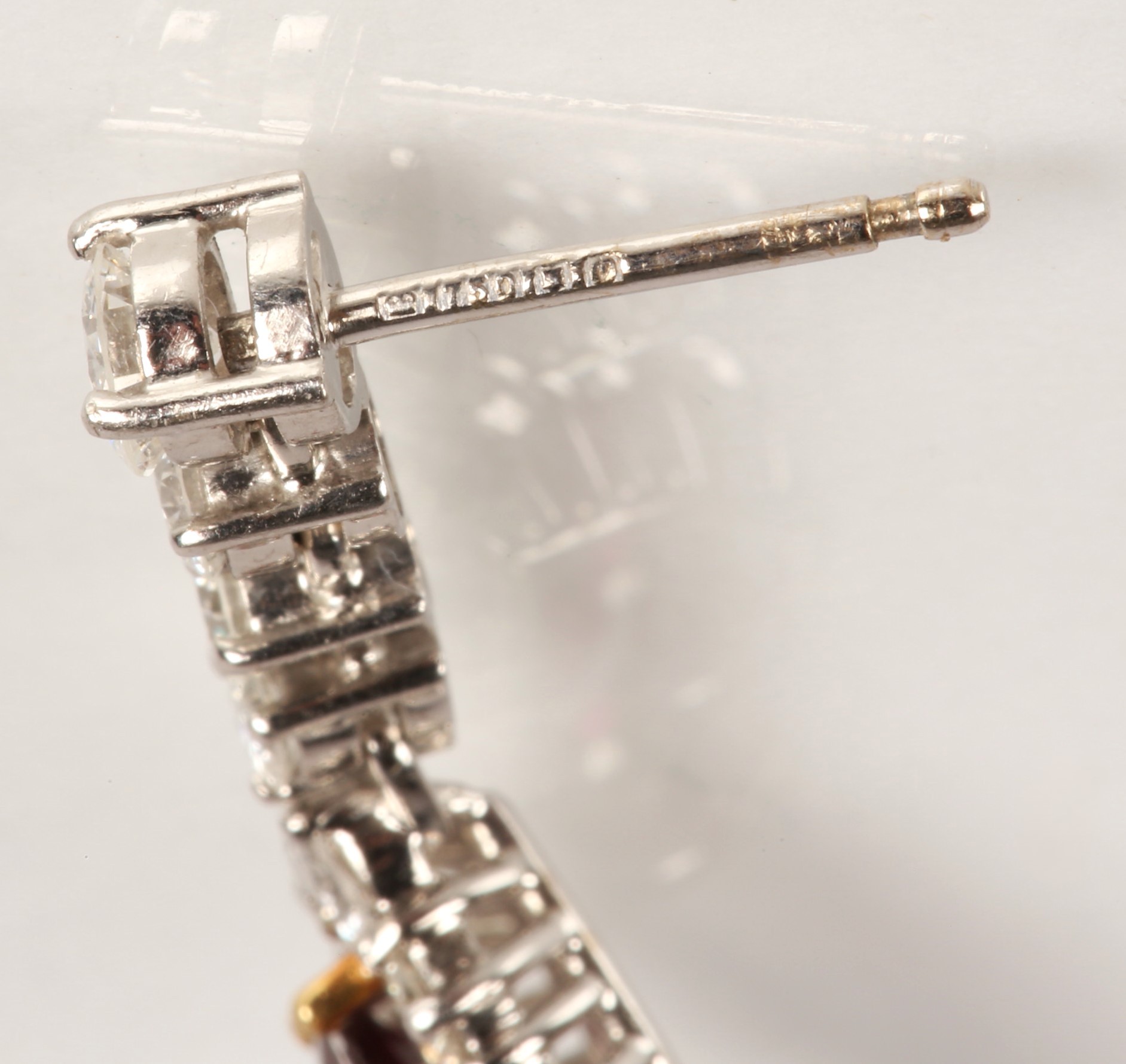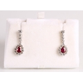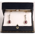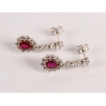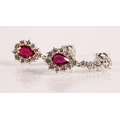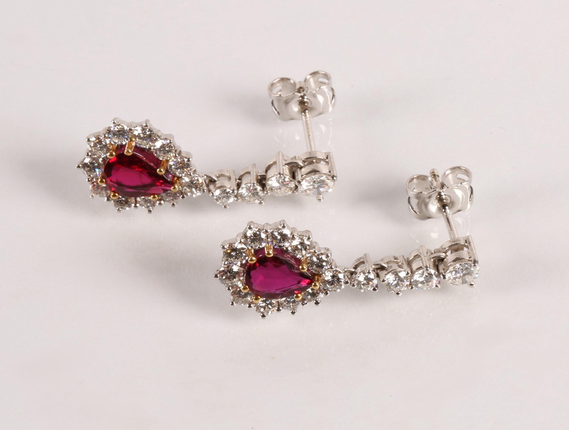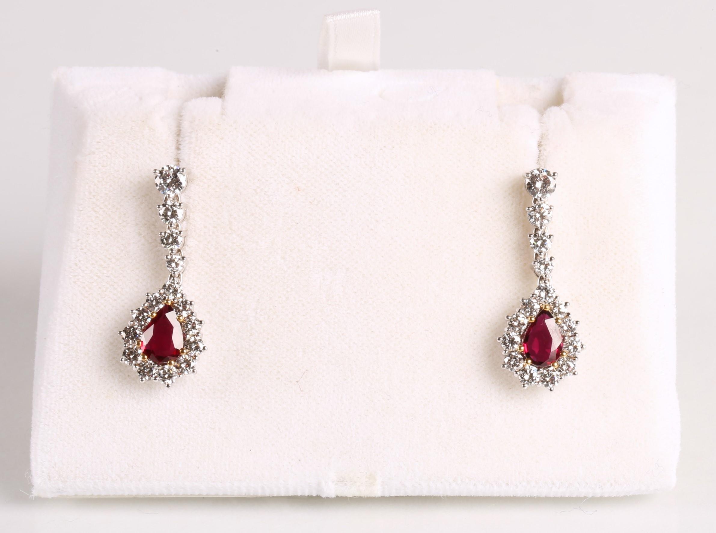 Magnificent pair of 18ct white gold Ruby and Diamond pear shape cluster drop earrings, central pear shape Ruby bordered by eleven round brilliant cut diamonds, the drop cluster suspended by four brilliant cut diamonds set in a line, made by Hamilton Inches, Edinburgh, in fitted case
