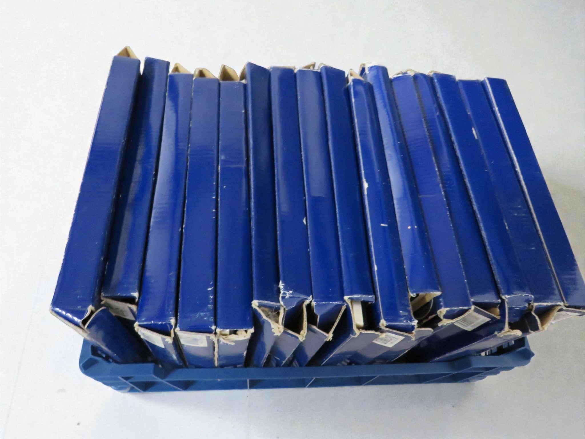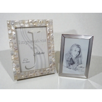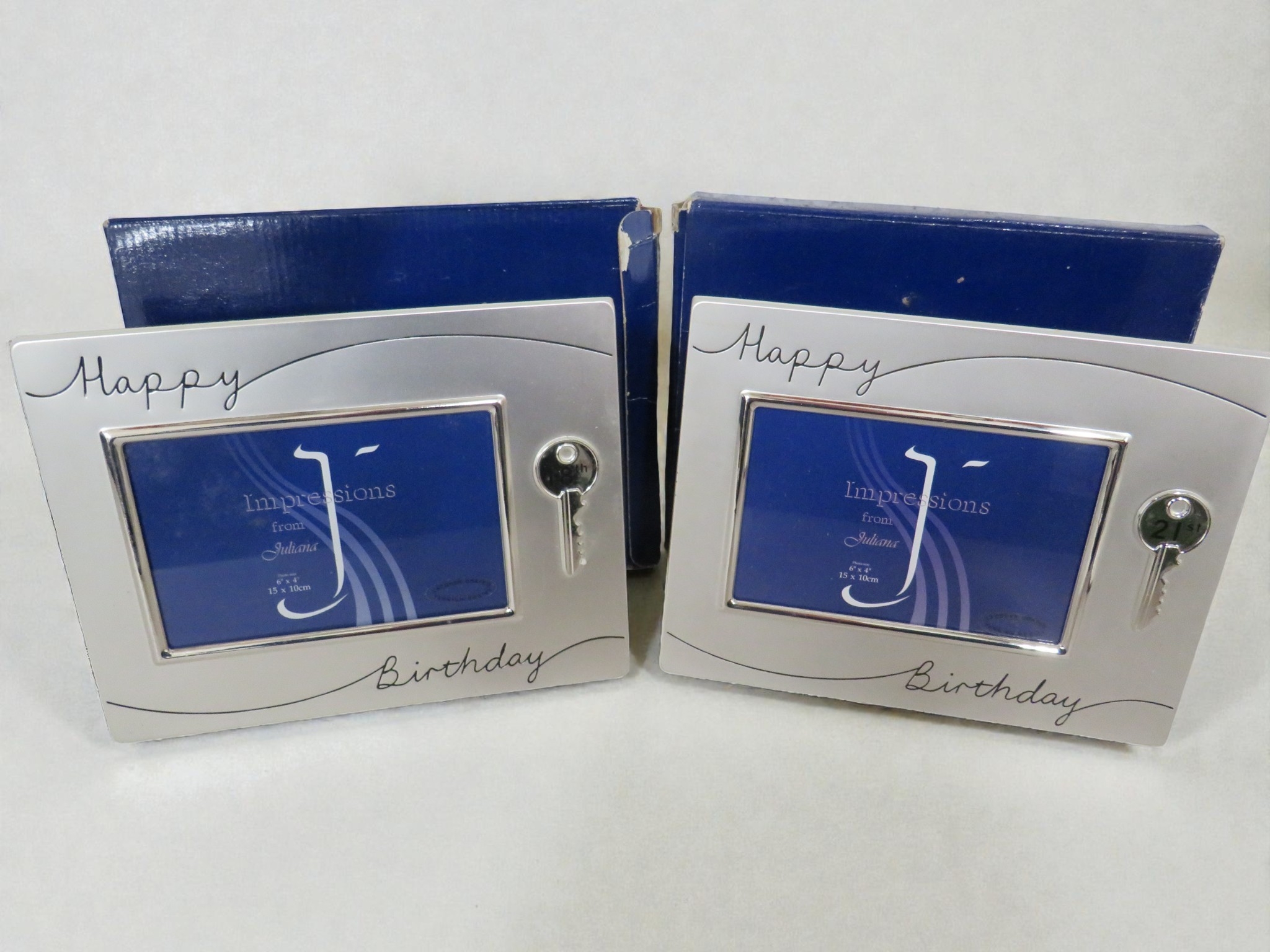 Collection of milestone birthday photo frames comprising 8 frames marked for Age 21 and 10 frames marked for Age 18, totaling 18 pieces. All are "Impressions by Juliana" branded items, new and unused in original boxes. The frames feature silver-effect metal construction with "Happy Birthday" text engraved or embossed on the border, and include decorative 21 key or 18 key charms attached as embellishment. Blue presentation boxes show some minor shelf wear but contents appear pristine. Frame size approximately 4" x 6" suitable for standard photos. Contemporary manufacture with quality feel appropriate for gift giving. Strong retail potential for card shops, gift retailers, or party supply outlets. The specific age theming makes these ideal for milestone birthday celebrations. All boxed as new - excellent lot for trade buyers or retailers specializing in occasion gifts.