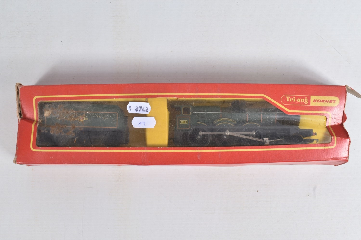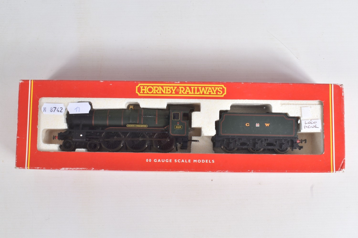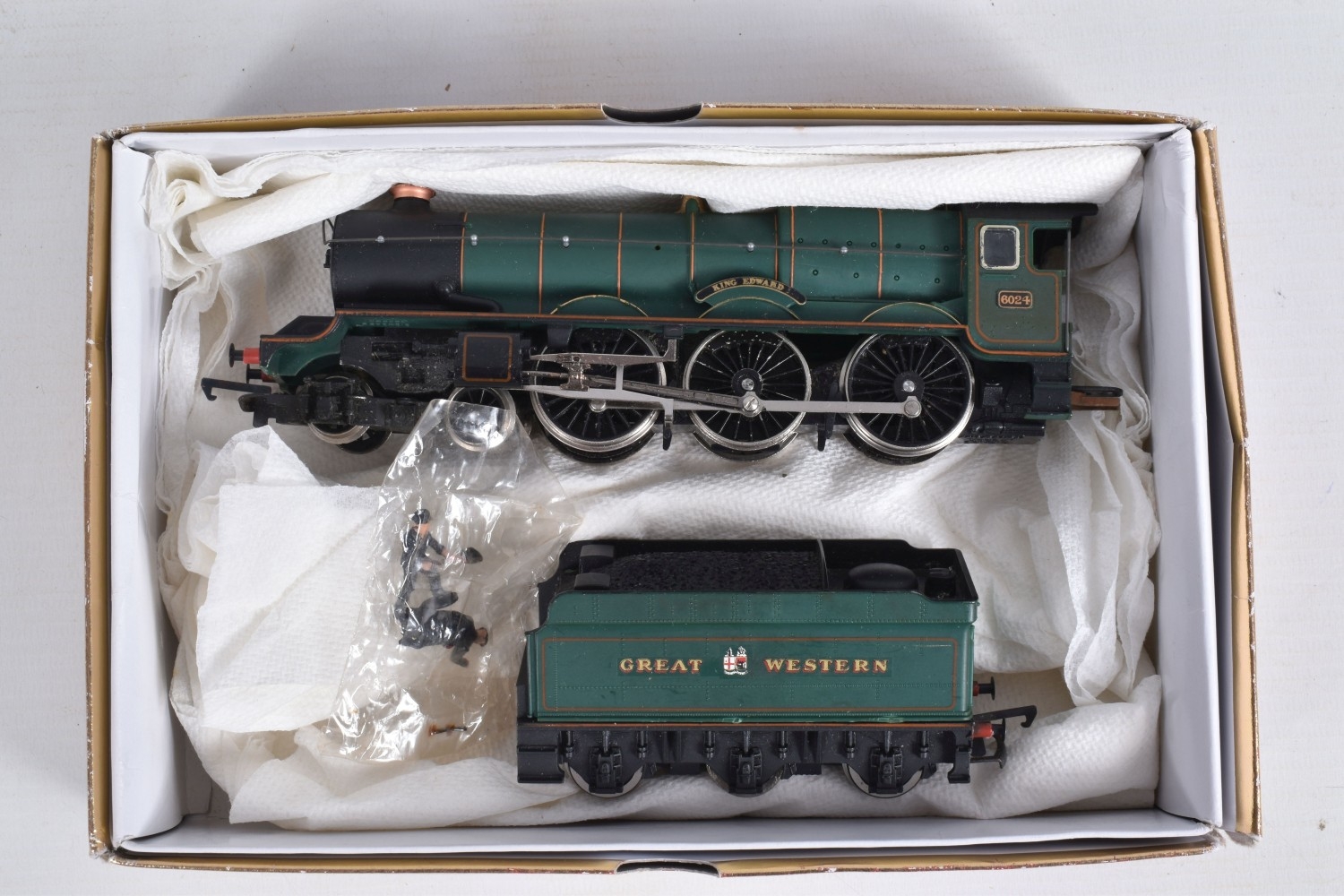 FIVE BOXED/PART BOXED OO GAUGE LOCOMOTIVES OF G.W.R. ORIGIN, Tri-ang 'Dean's Single' 'Lord of the Isles' No.3046, slight damage to tender (R354/R37), damaged part boxed (base only) Mainline 'Collett Goods' No.3205 (37058), Hornby County class 'County of Worcester' No.1029 (R2085), Hornby King class 'King Edward I' No.6024, wear to nameplate on one side (R78), all in G.W.R. green livery and damaged Tri-ang Hornby Hall class 'Albert Hall' No.4983, B.R. green livery (R759/R760), all appear in fairly good condition except as noted above, County & Hall in original boxes both with some wear and damage, Lord of the Isles and King class in replacement boxes