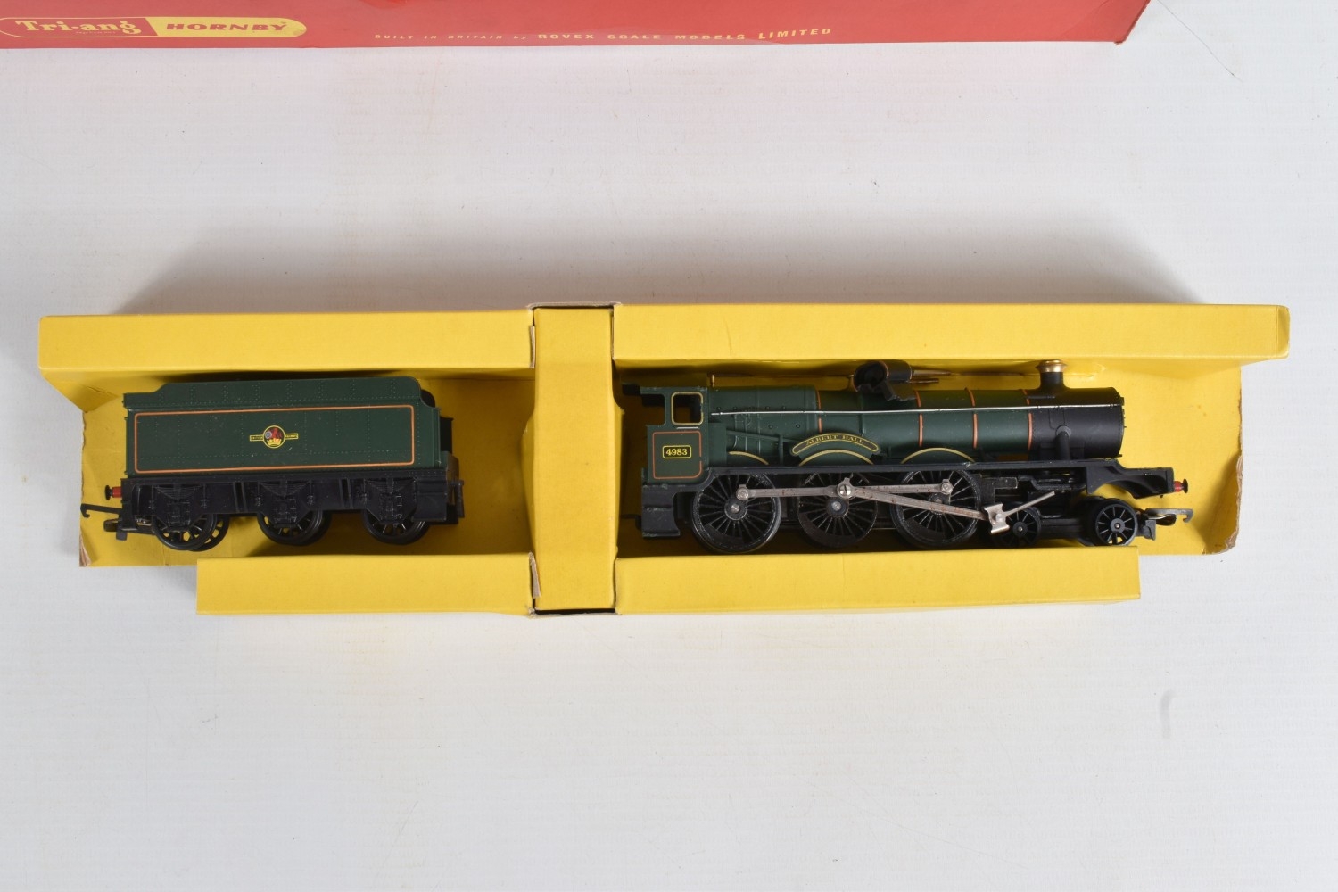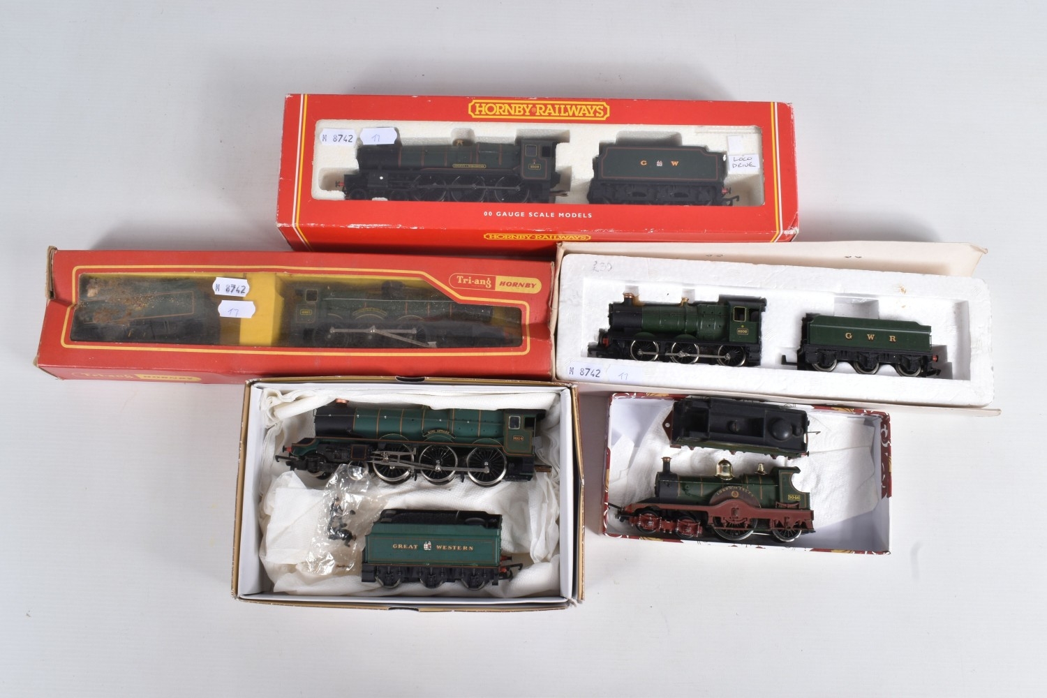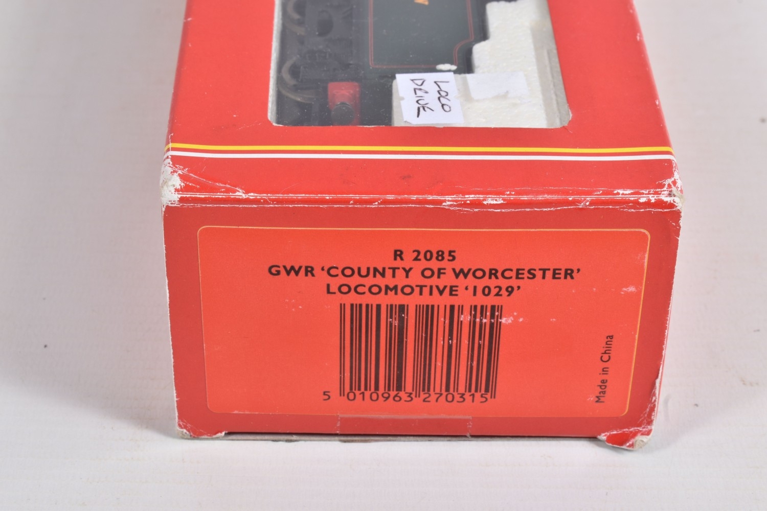 FIVE BOXED/PART BOXED OO GAUGE LOCOMOTIVES OF G.W.R. ORIGIN, Tri-ang 'Dean's Single' 'Lord of the Isles' No.3046, slight damage to tender (R354/R37), damaged part boxed (base only) Mainline 'Collett Goods' No.3205 (37058), Hornby County class 'County of Worcester' No.1029 (R2085), Hornby King class 'King Edward I' No.6024, wear to nameplate on one side (R78), all in G.W.R. green livery and damaged Tri-ang Hornby Hall class 'Albert Hall' No.4983, B.R. green livery (R759/R760), all appear in fairly good condition except as noted above, County & Hall in original boxes both with some wear and damage, Lord of the Isles and King class in replacement boxes