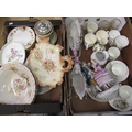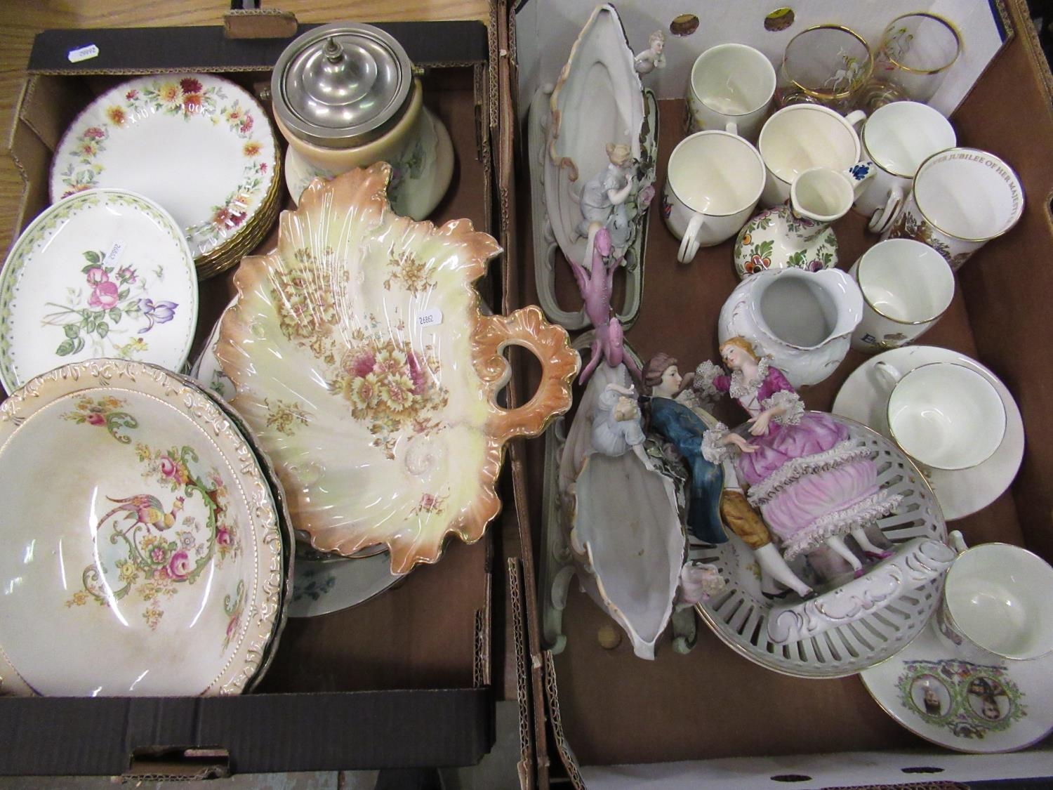 C20th Dresden style bisque decorative sleigh ornaments, decorated with young ladies and putti, C20th Dresden style bisque group of a dancing couple, Coronation commemorative ceramics, Victorian biscuit barrel with silver plated handle, similar shell shaped dish and other decorative ceramics (2 boxes)