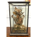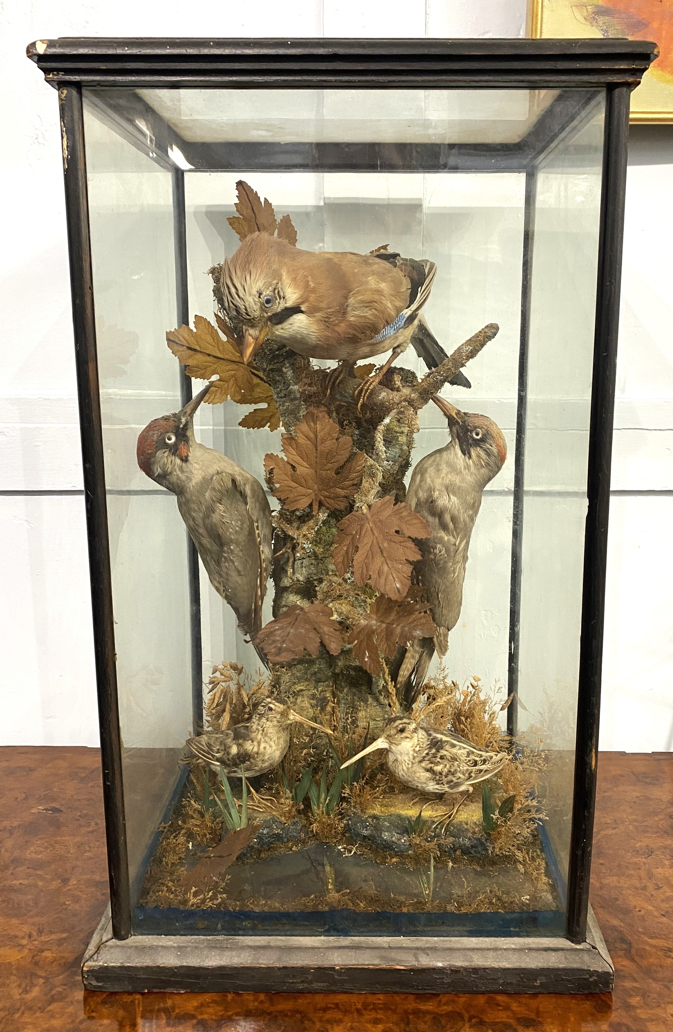 Taxidermy: a group of British domestic birds, a Jay, two Woodpeckers and two Snipe, dispayed with natural habitat within a glass panelled case, 65cm high by 38cm wide by 34cm deep.