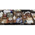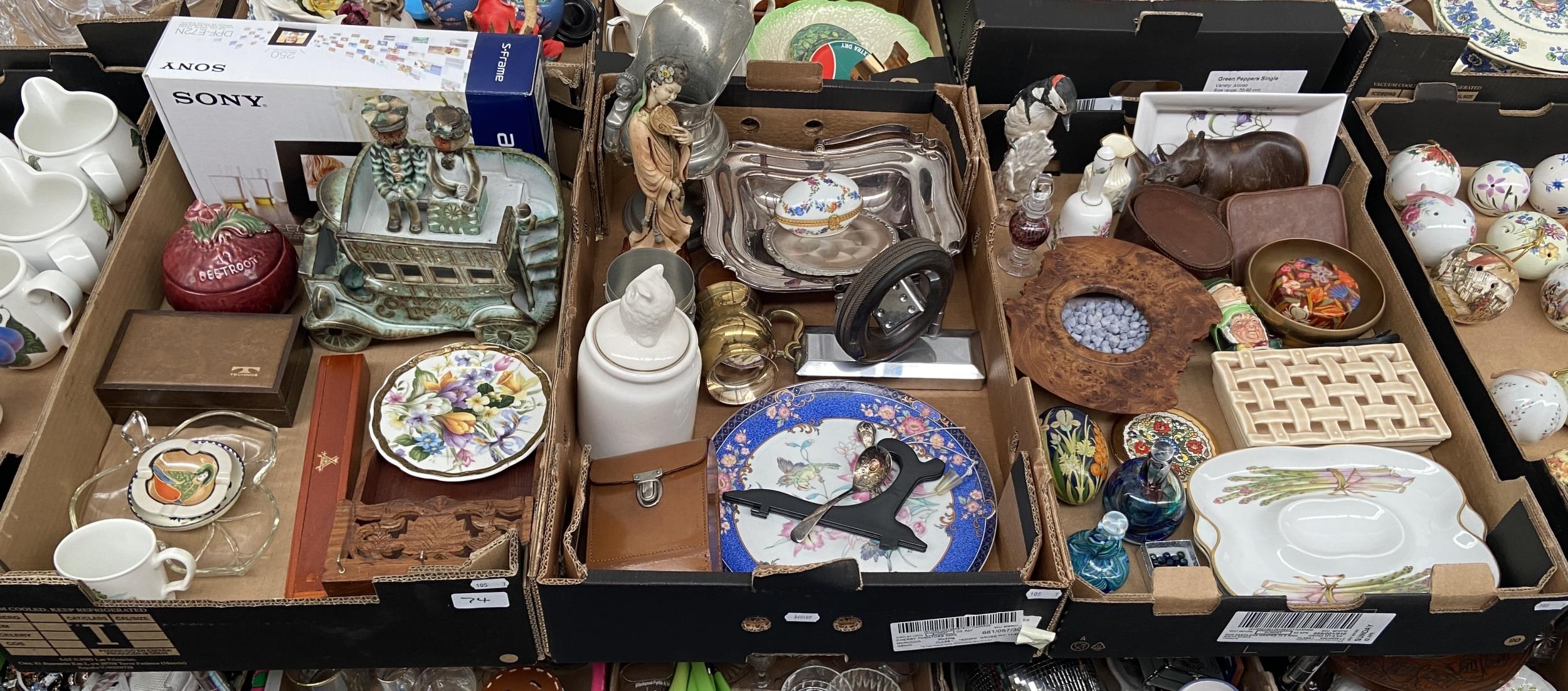 3 Boxes containing art glass, ornaments and a Michelin desk tidy etc