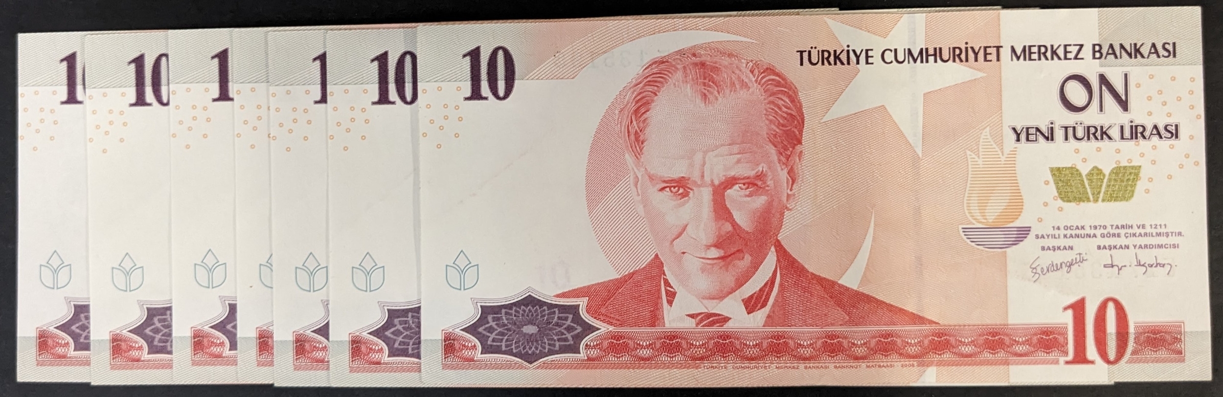 Banknotes; Turkey; 2005 10 New Lira - seven consecutive note...