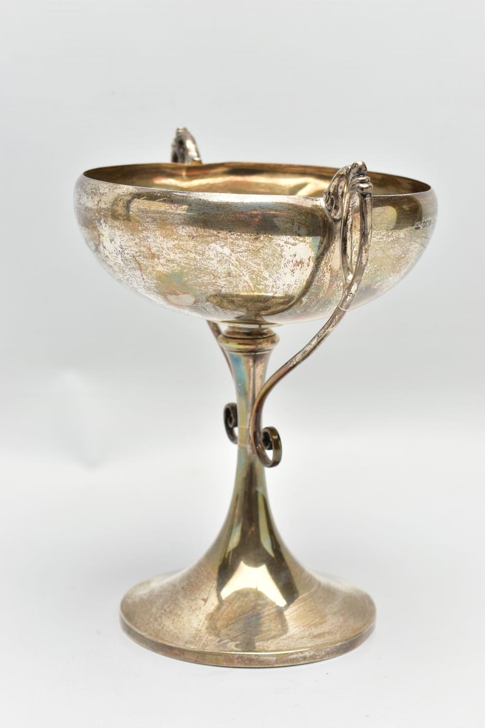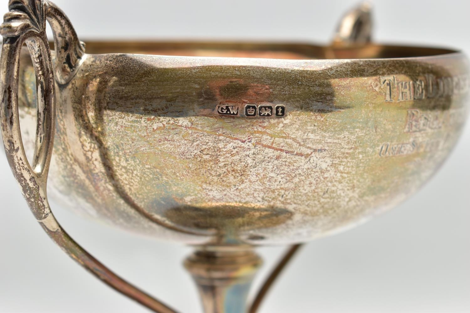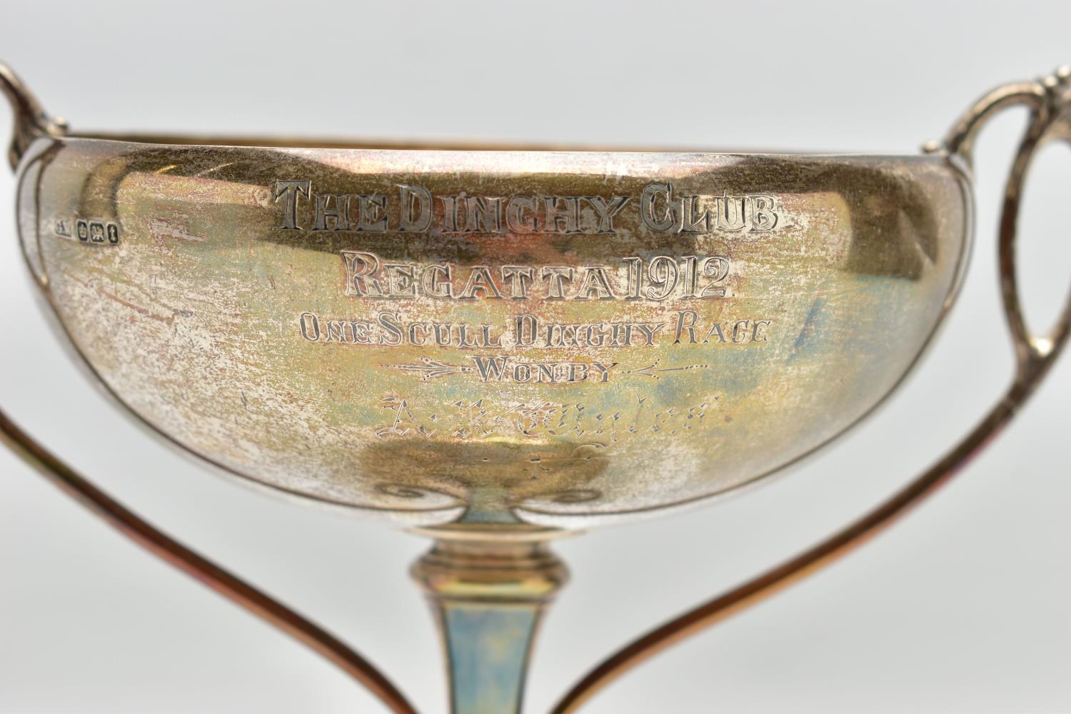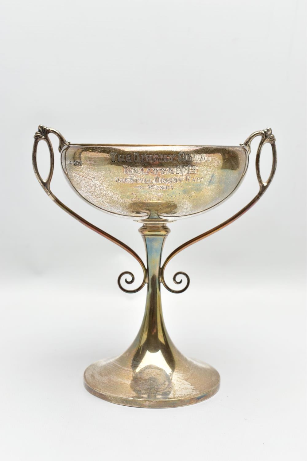 A GEORGE V SILVER TWIN HANDLED TROPHY CUP, the shallow silver cup on a slender pedestal with cast scrolling handles, bears presentation inscription 'THE DINGHY CLUB REGATTA 1912 ONE SCULL DINGHY RACE WON BY A.R. WYLES', makers George Wish & Co Ltd, Sheffield 1911, 10.61ozt, 330 grams, height 19.5cm (Condition report: a few shallow dents to the rim and cup, a few shallow dents to the foot rim, sits fairly level on a flat surface)