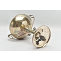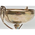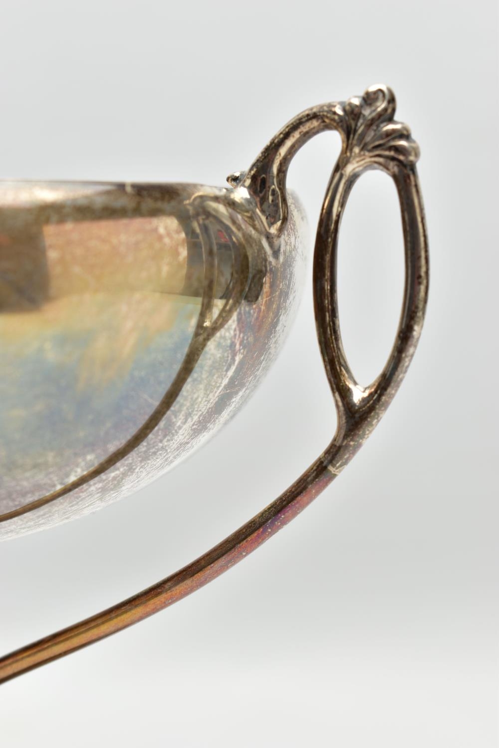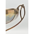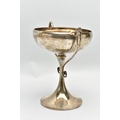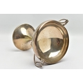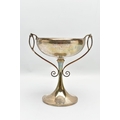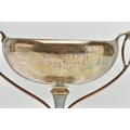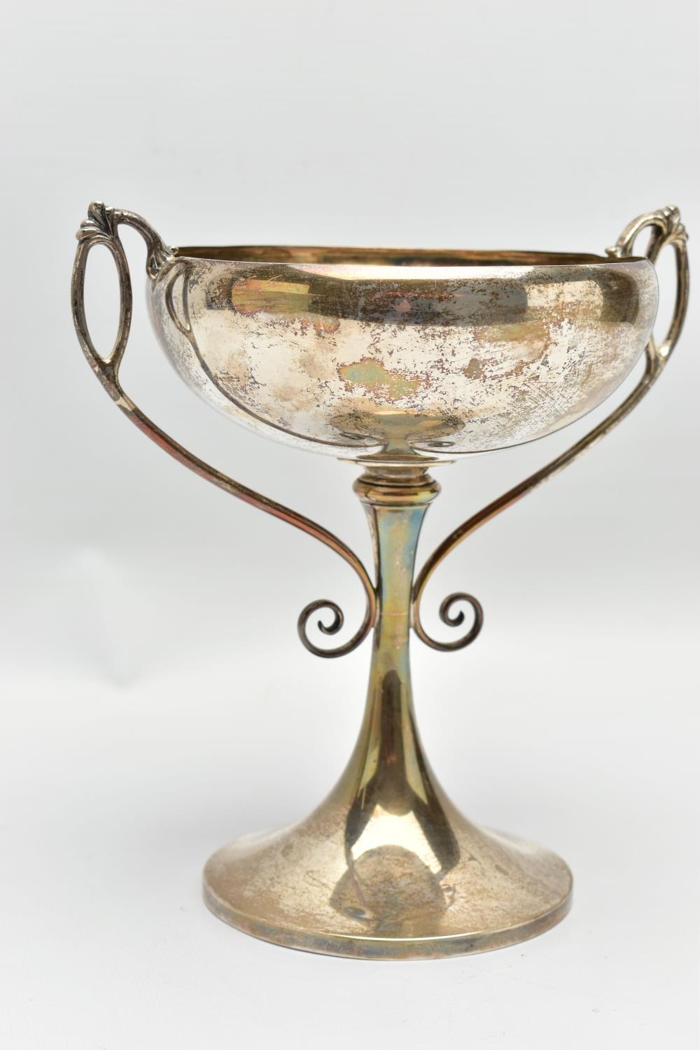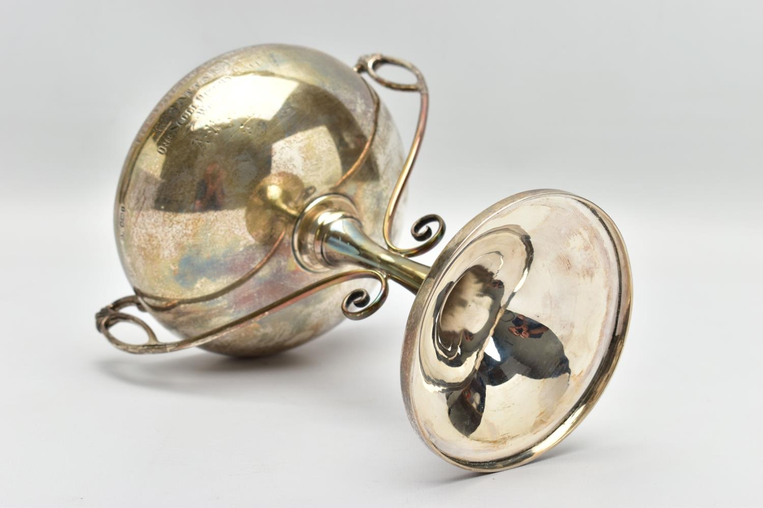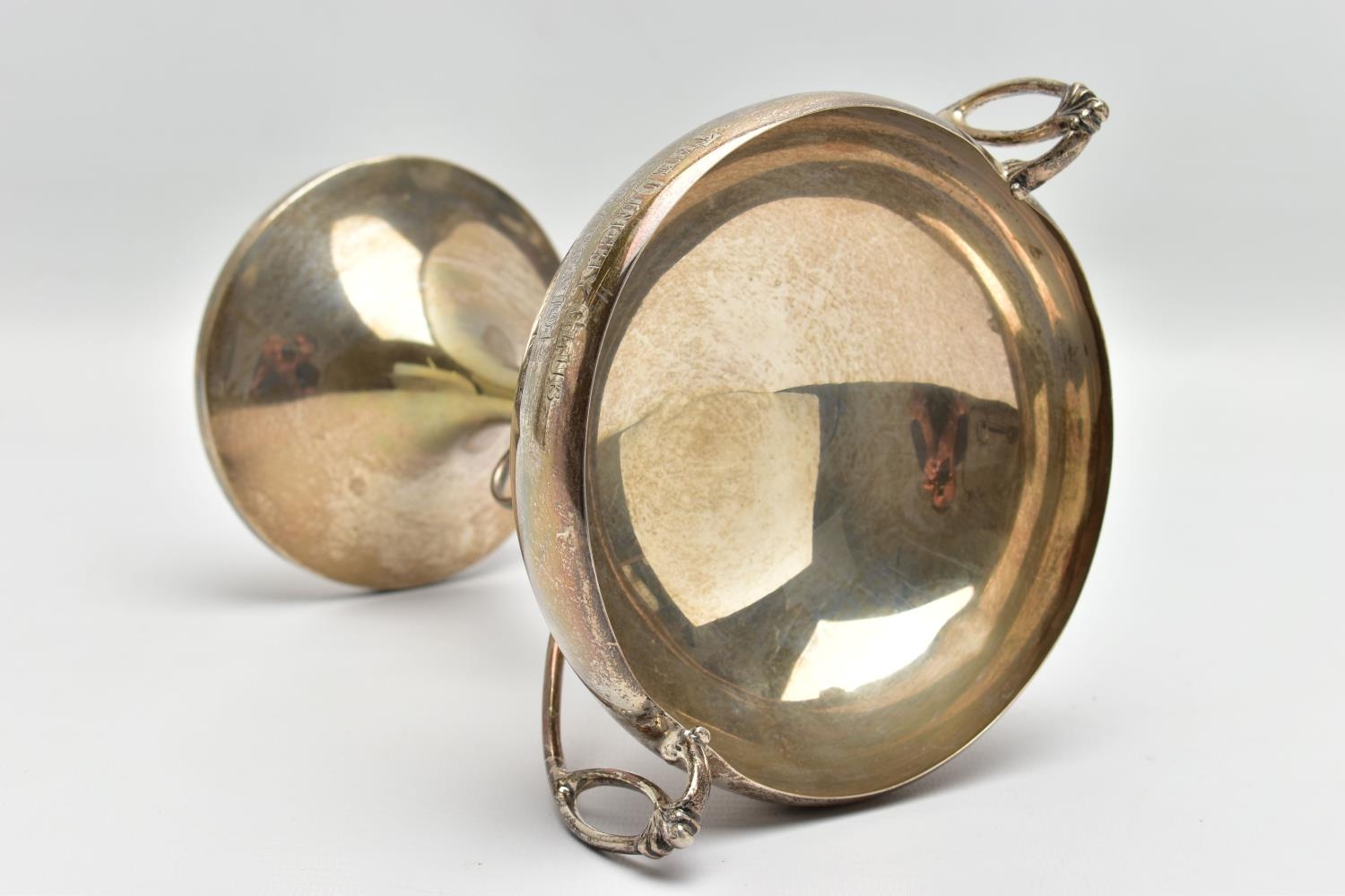 A GEORGE V SILVER TWIN HANDLED TROPHY CUP, the shallow silver cup on a slender pedestal with cast scrolling handles, bears presentation inscription 'THE DINGHY CLUB REGATTA 1912 ONE SCULL DINGHY RACE WON BY A.R. WYLES', makers George Wish & Co Ltd, Sheffield 1911, 10.61ozt, 330 grams, height 19.5cm (Condition report: a few shallow dents to the rim and cup, a few shallow dents to the foot rim, sits fairly level on a flat surface)