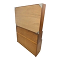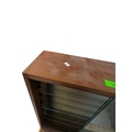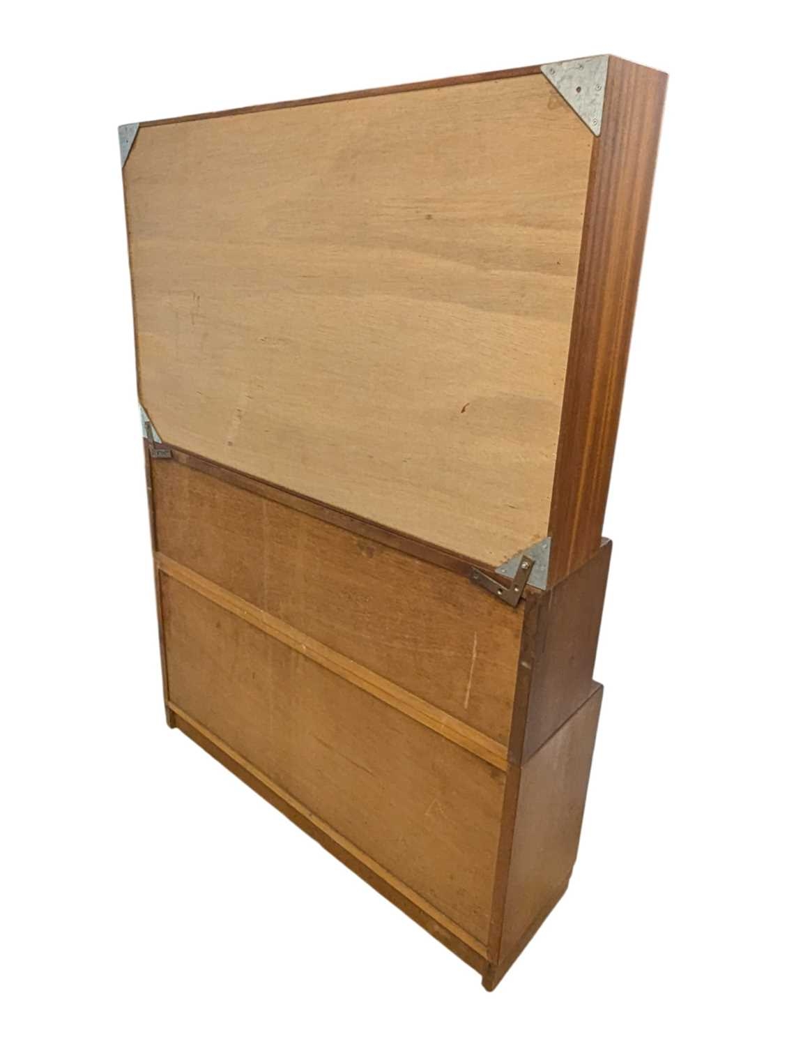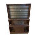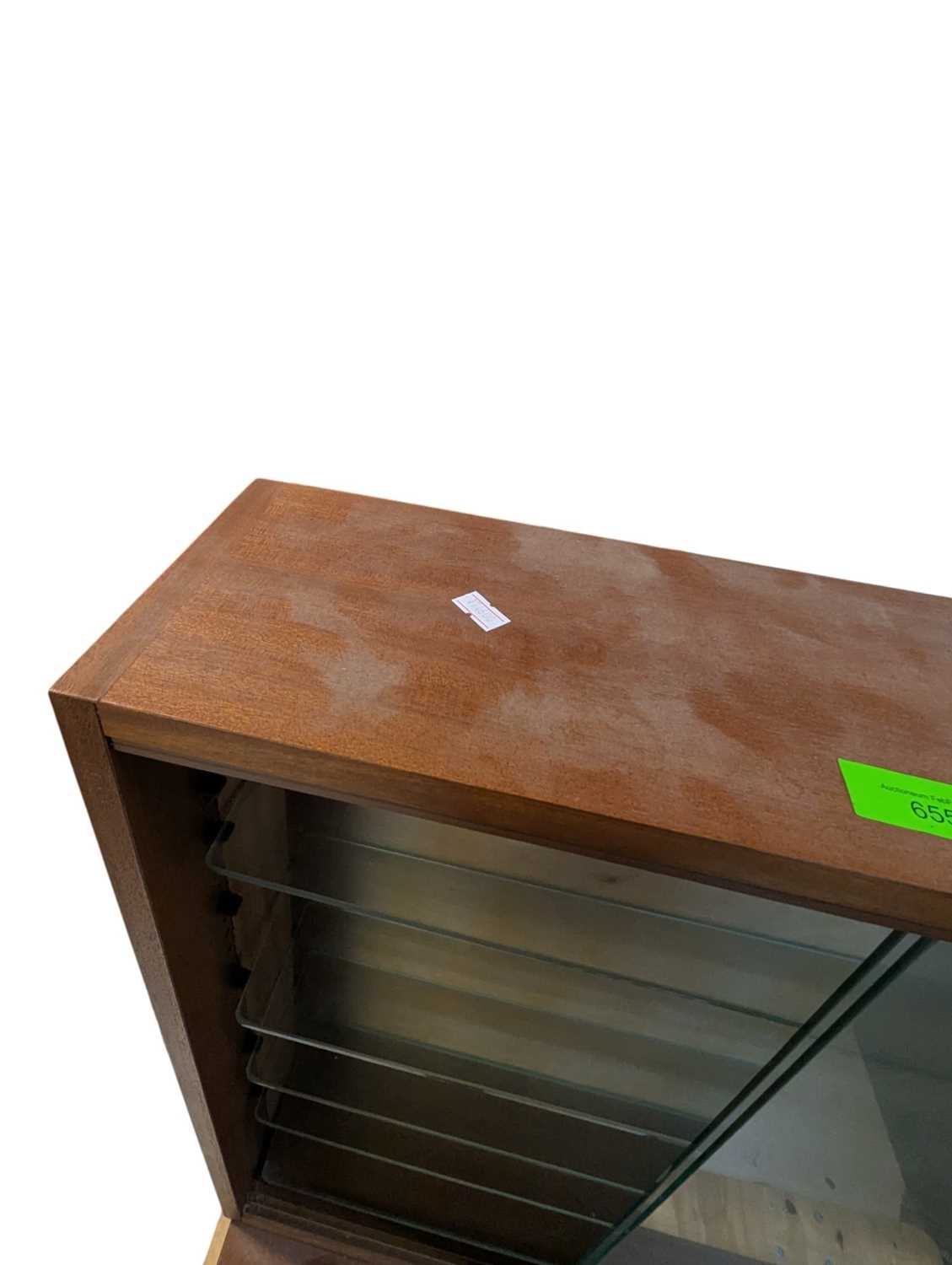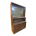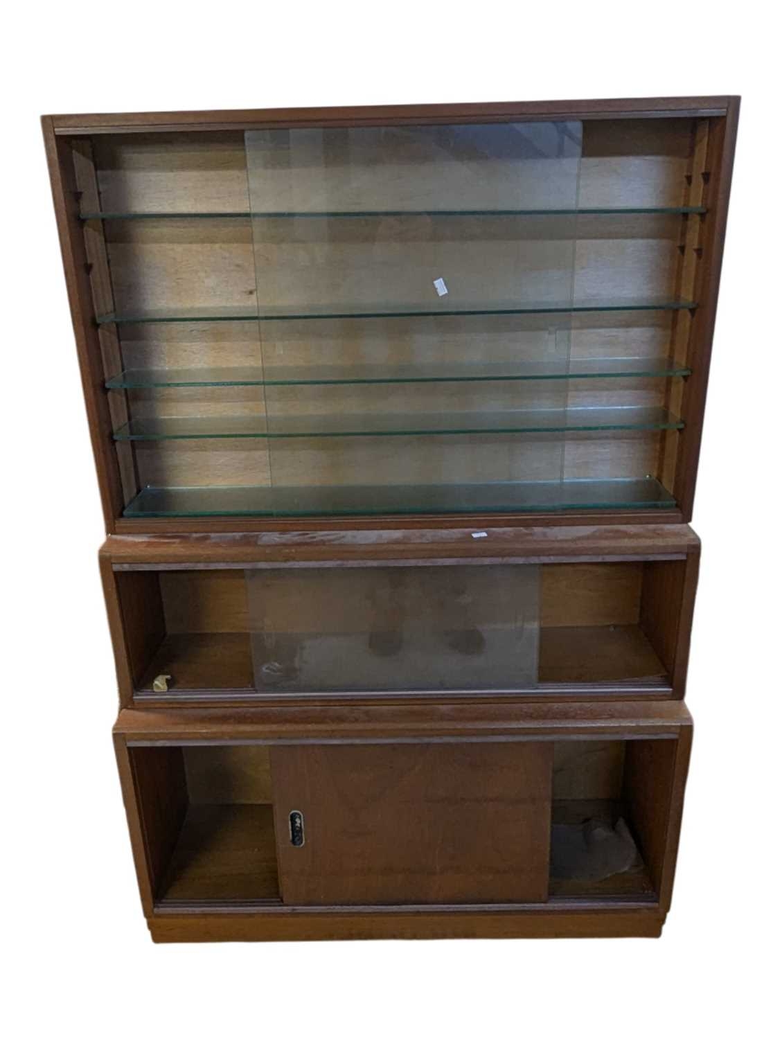 British Modern Design - A vintage 20th century teak stacking display cabinet bookcase. Rectangular form with a series of glass shelves behind twin sliding glass doors, above sliding wooden cabinets raised on plinth base. Measures approx: 135x93x28cm