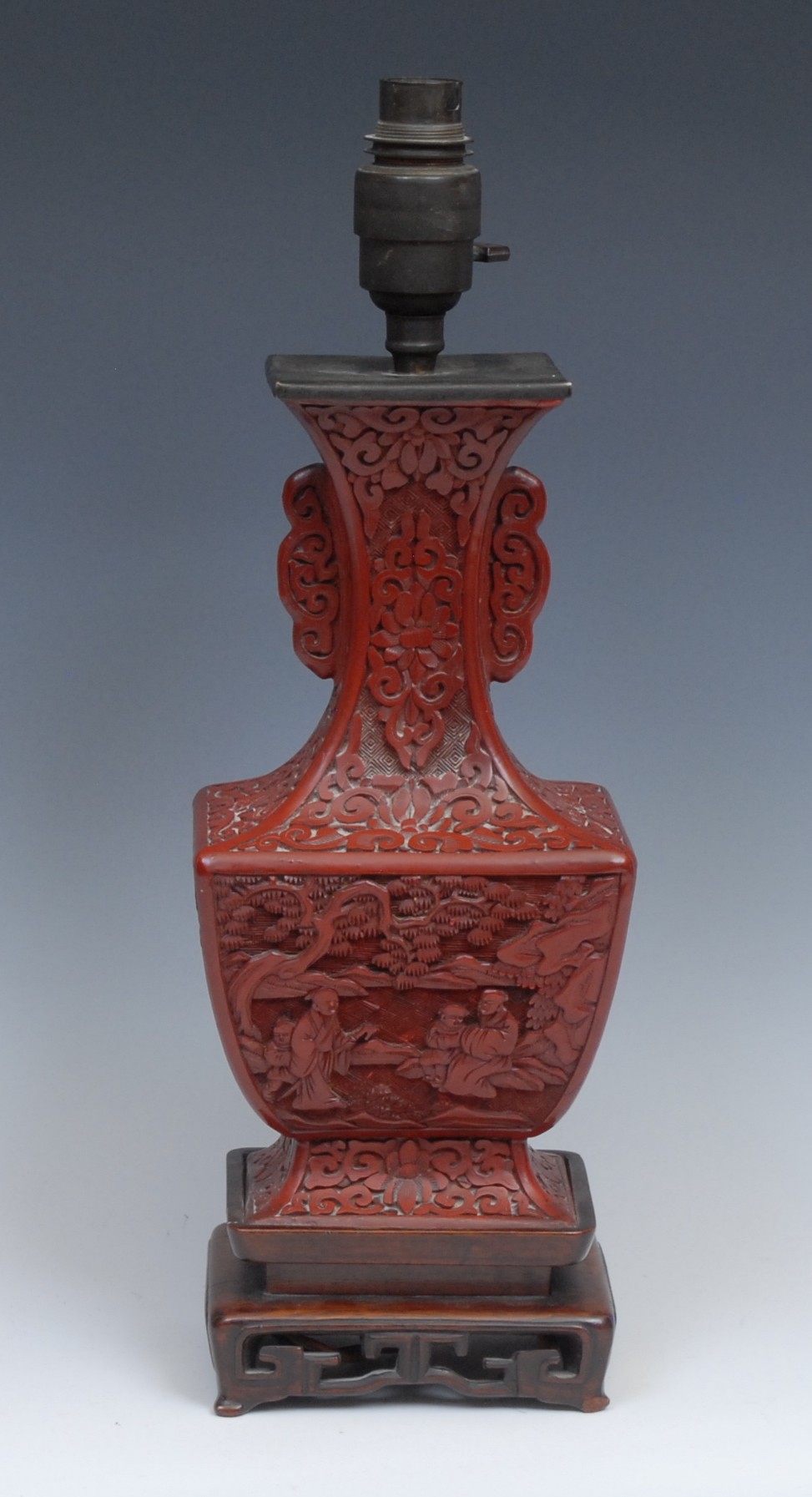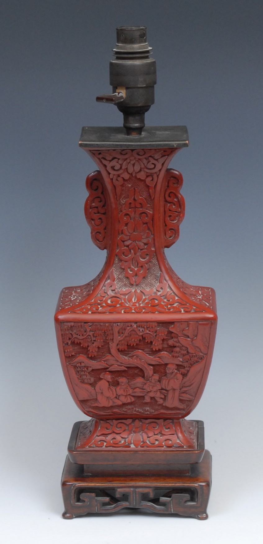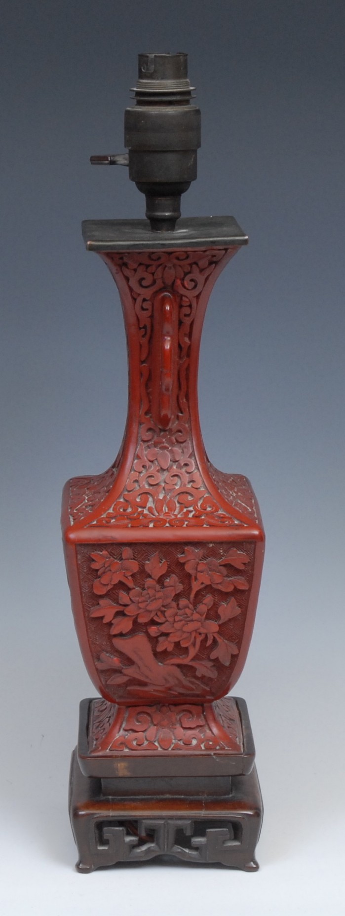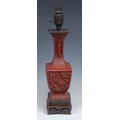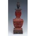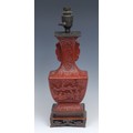 A Chinese cinnabar gu shaped vase, mounted as a table lamp, 31cm high under fitting, the fittings early 20th century