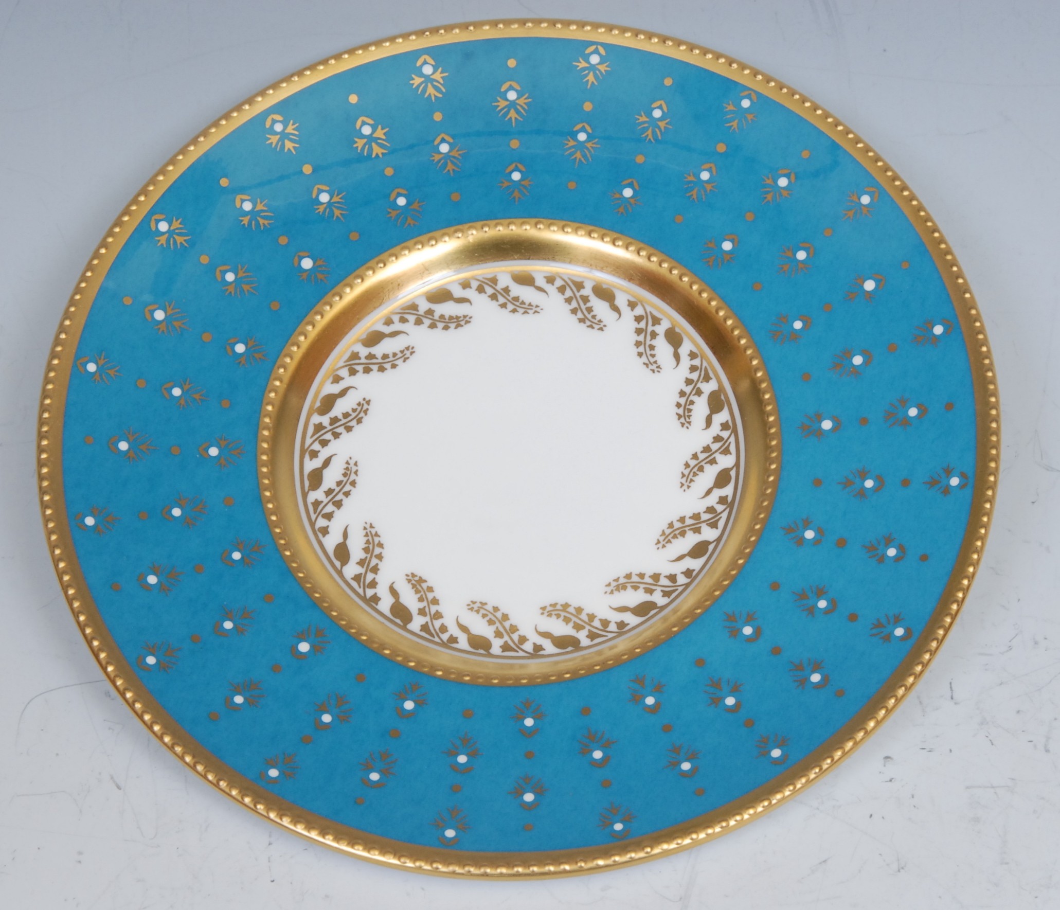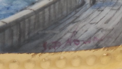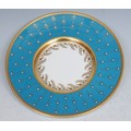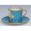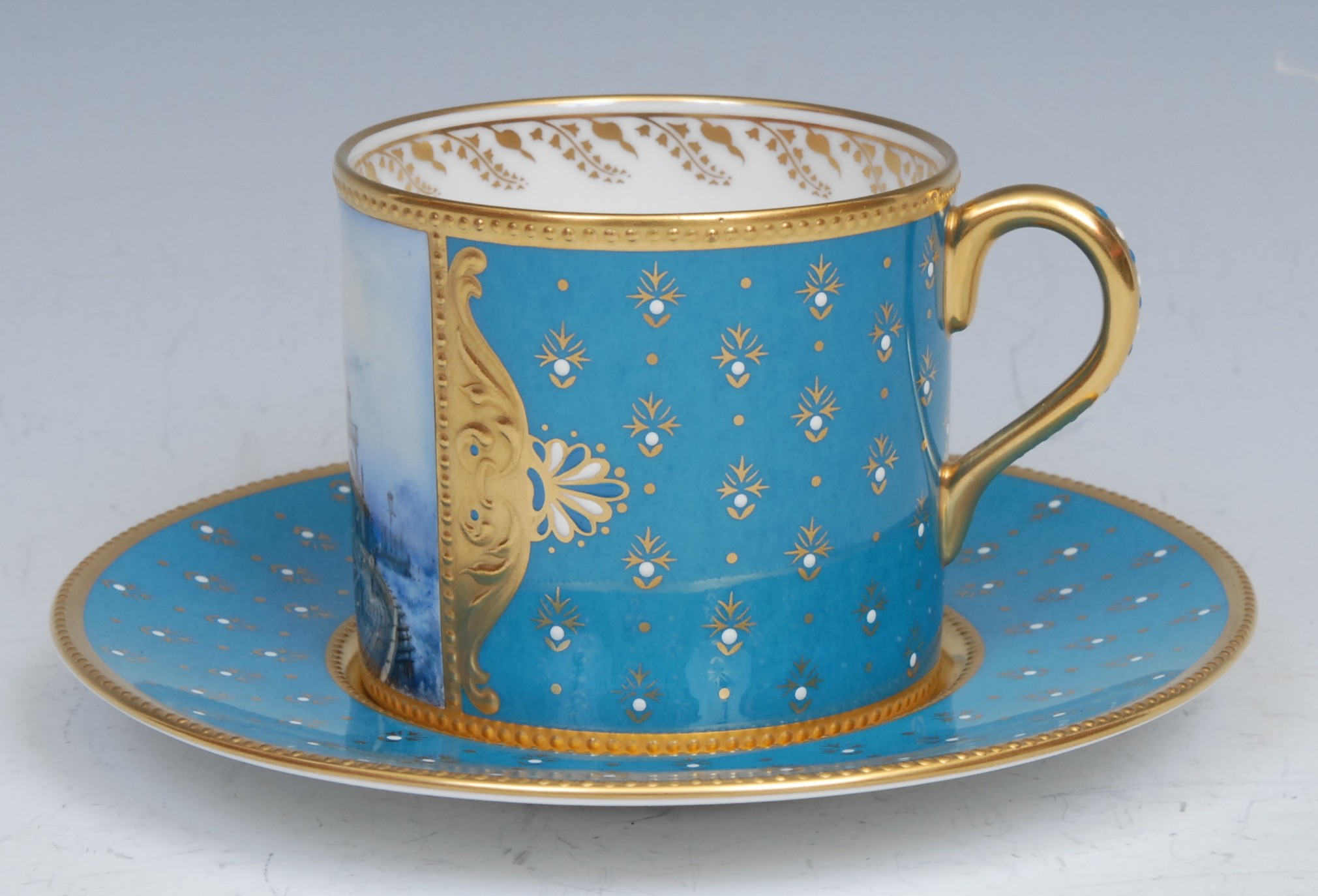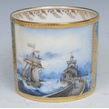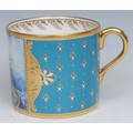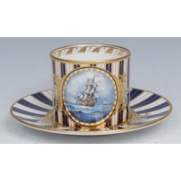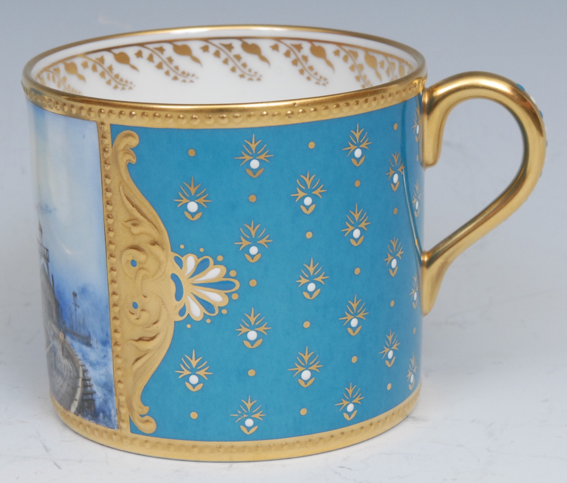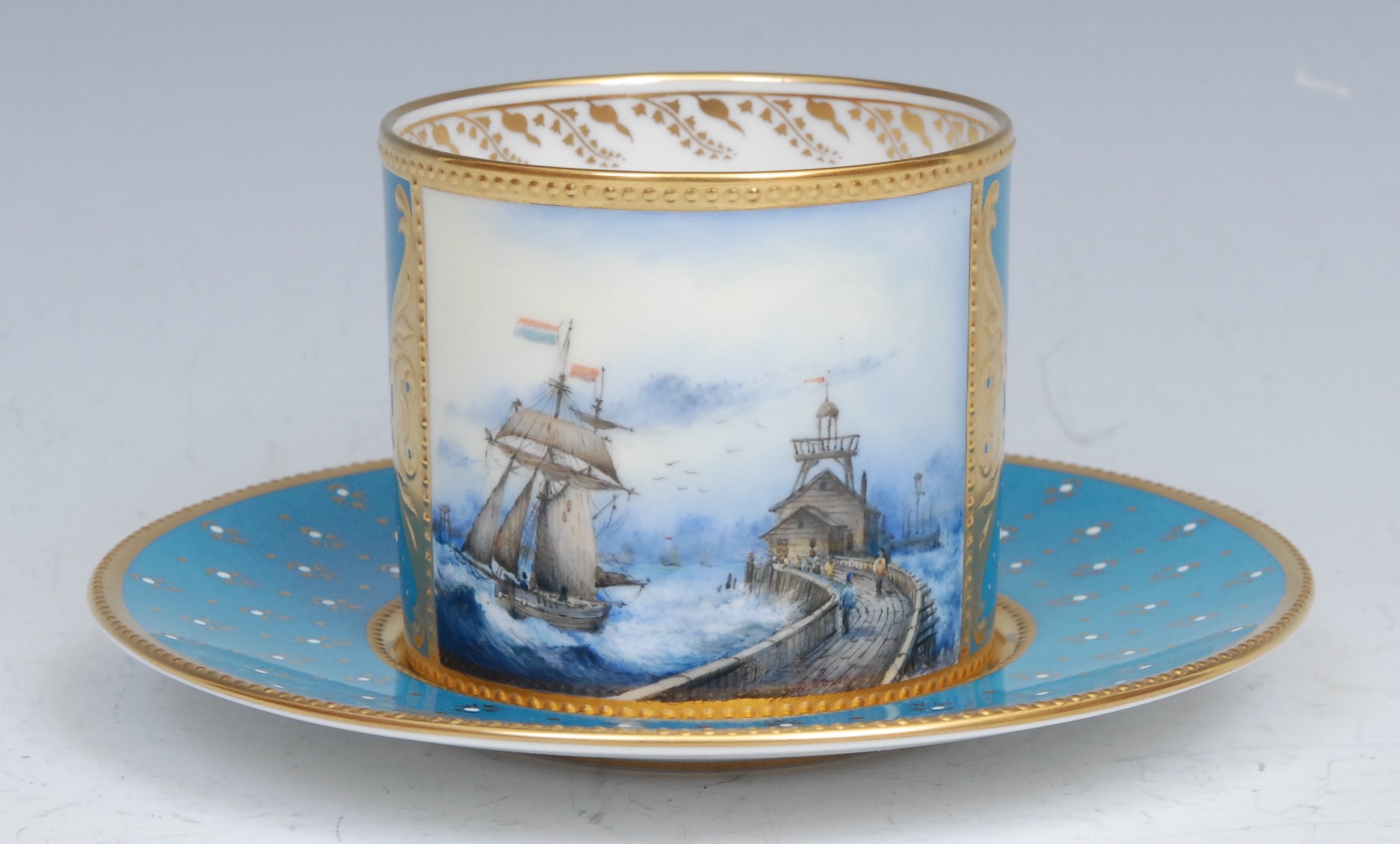 A Lynton coffee can and stand, painted by Stefan Nowacki, signed, with a seascape, tall ship near a pier, in a squall, on a jewelled turquoise ground, the saucer 14cm diam, printed mark