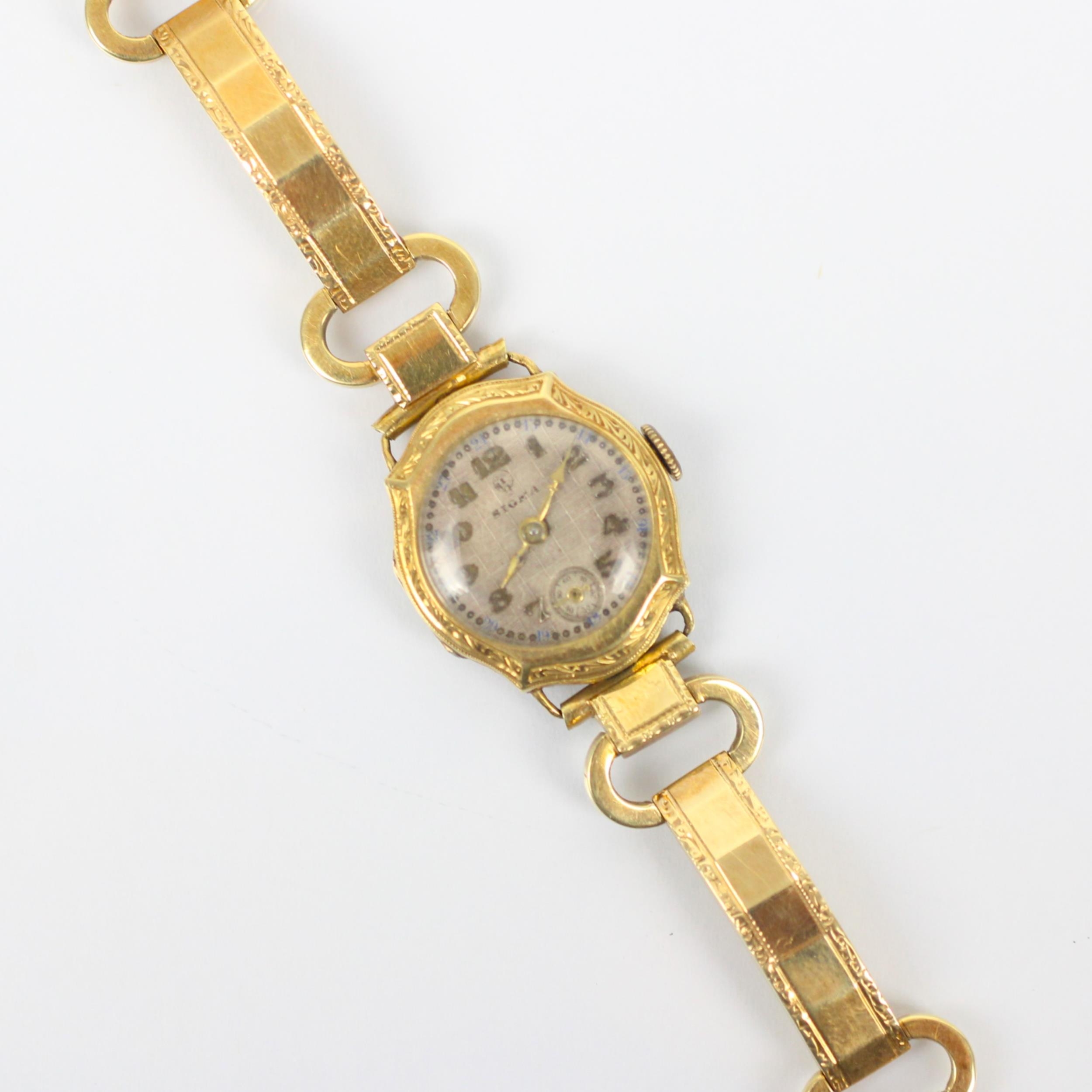 An early 20th century yellow metal wristwatch, the circular dial with Arabic numerals and subsidiary dial to 6 o'clock, set to plain polished case stamped '0.585' upon integral hollow yellow metal bracelet, 15cm long, 14gms (including movement)