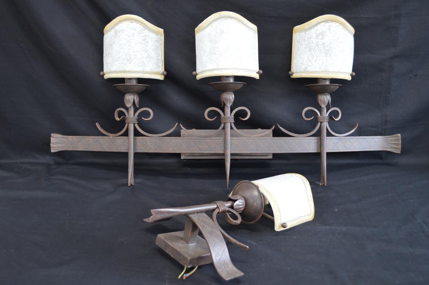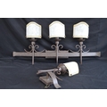 Modern Gothic style three sconce electric wall light having frosted glass bow shades - 96cm x 43cm tall together with matching single sconce wall light