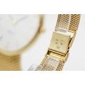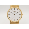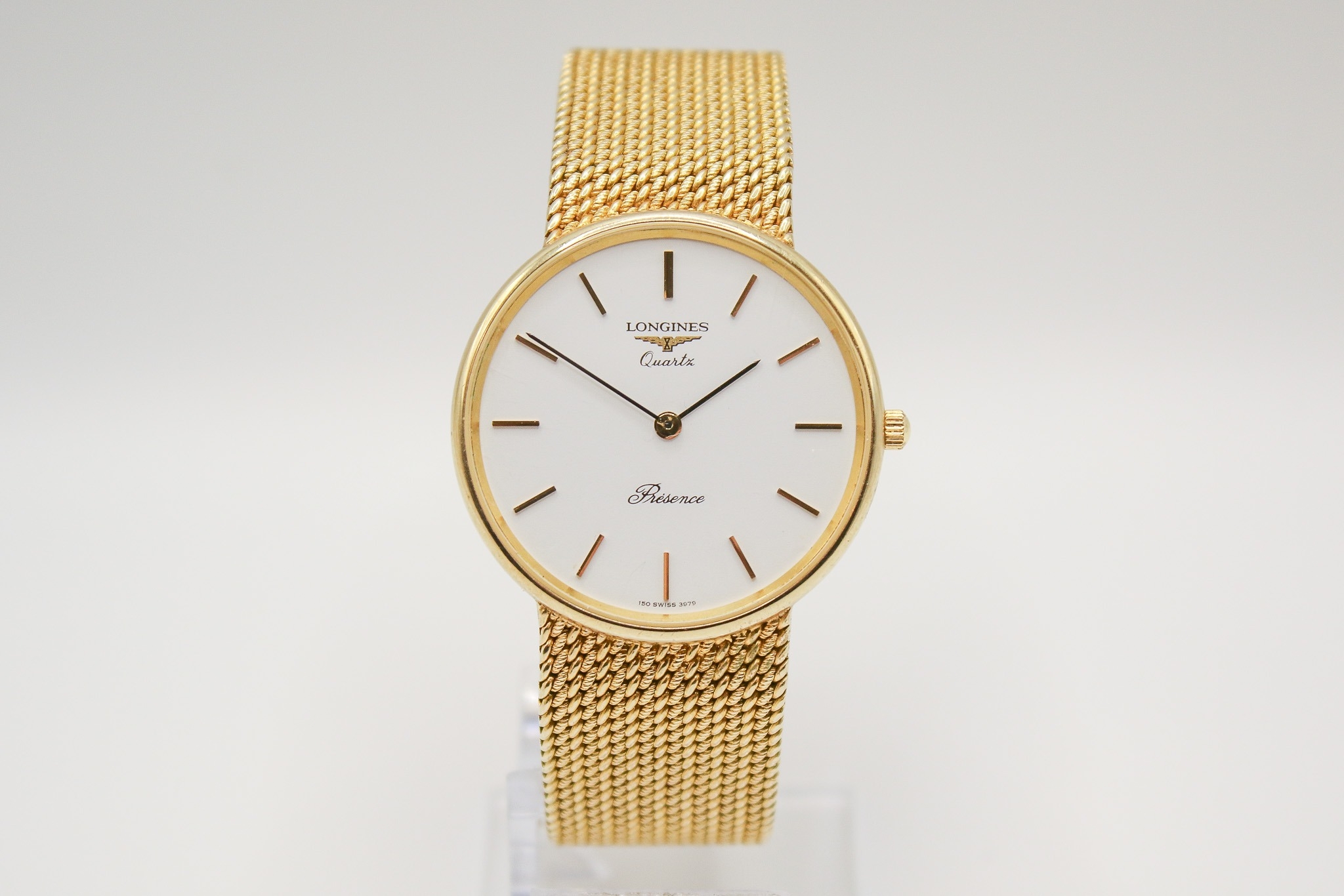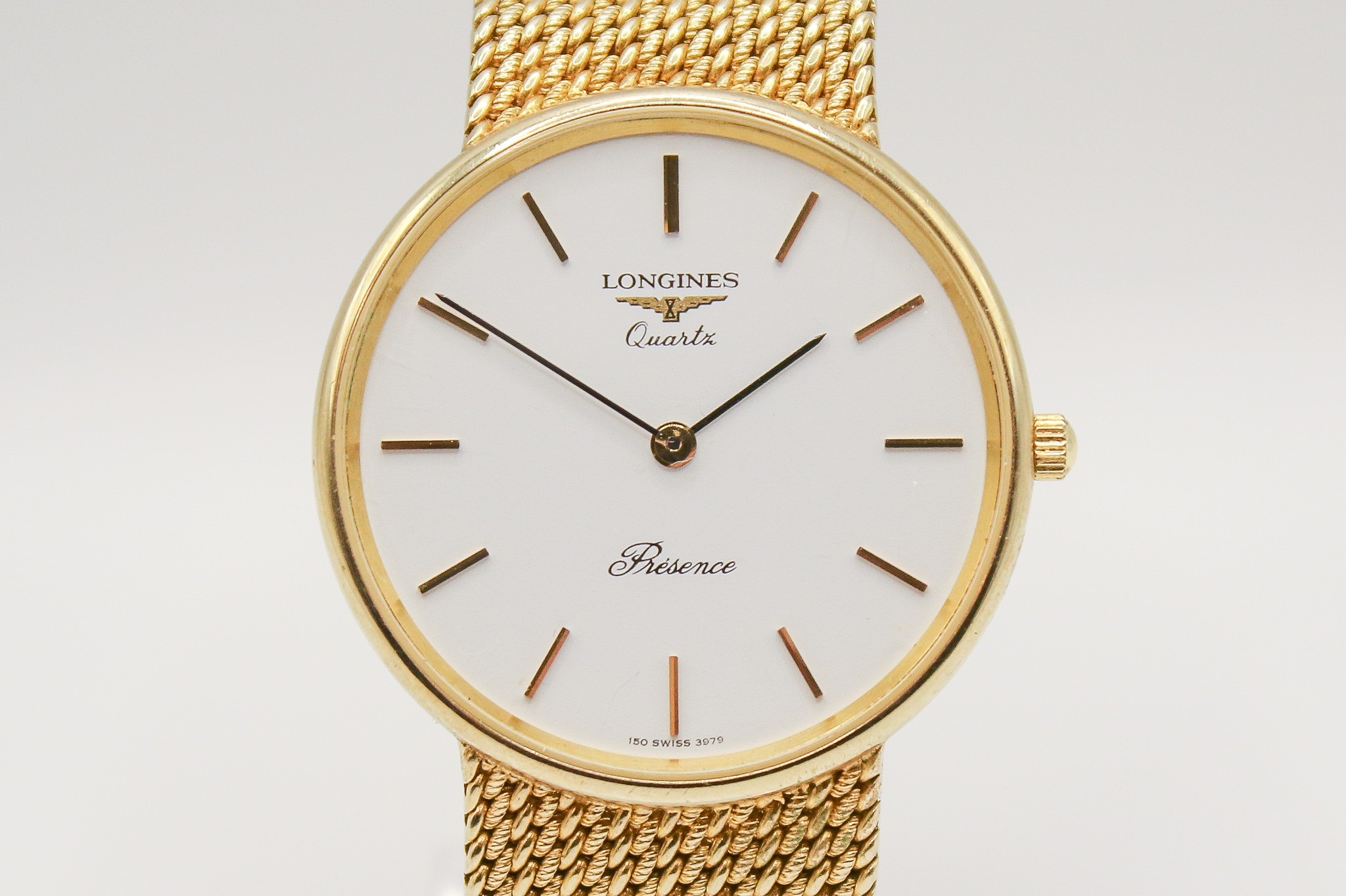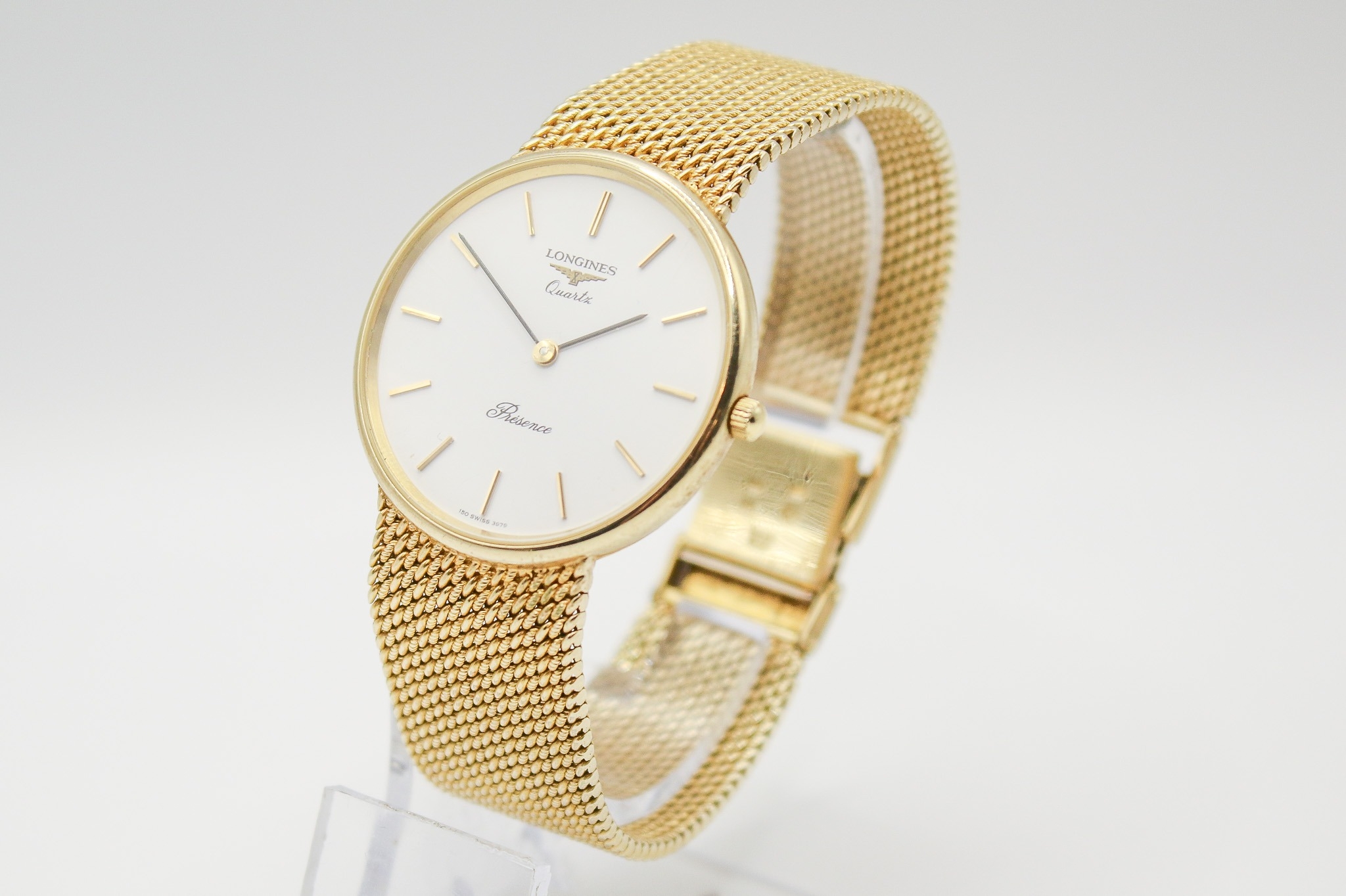 A 9ct gold Longines Presence quartz wristwatch. Model 35002, with gilt markers to the white face, marked 150 Swiss 3979, hallmarked and numbered 25.193.893 to back of case, case diameter 3.2cm, on a short 9ct gold mesh strap, total L18cm, hallmarked to clasp, total gross weight 42.3g, with box, pamphlet and certificate card.