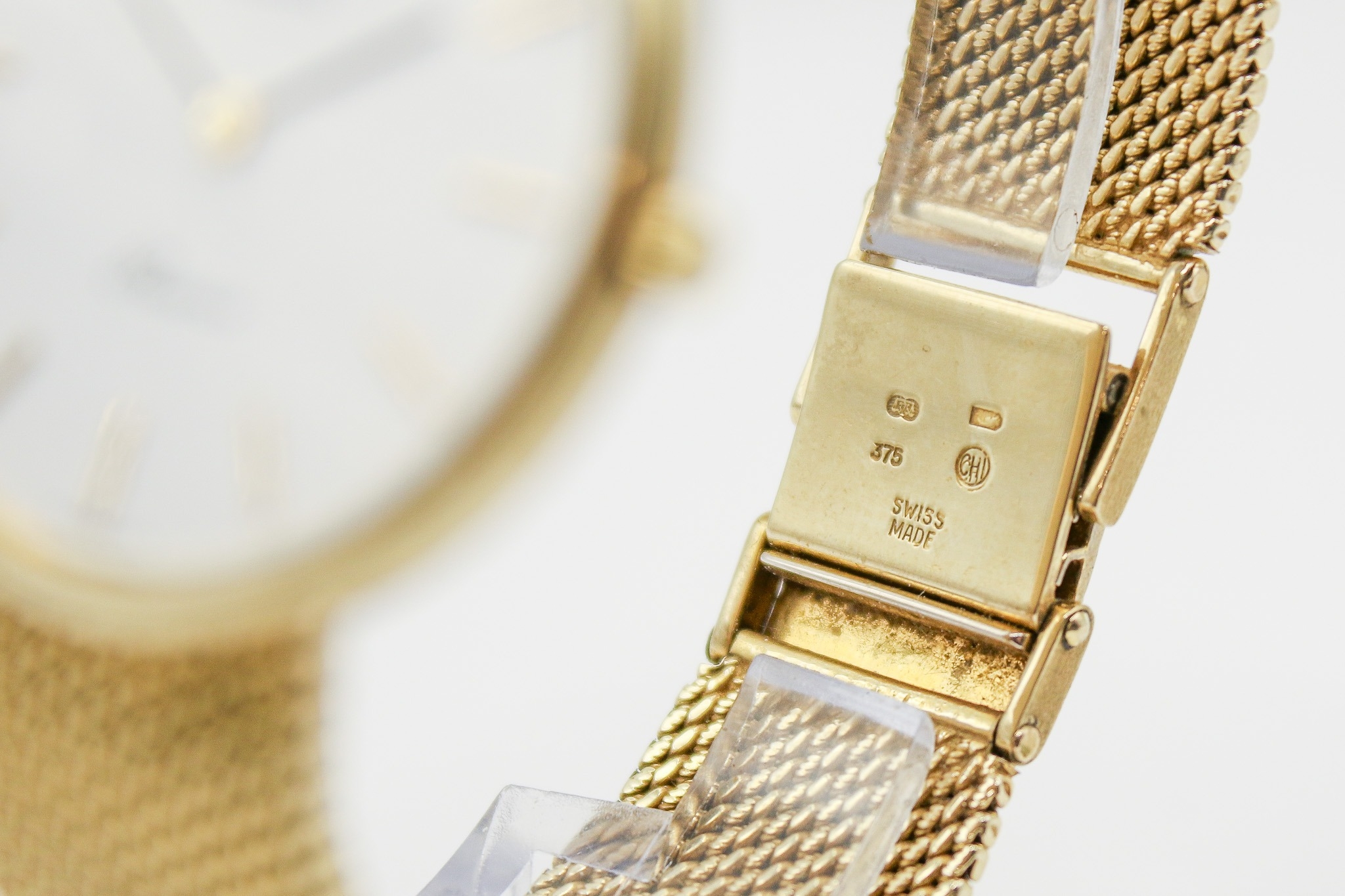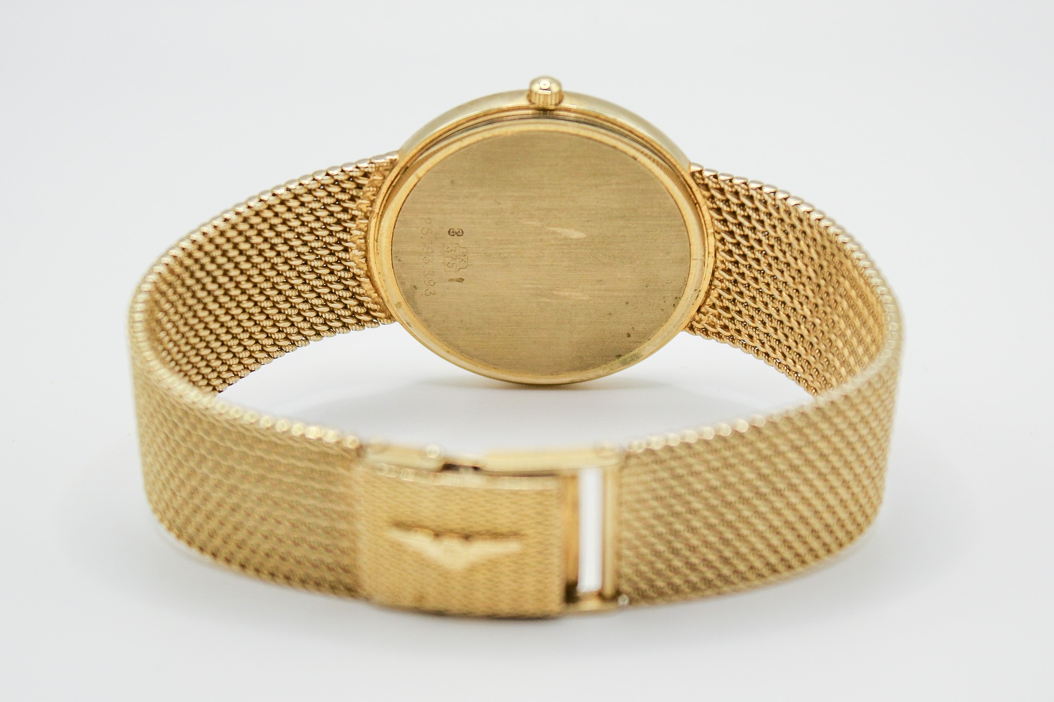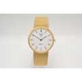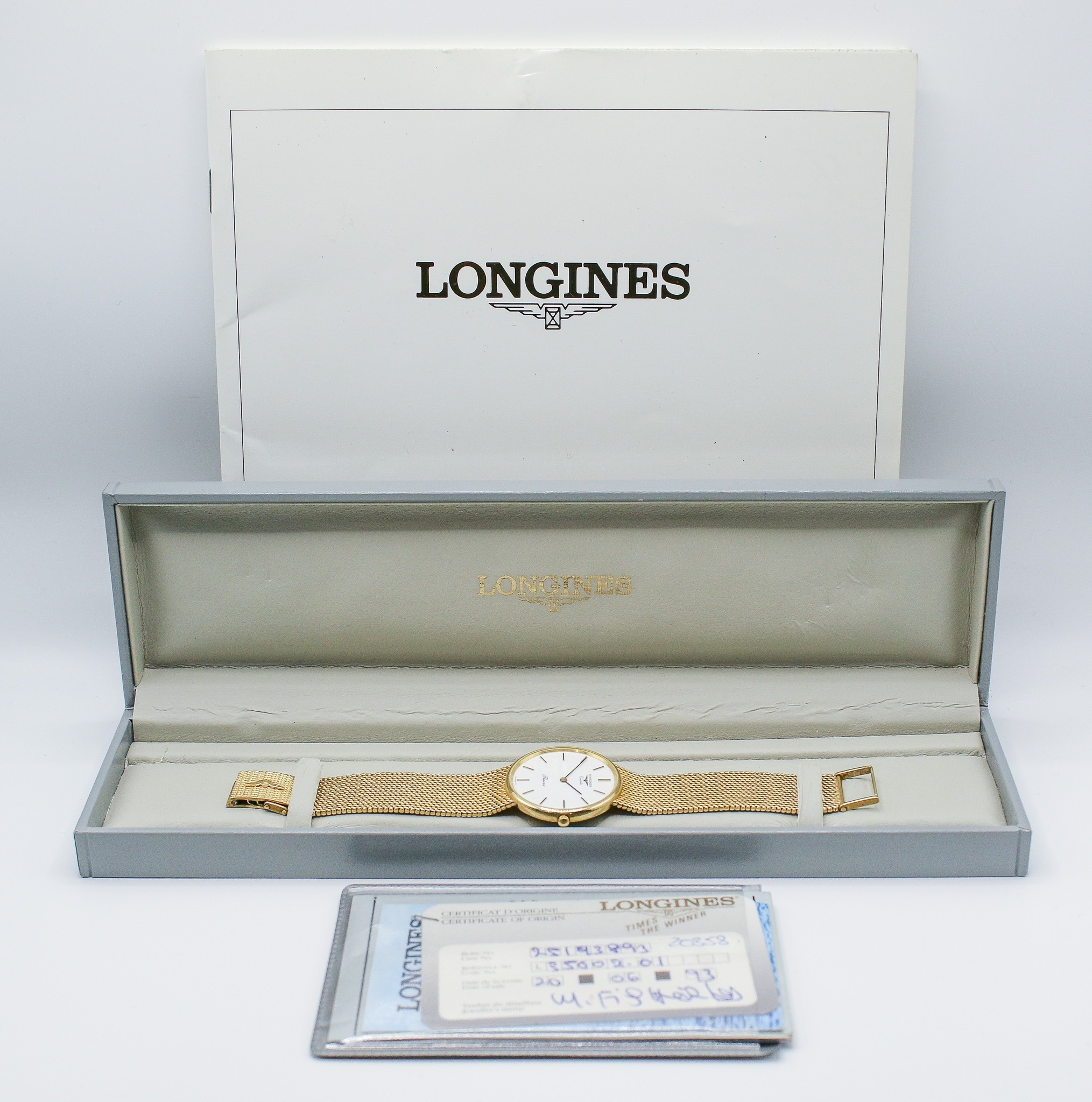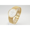 A 9ct gold Longines Presence quartz wristwatch. Model 35002, with gilt markers to the white face, marked 150 Swiss 3979, hallmarked and numbered 25.193.893 to back of case, case diameter 3.2cm, on a short 9ct gold mesh strap, total L18cm, hallmarked to clasp, total gross weight 42.3g, with box, pamphlet and certificate card.