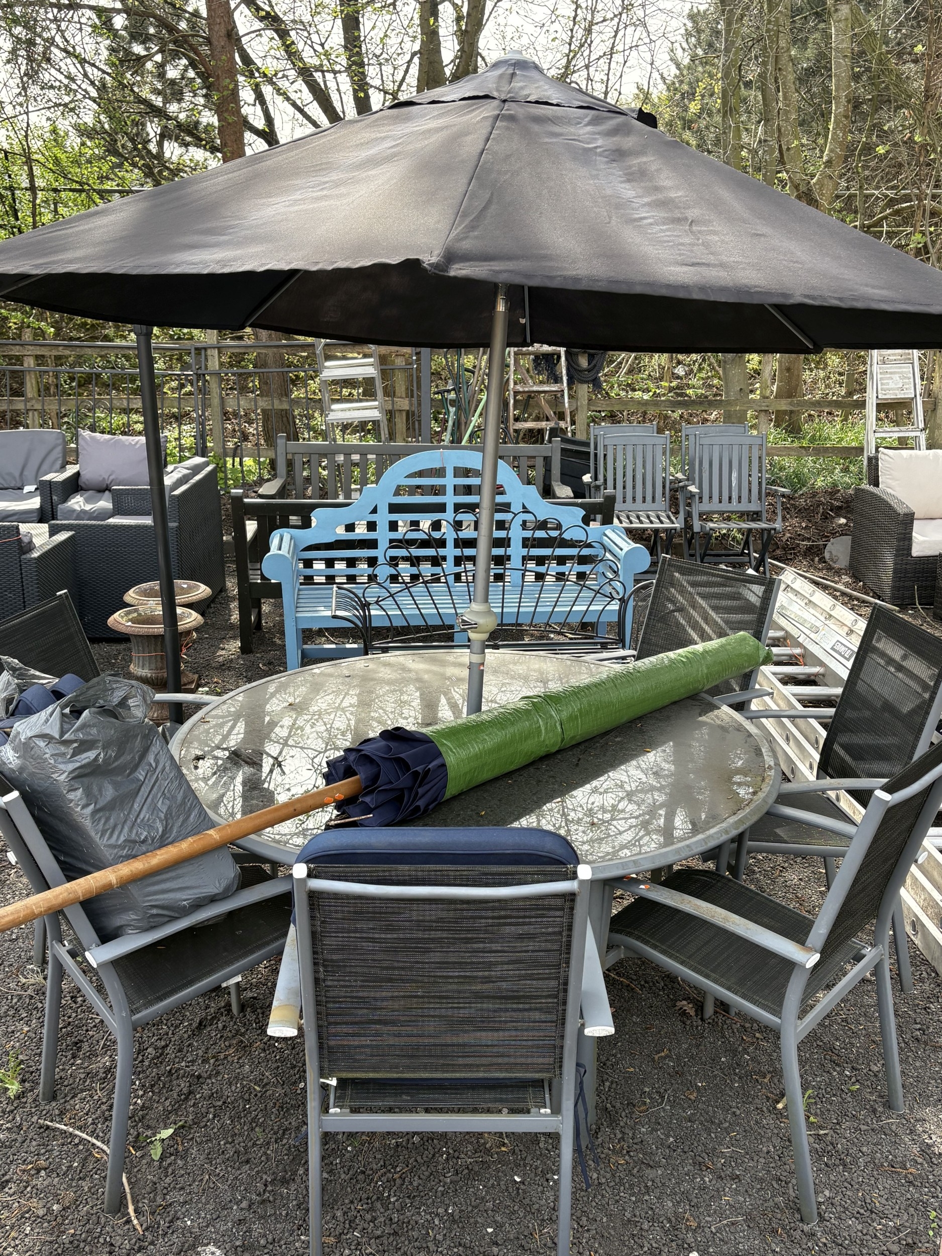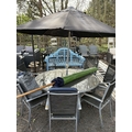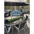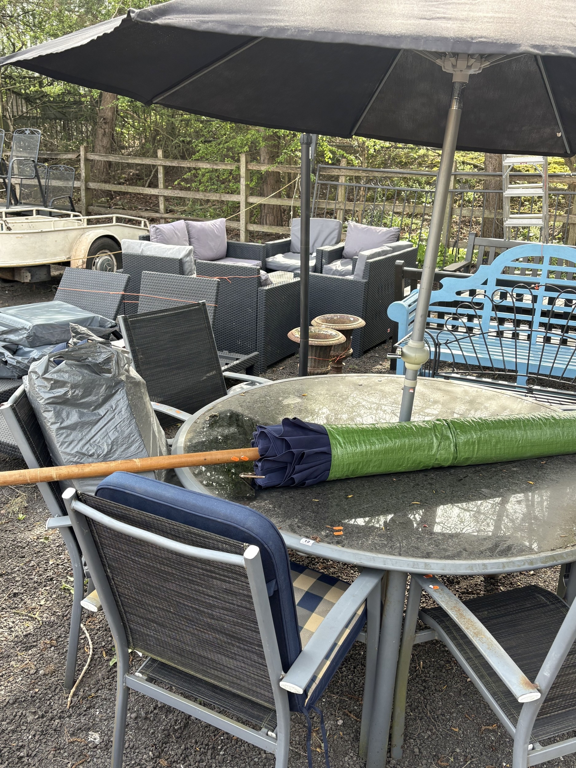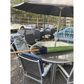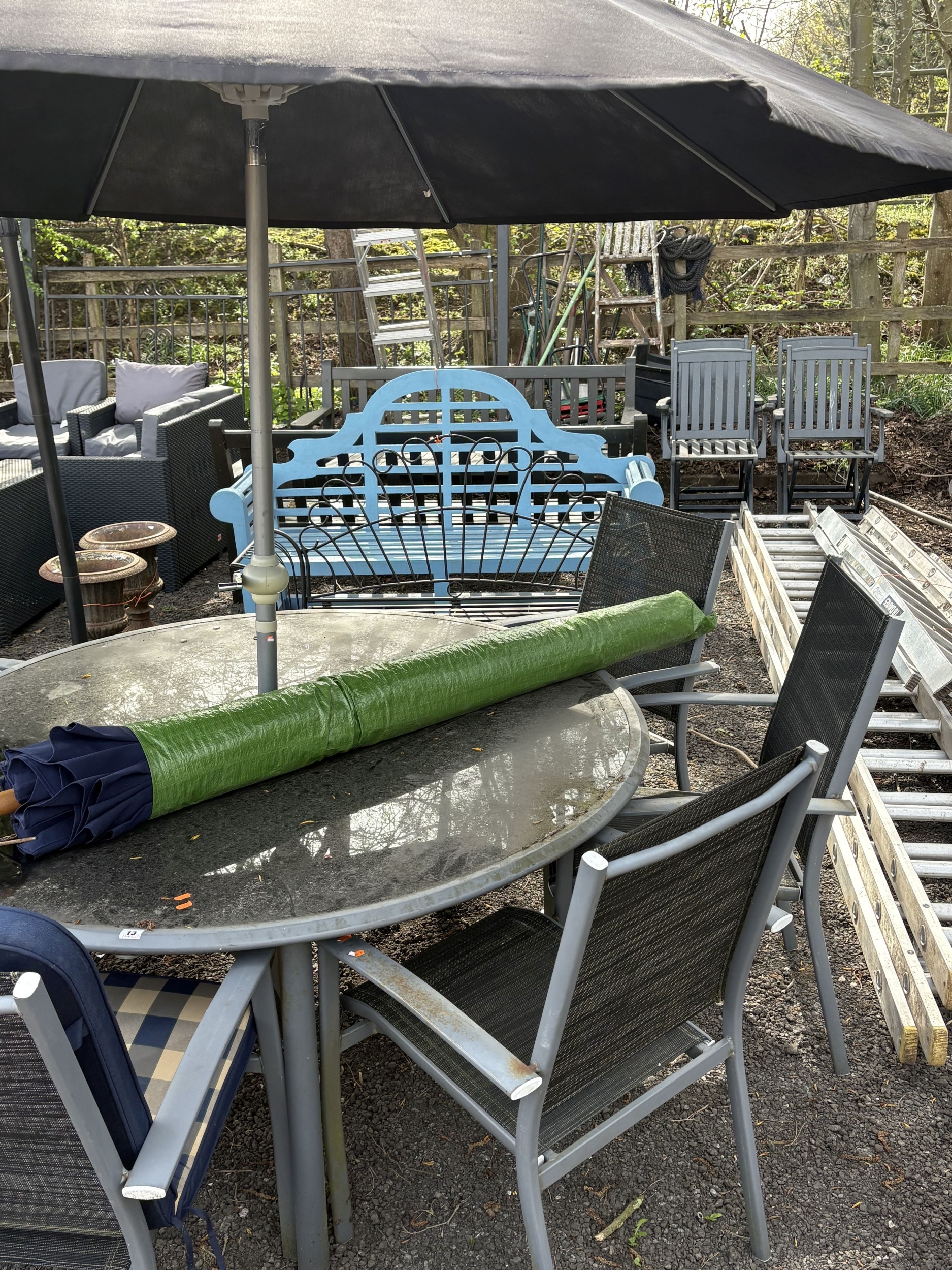 A METAL AND GLASS CIRCULAR GARDEN TABLE, diameter 152cm, height 68cm, six stackable armchairs with loose cushions, wind-out parasol, and another parasol, condition report: missing a few table bolts, table top losing black colour (9)